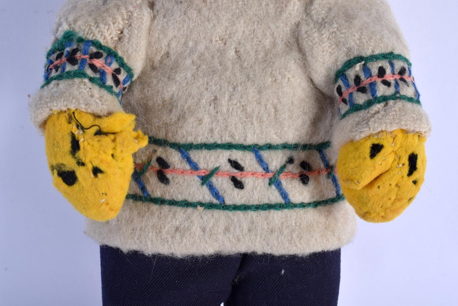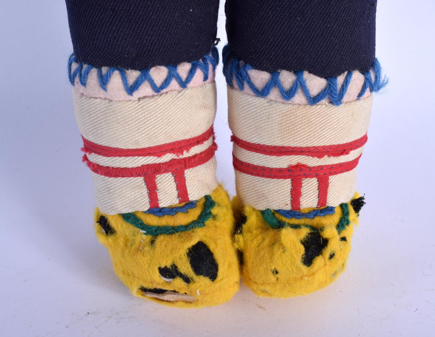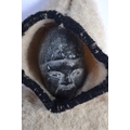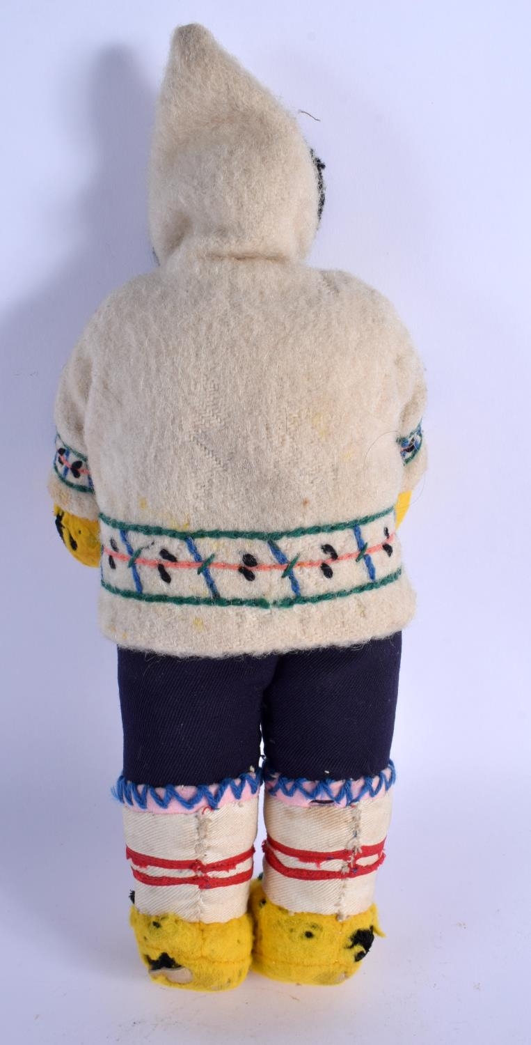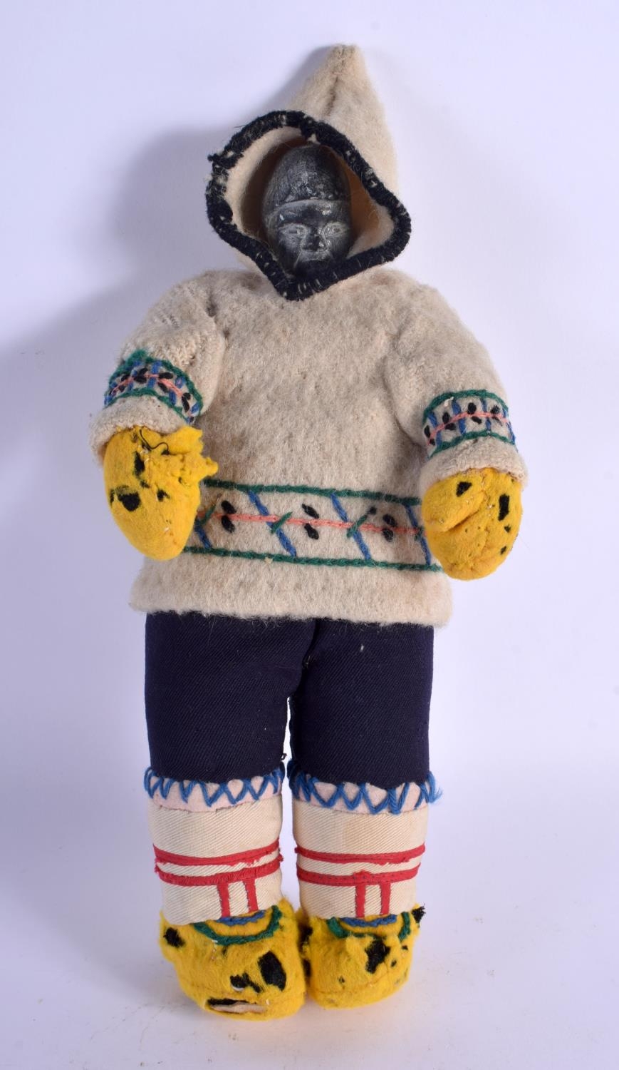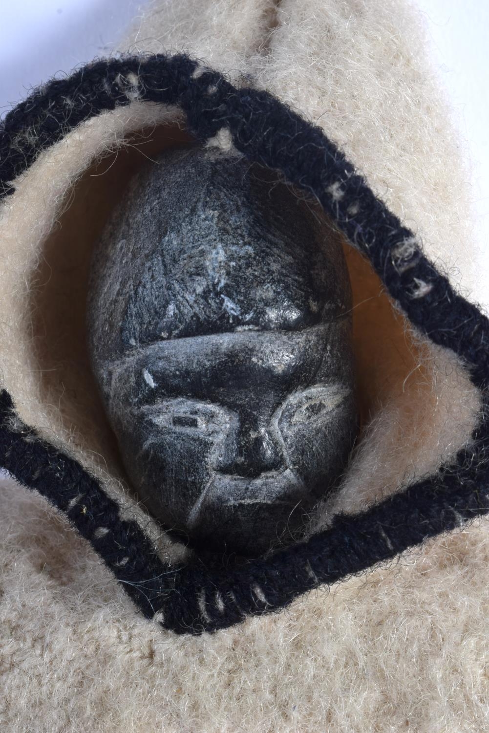 A VERY UNUSUAL EARLY 20TH CENTURY NORTH AMERICAN INUIT STONE HEAD DOLL with original clothing. 27 cm high.