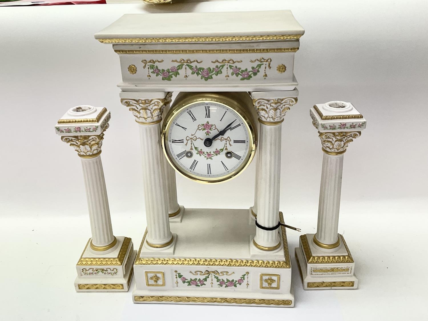 A white porcelain portico clock empress Josephine Germany hermle, working. There is no winding key. The clock is gilded with 24ct gold.