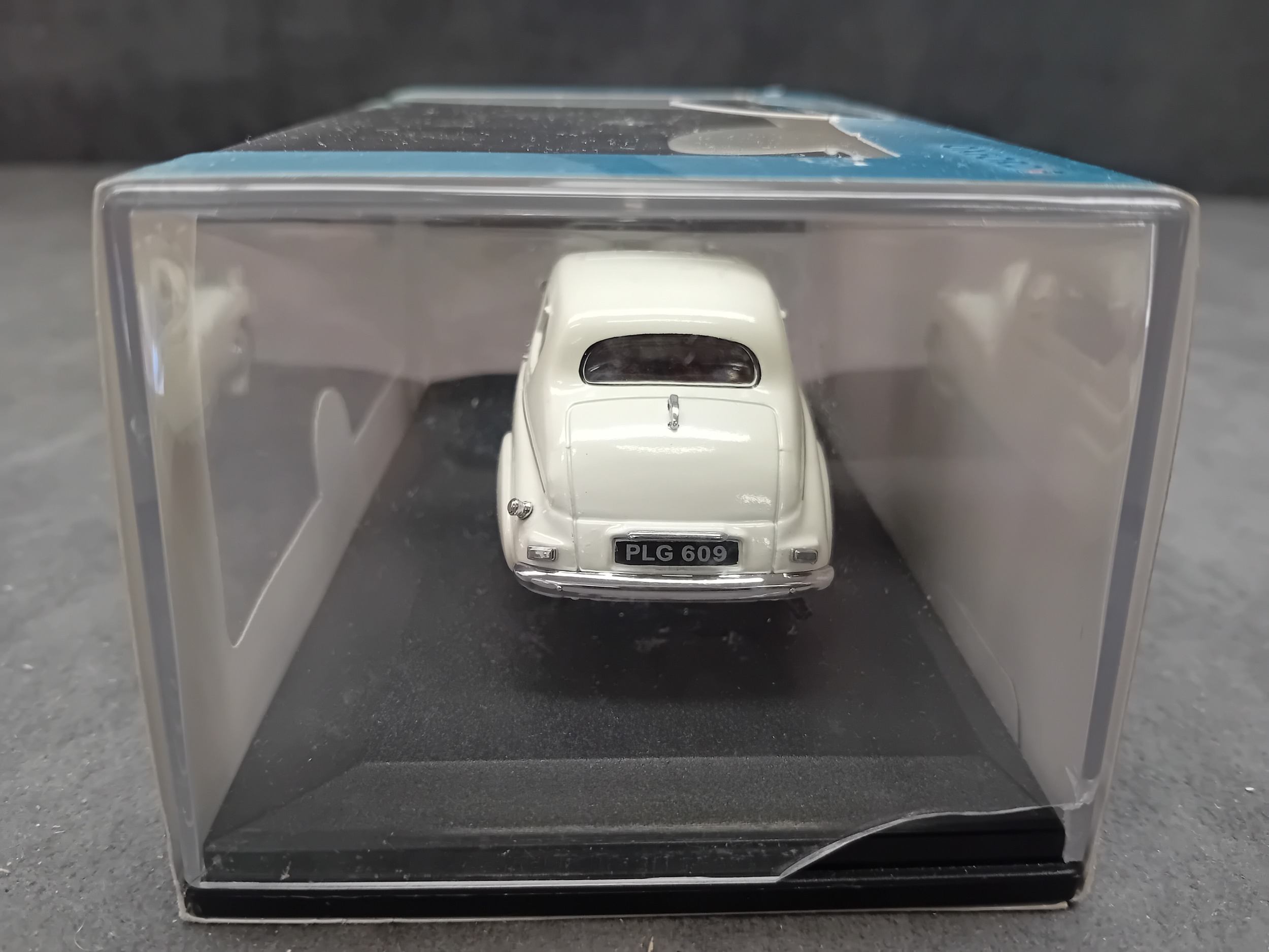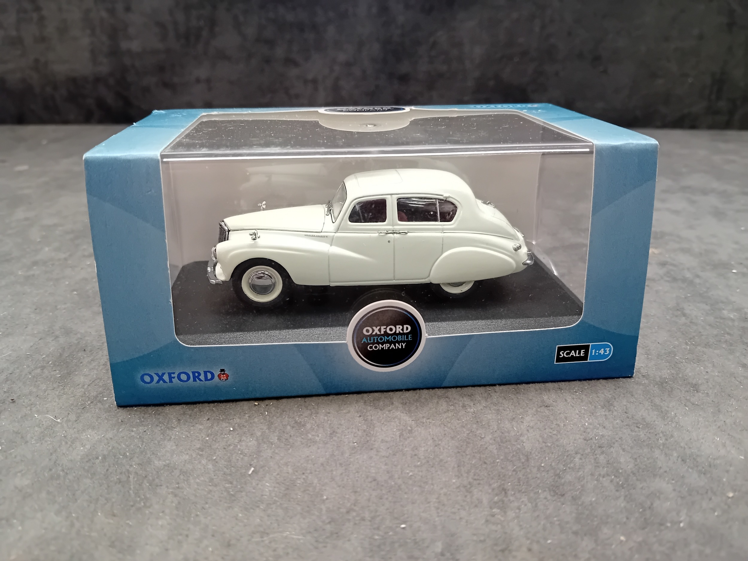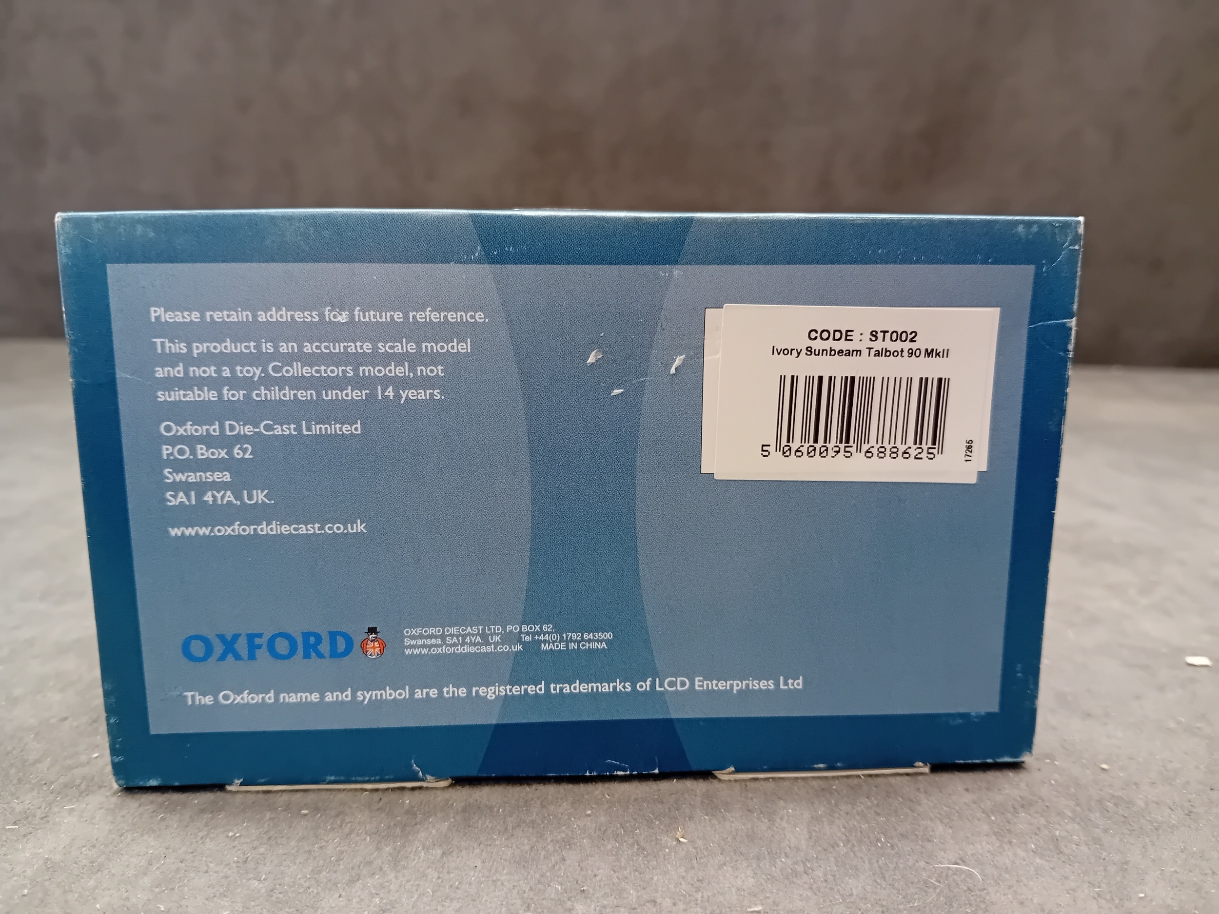 An Oxford Die-Cast 1:43 scale model of an Ivory Sunbeam Talbot 90 MkII, product code ST002. This diecast model car depicts a vintage-style, four-door saloon car in an ivory finish, featuring a detailed front grille, chrome-look bumpers, and a license plate reading "PLG 609". It is presented in its original clear plastic and light blue cardboard packaging, which bears the "OXFORD AUTOMOBILE COMPANY" and "Oxford Die-Cast Limited" branding. The packaging also notes it is a "collectors model, not suitable for children under 14 years" and states "MADE IN CHINA".