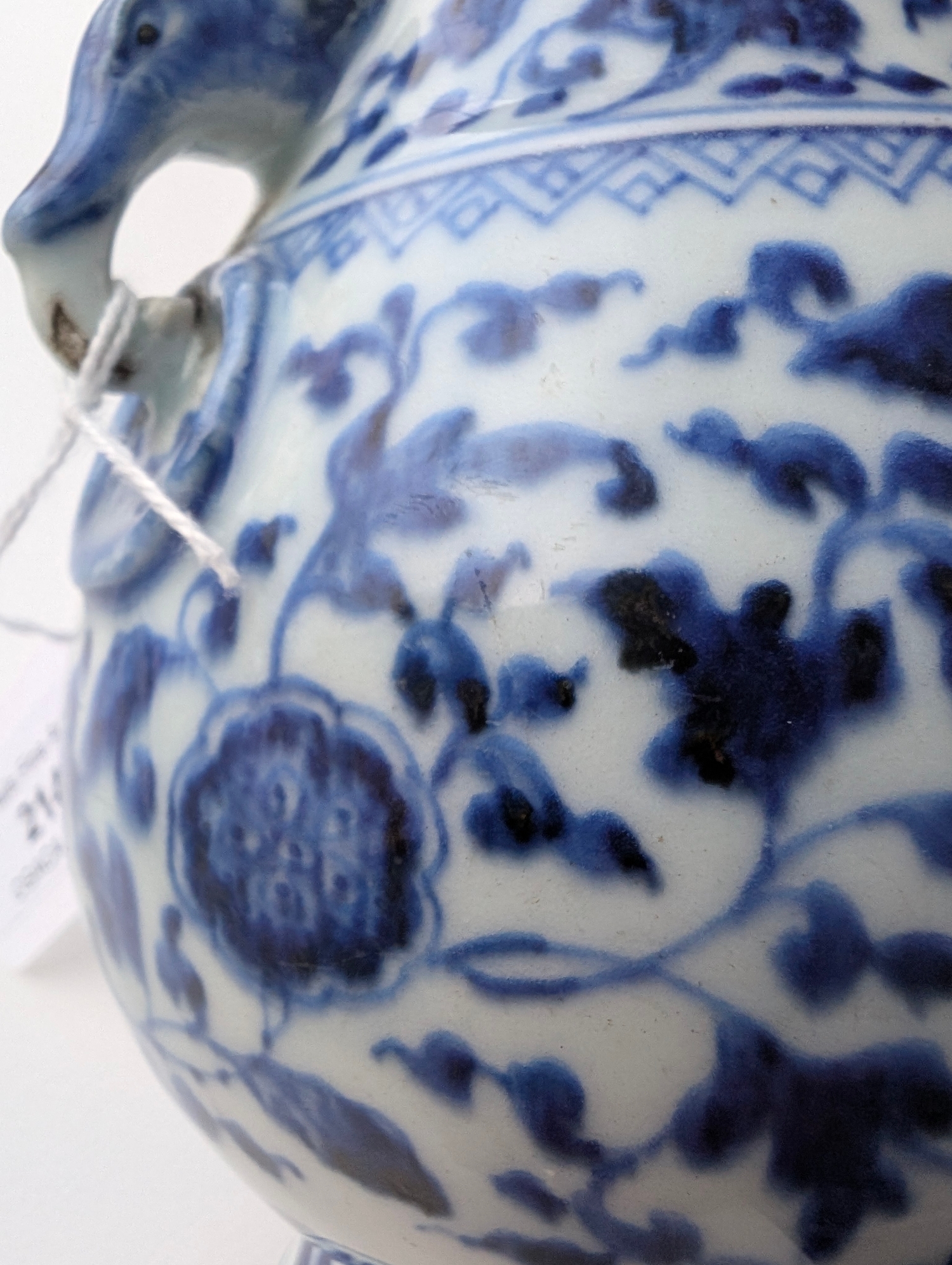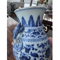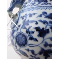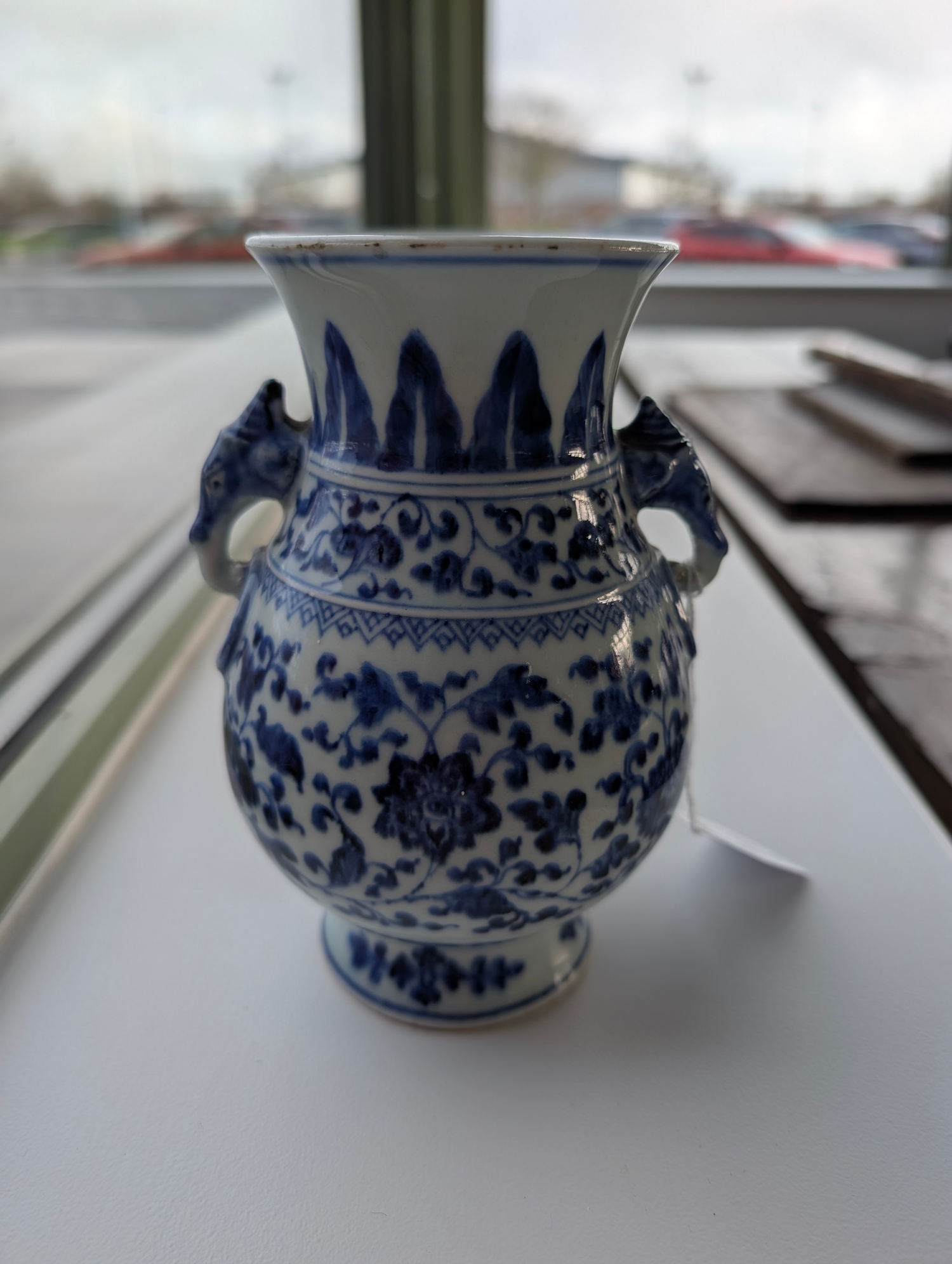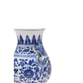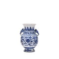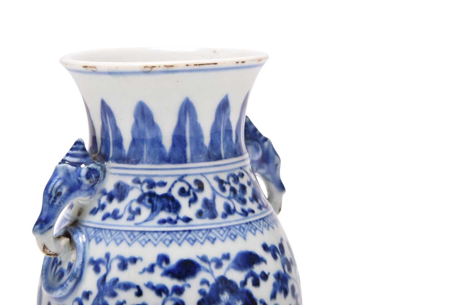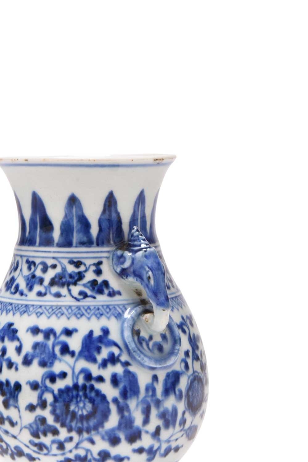 A Chinese blue and white porcelain Hu-form vase 18th century, probably Qianlong Of ovoid form with twin elephant head handles, decorated with a composite floral scroll, a band of stiff banana leaves at the neck, a lappet border at the base above the spreading foot, further decorated with three flower sprays. 16cm high Provenance:Private UK collection, the property of a gentleman.