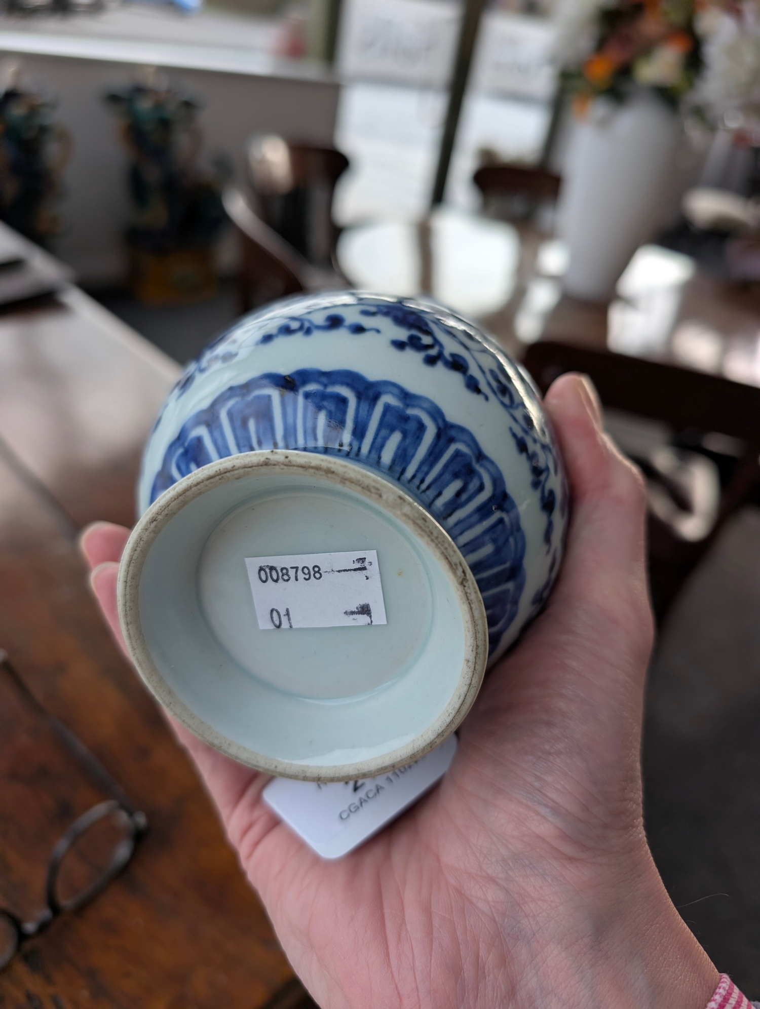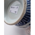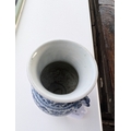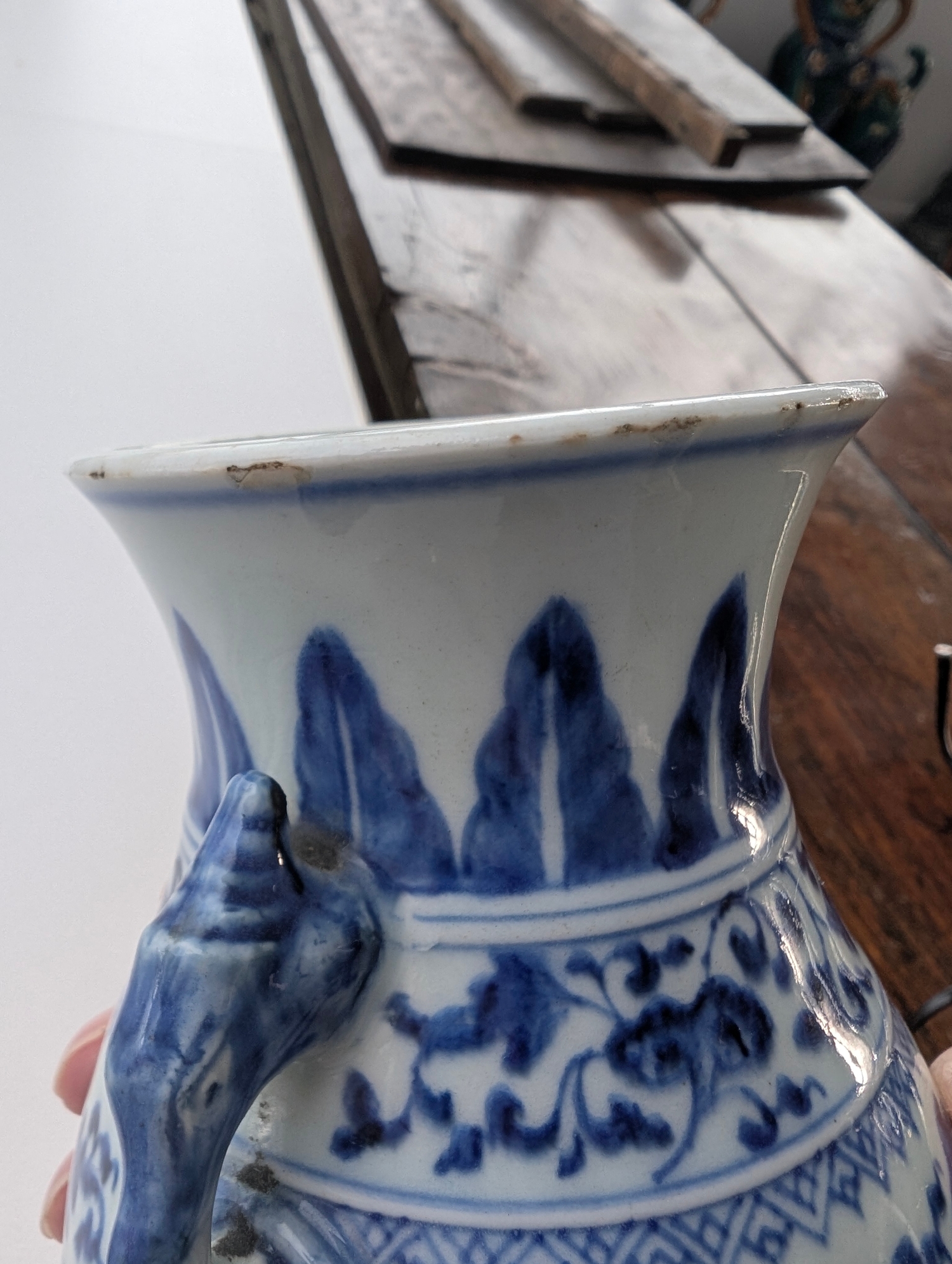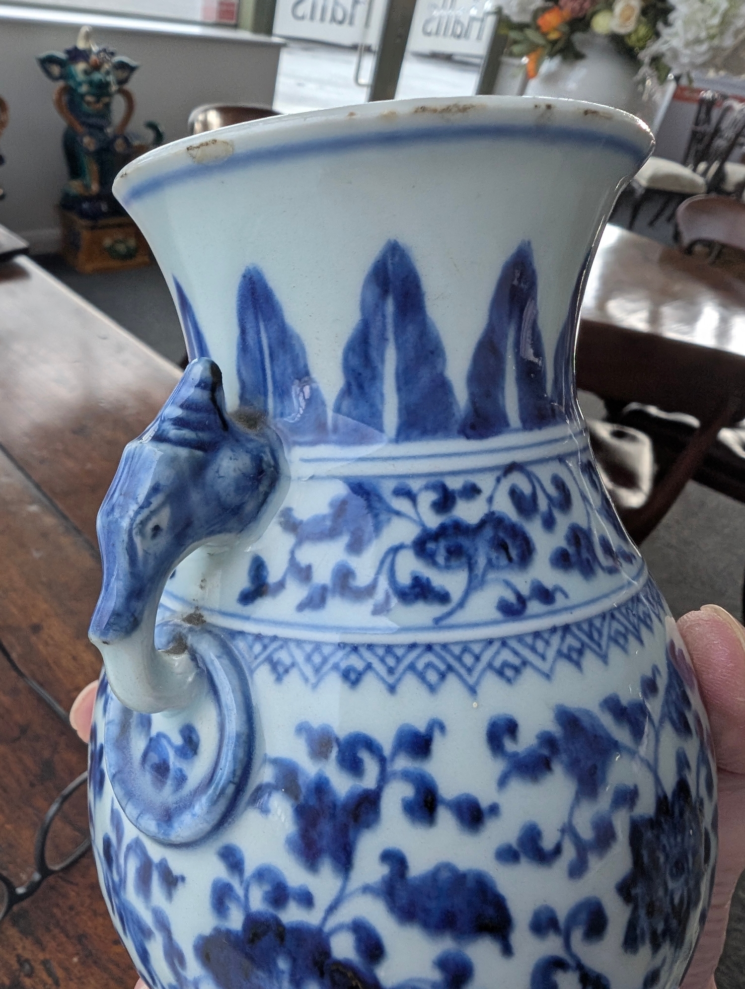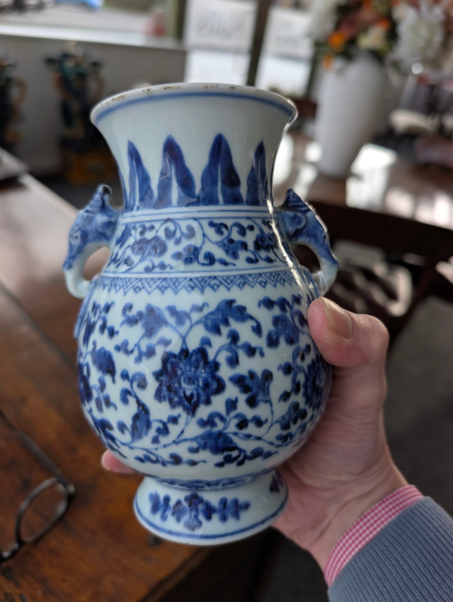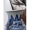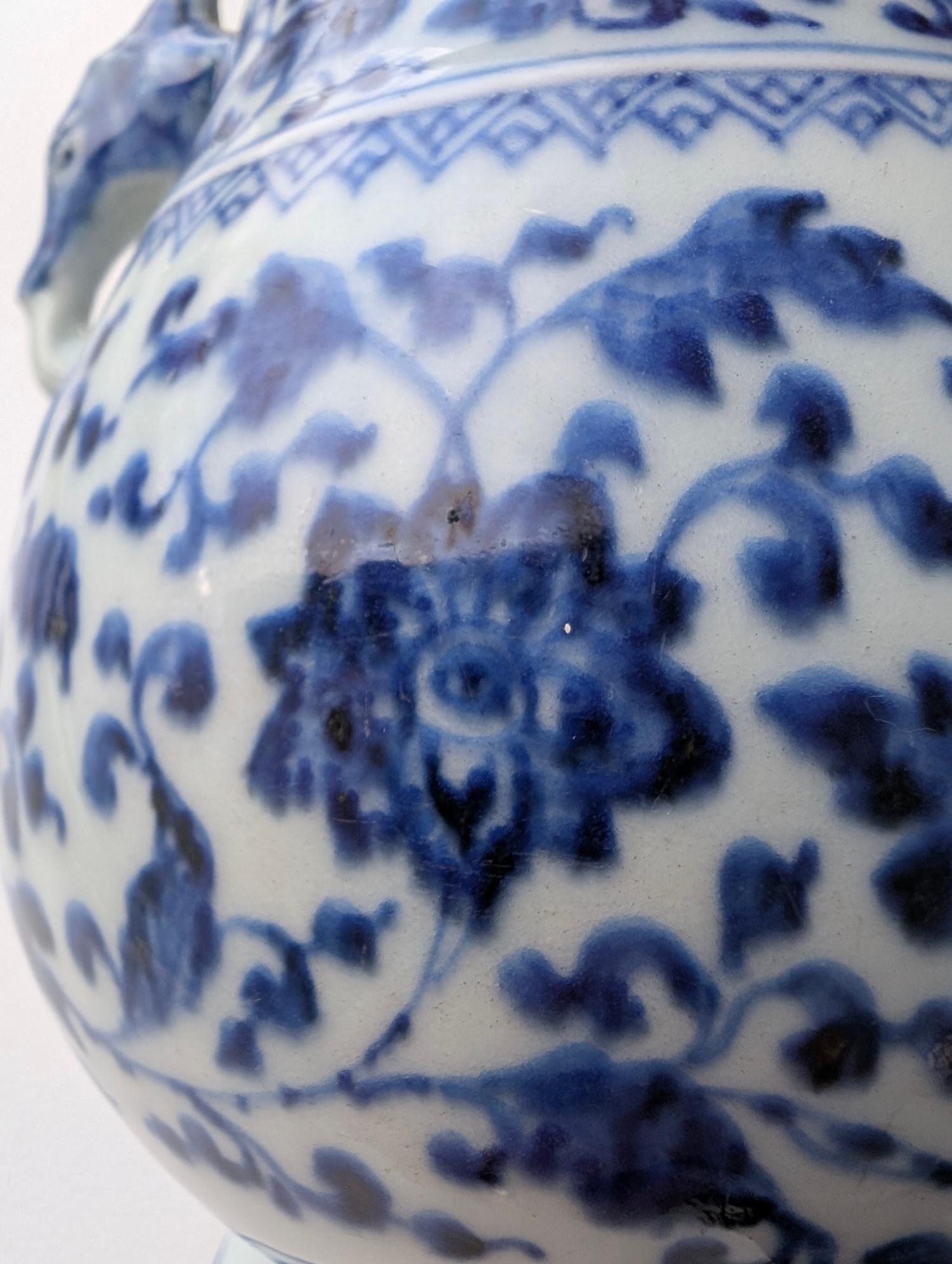 A Chinese blue and white porcelain Hu-form vase 18th century, probably Qianlong Of ovoid form with twin elephant head handles, decorated with a composite floral scroll, a band of stiff banana leaves at the neck, a lappet border at the base above the spreading foot, further decorated with three flower sprays. 16cm high Provenance:Private UK collection, the property of a gentleman.
