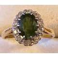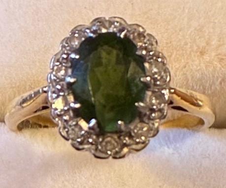 18 carat gold emerald and diamond ring, the central cushion cut emerald surrounded by ten diamonds, gross weight 3.76 grams.
