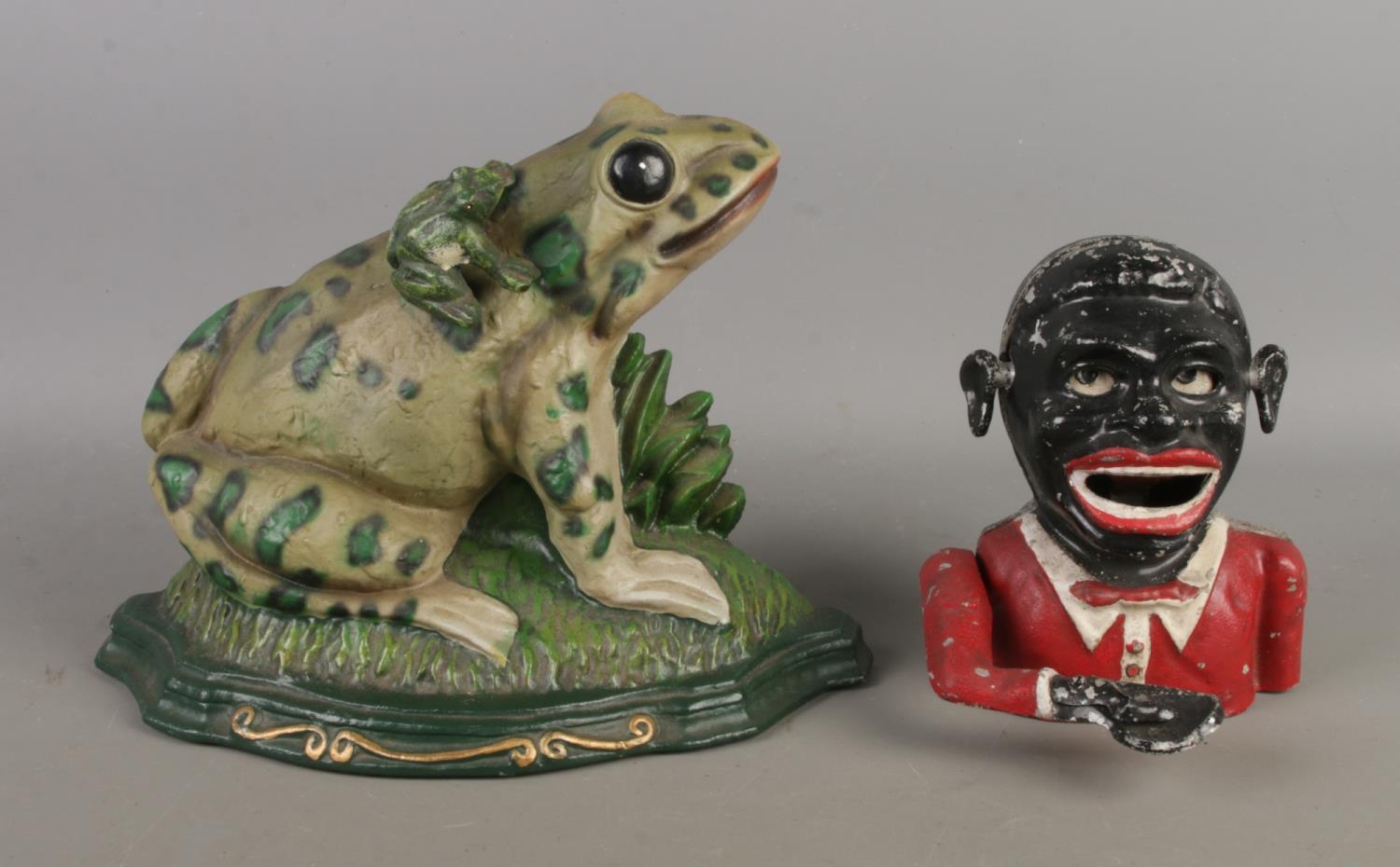 A cast iron door stop formed as a frog, together with a novelty money box bearing Starkie's Patent 32537.