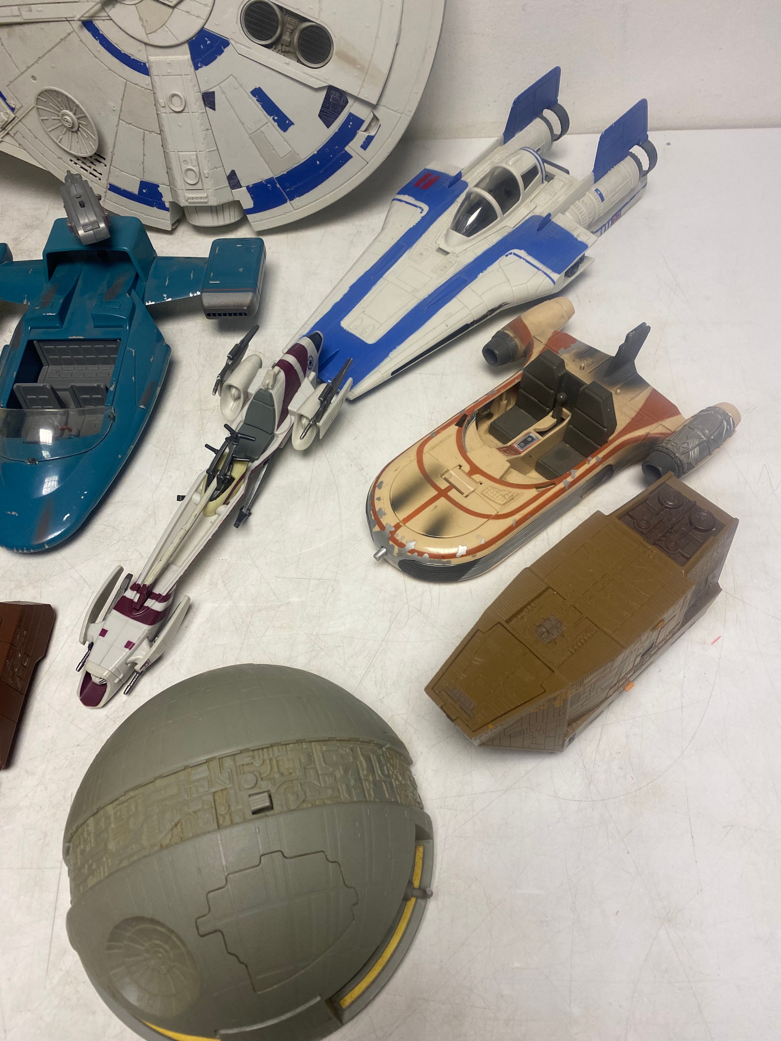 A Collection of Various Star Wars Vehicles including, Millennium Falcon, Speeder Bikes, Jawa Sandcrawler, Rebel Alliance A-Wing, Landspeeders and Micro Machines Death Star Playset