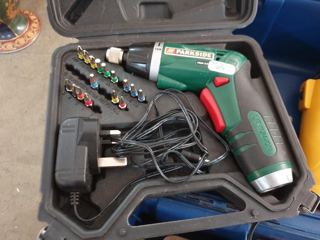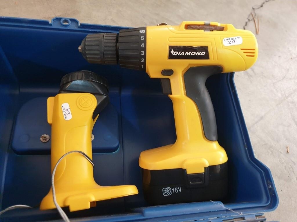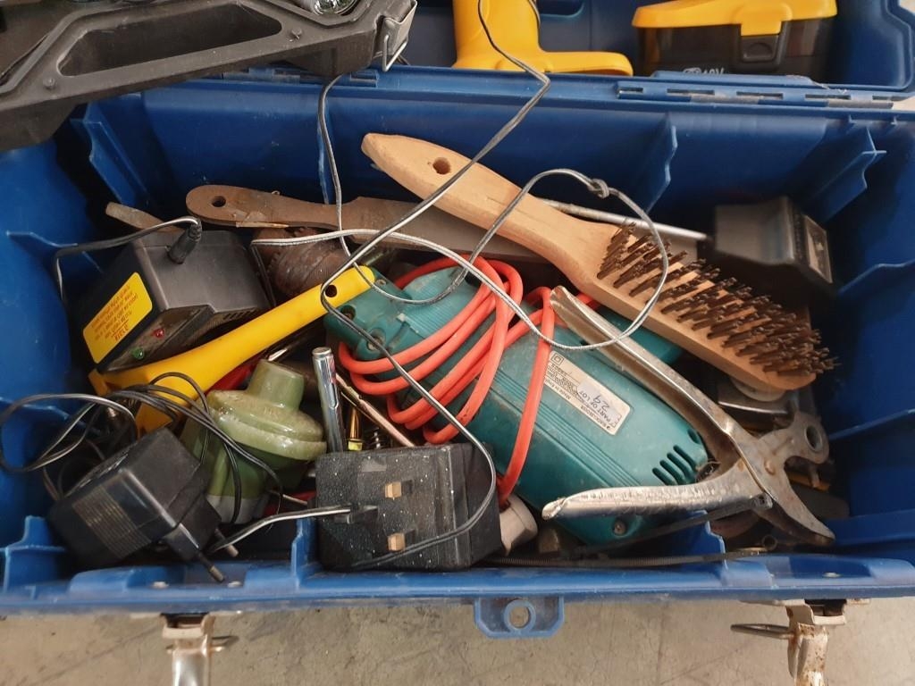 Tool Box with Diamond 18V Cordless Drill, Black & Decker Drill, Parkside Electric Screw Driver & Other Hand Tools