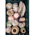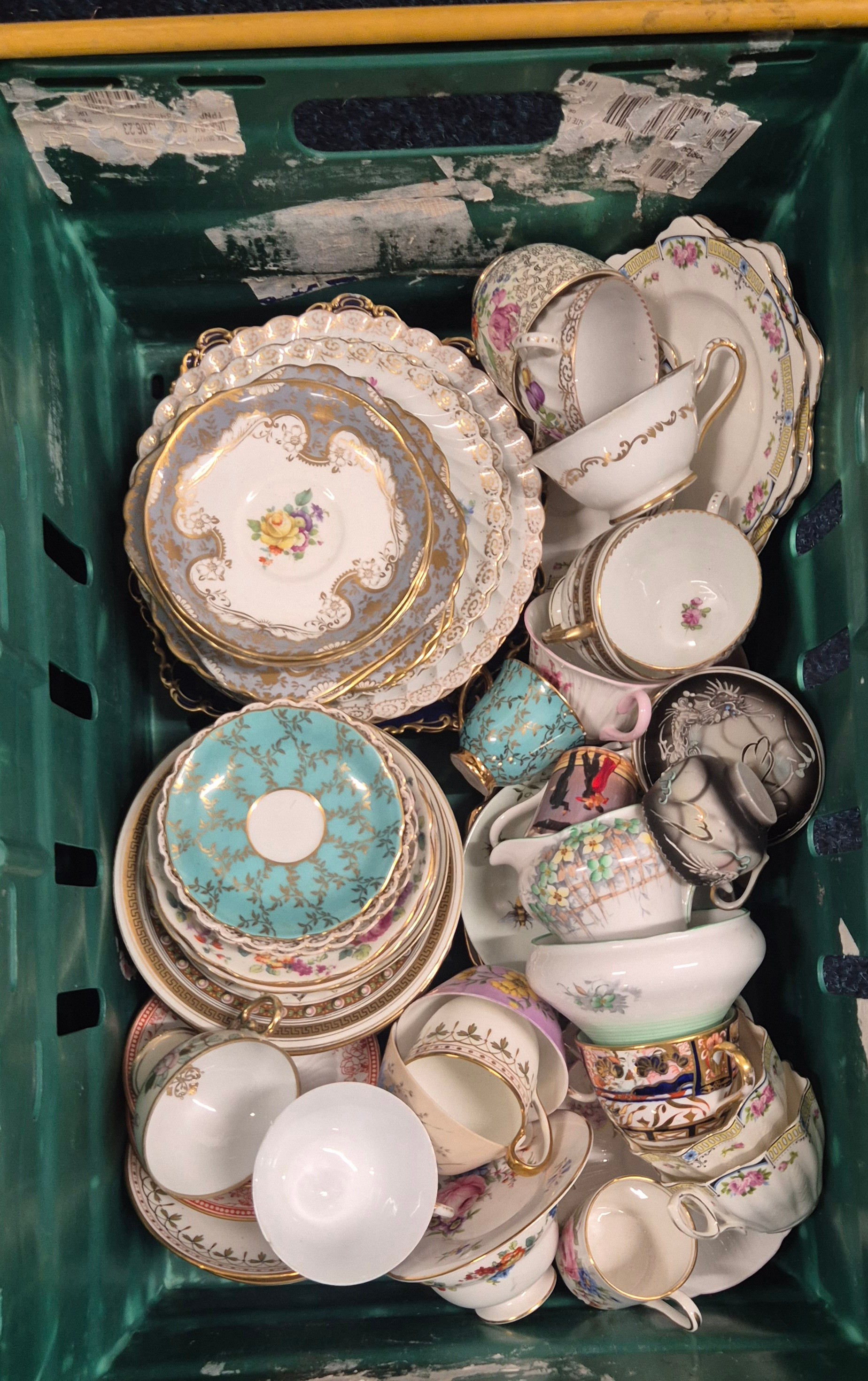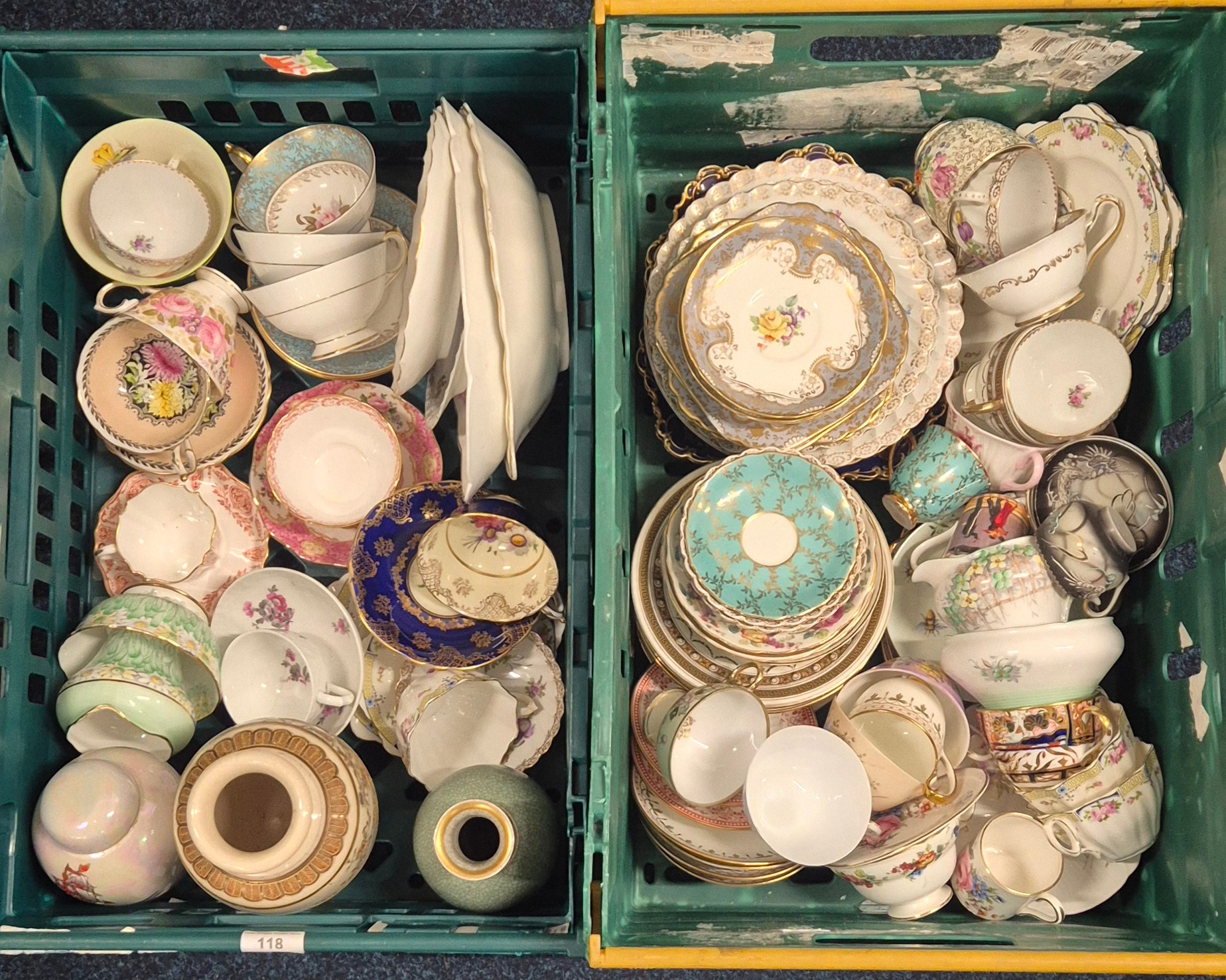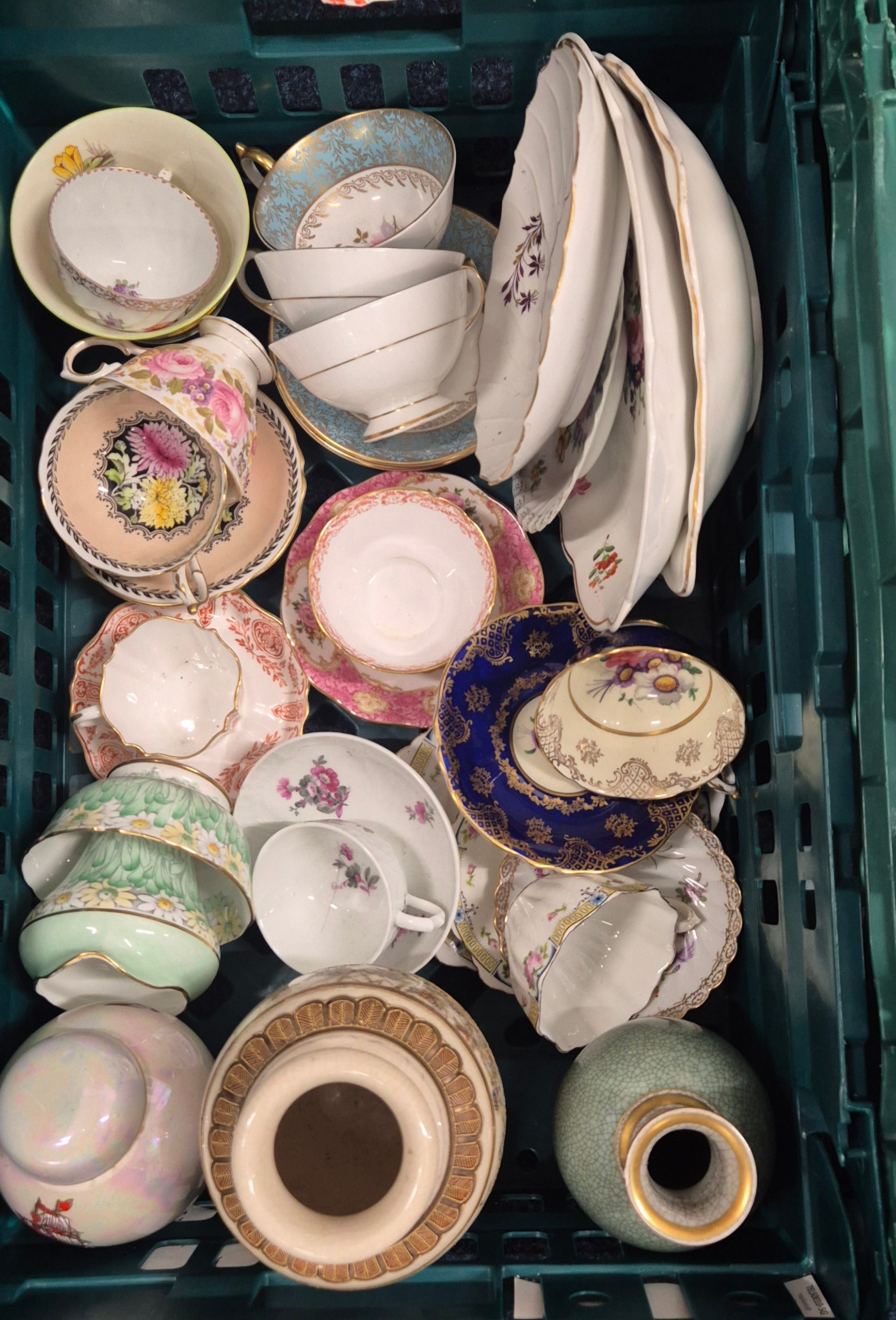 Two Crates Of Collectables; Dresden Tea Wares, 18th Century Worcester Flight Plate, Royal Copenhagen Vase, Crown Devon D.Cole Ship Jar, Paragon Tea Ware, Royal Crown Derby Sugar Bowl Along With Others.