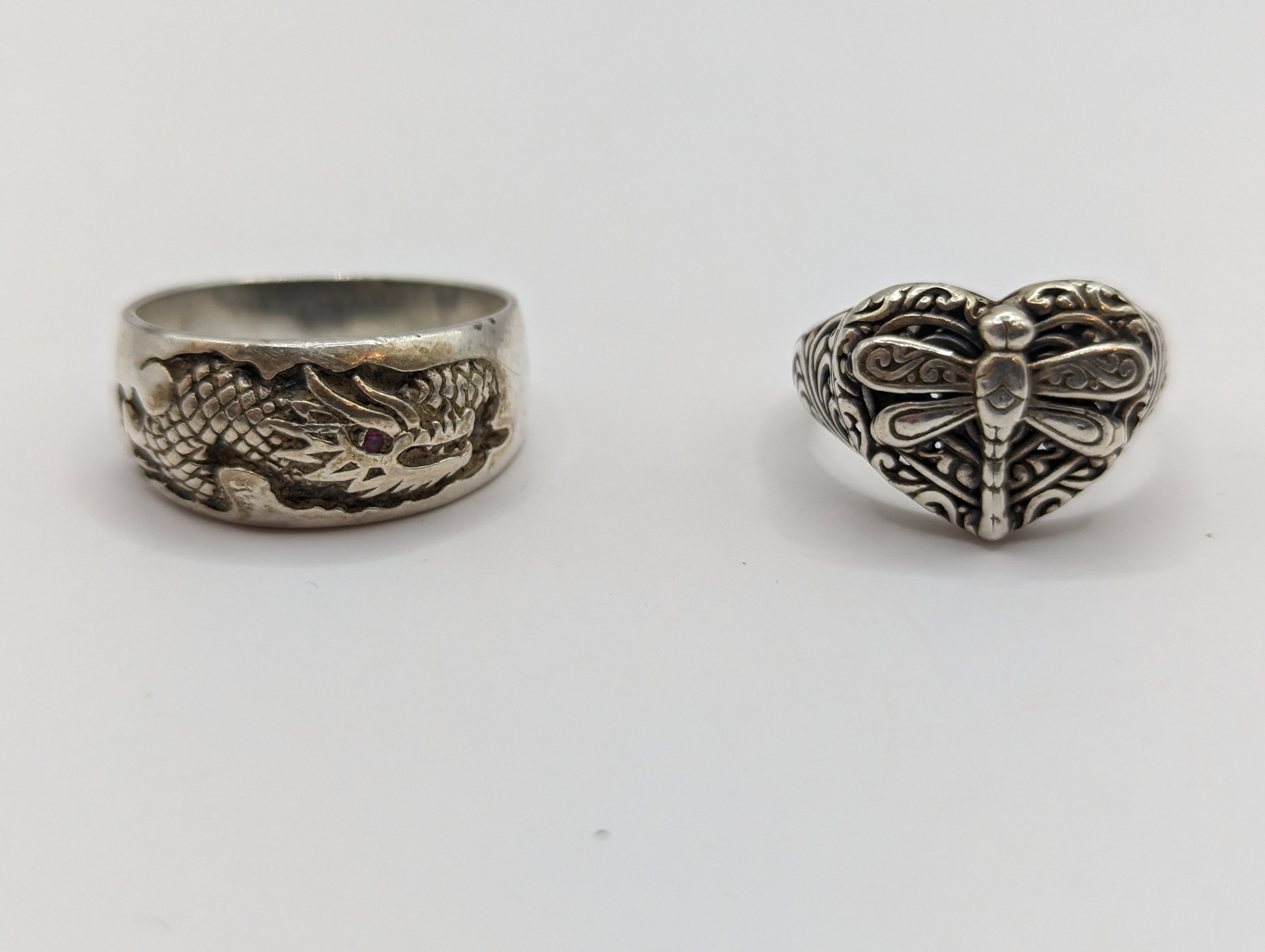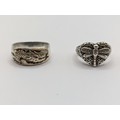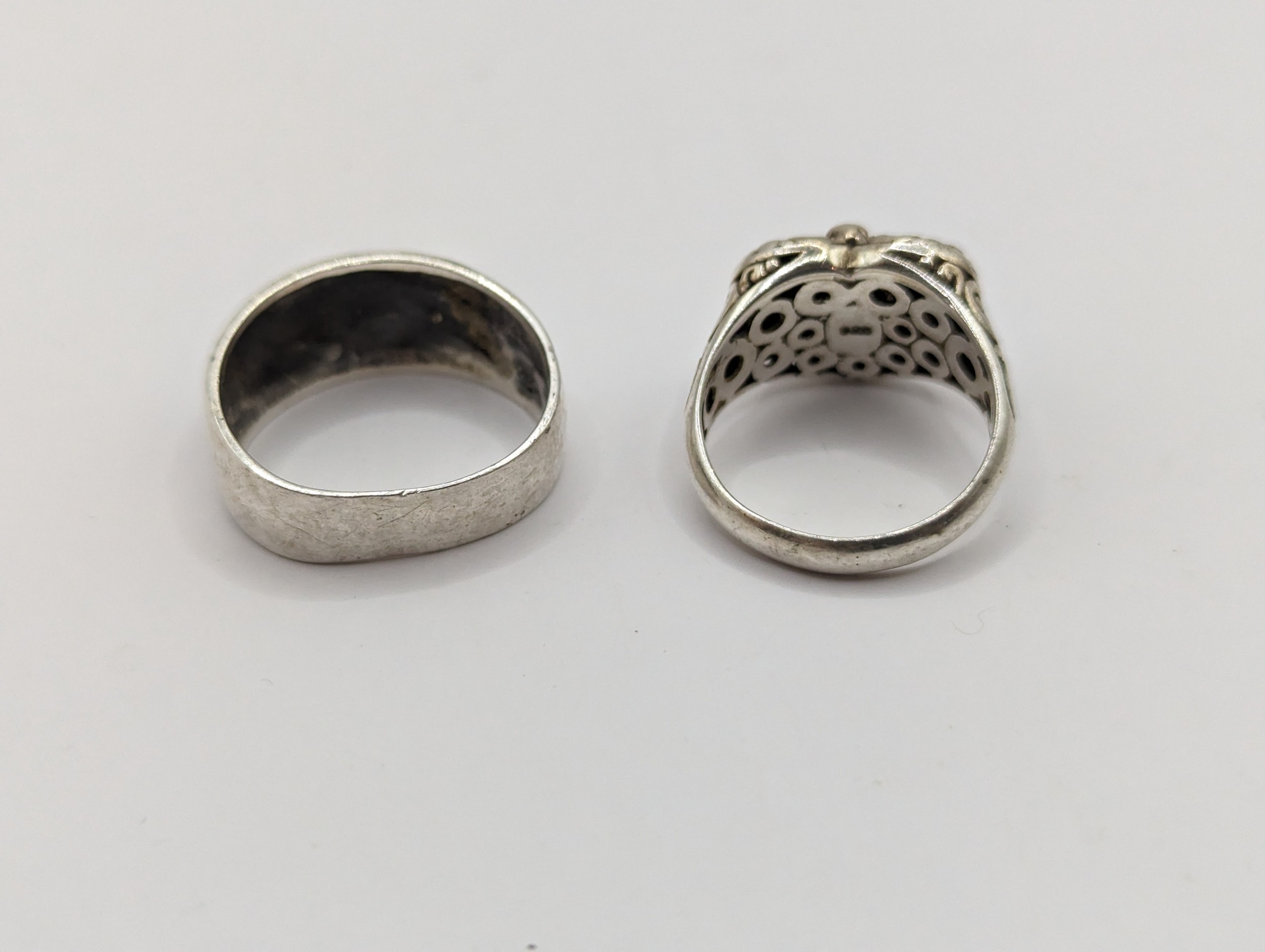 Four pieces of 925 silver jewellery, including two neck chains and two rings (size S & W respectively), gross weight 45.5 grams