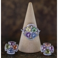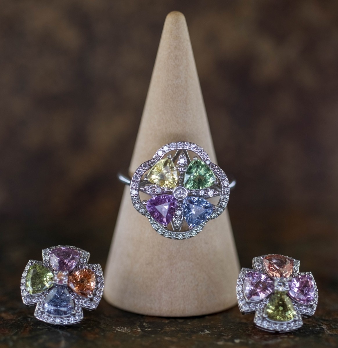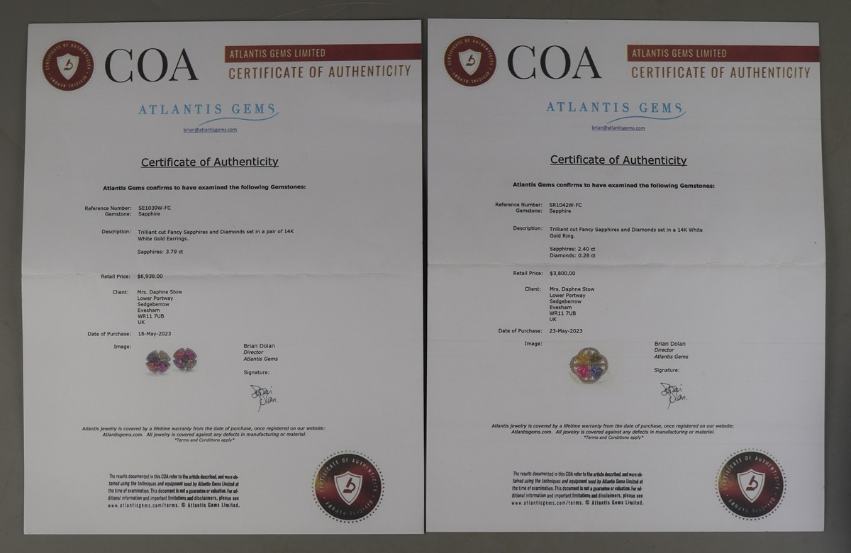 Fine 14ct white gold multi coloured sapphire and diamond ring together with matching earrings with original receipts