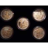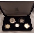 Comprising a five pound coin, two pound coin x2, one pound coin and fifty pence piece, in protective capsules and fitted leather box, complete with certificate of authenticity.