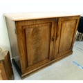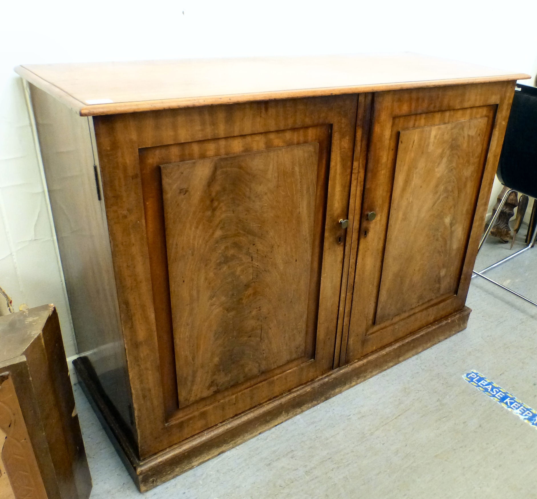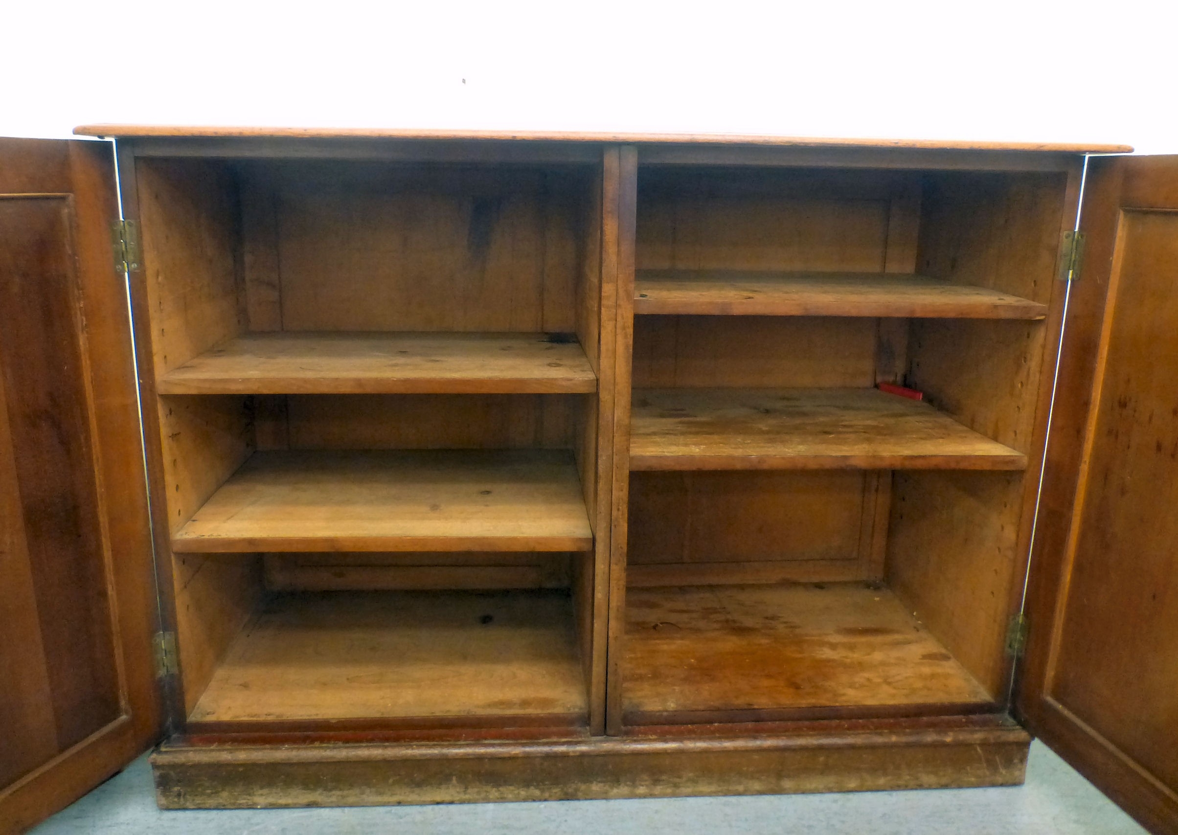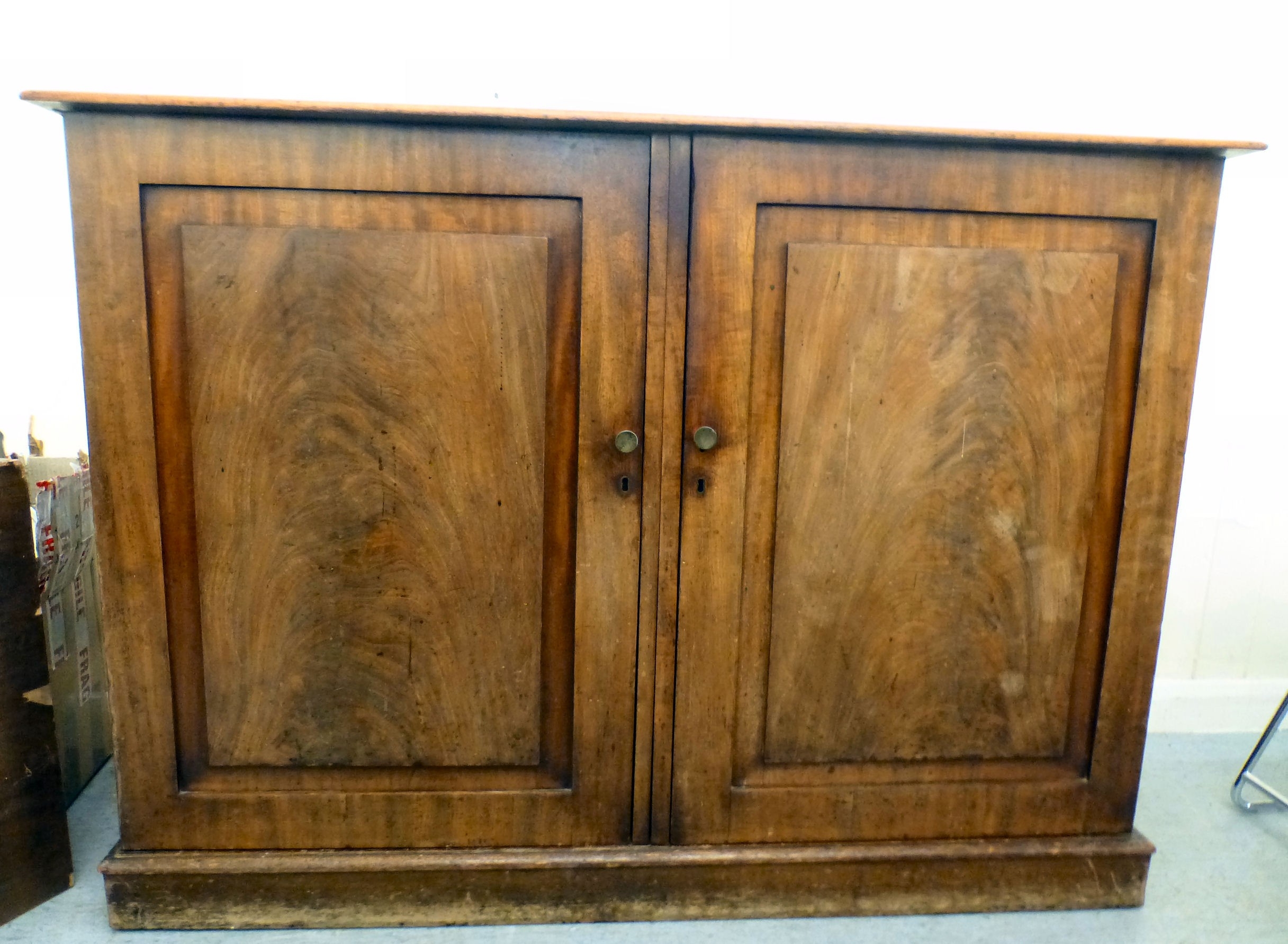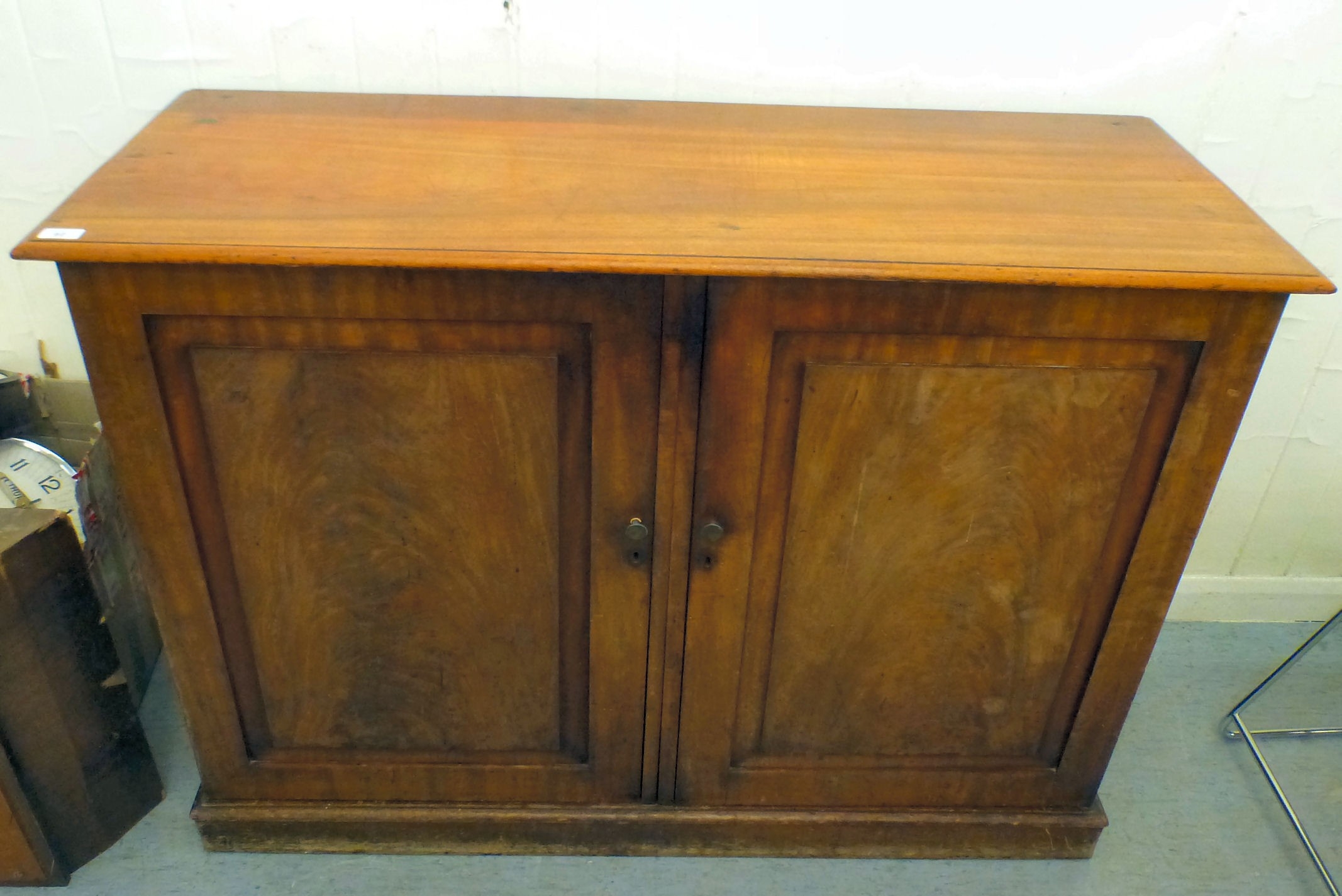 A mid 19thC and later mahogany cupboard with two doors and four shelves, raised on a plinth 36"h 50"w