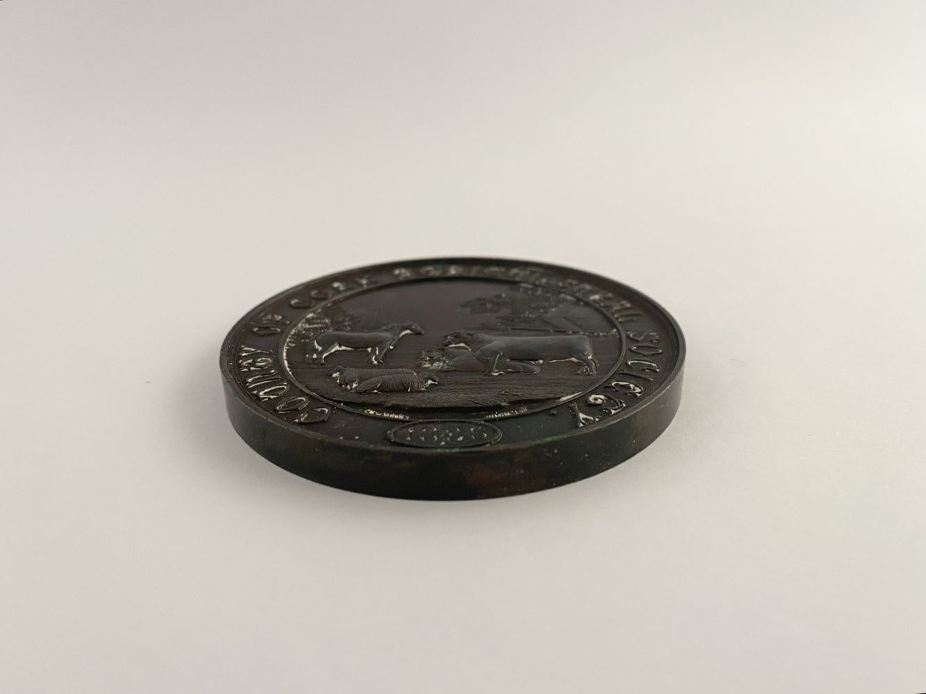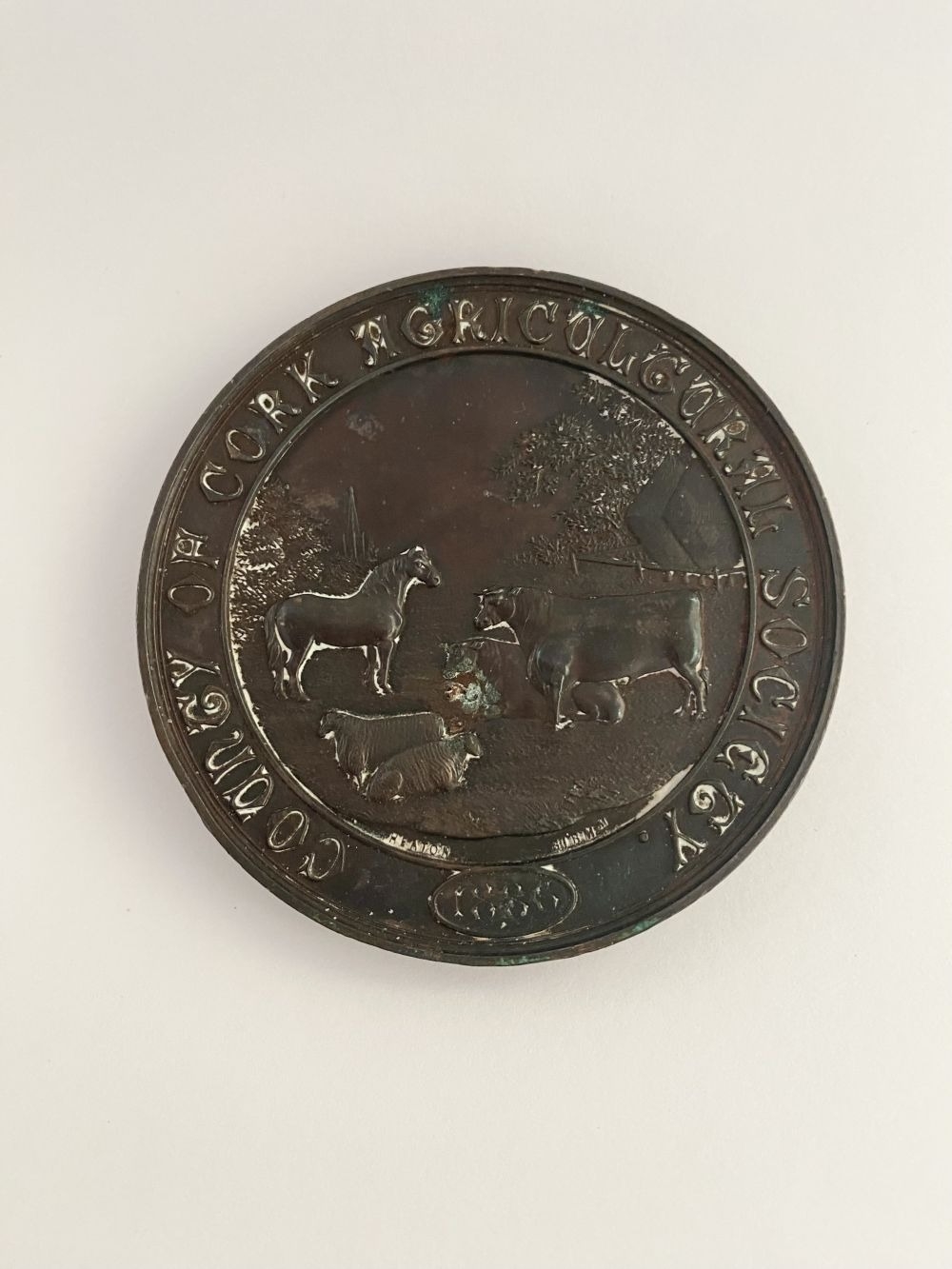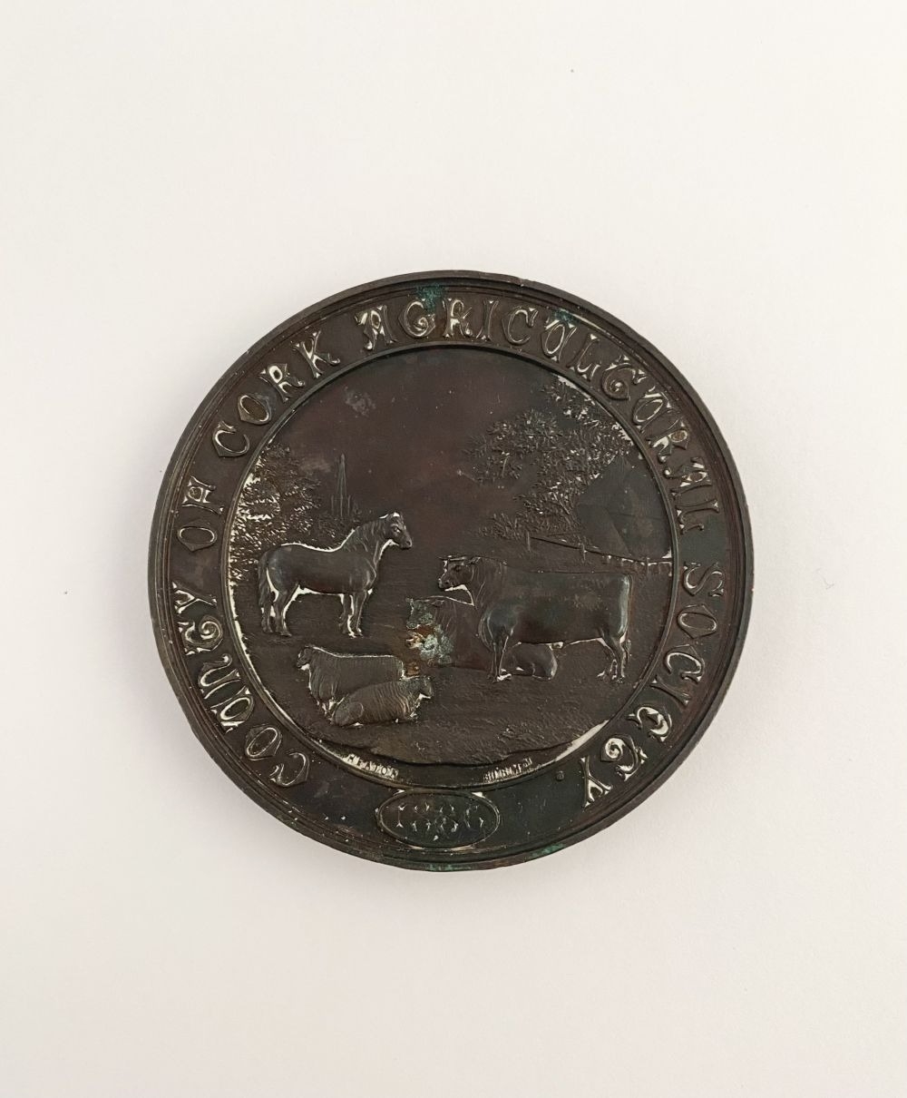 LOT OF CORK INTEREST: A COUNTY OF CORK AGRICULTURAL SOCIETY BRONZE AWARD MEDAL, by Heaton, Birmingham, to the front a rural scene with horse, bull, cow and sheep, 1886 engraved in cartouche, rev. Irish harp within a Celtic design, named (Highest Award for Devonshire Cream – R. Barter J.P.). Dimensions: 7cm diameter approx.
