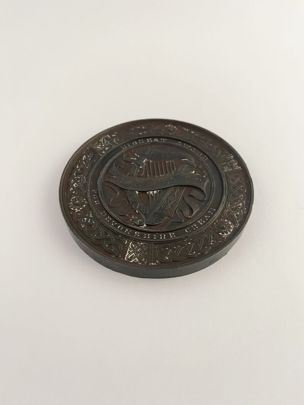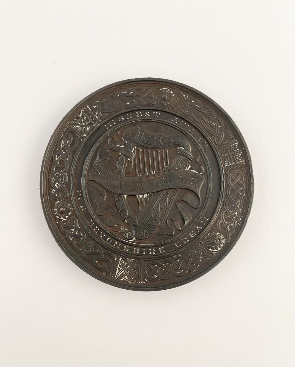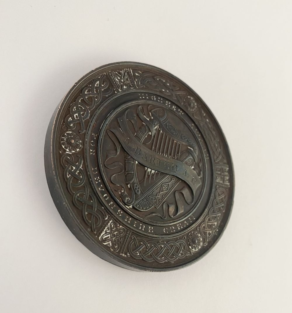LOT OF CORK INTEREST: A COUNTY OF CORK AGRICULTURAL SOCIETY BRONZE AWARD MEDAL, by Heaton, Birmingham, to the front a rural scene with horse, bull, cow and sheep, 1886 engraved in cartouche, rev. Irish harp within a Celtic design, named (Highest Award for Devonshire Cream – R. Barter J.P.). Dimensions: 7cm diameter approx.