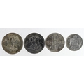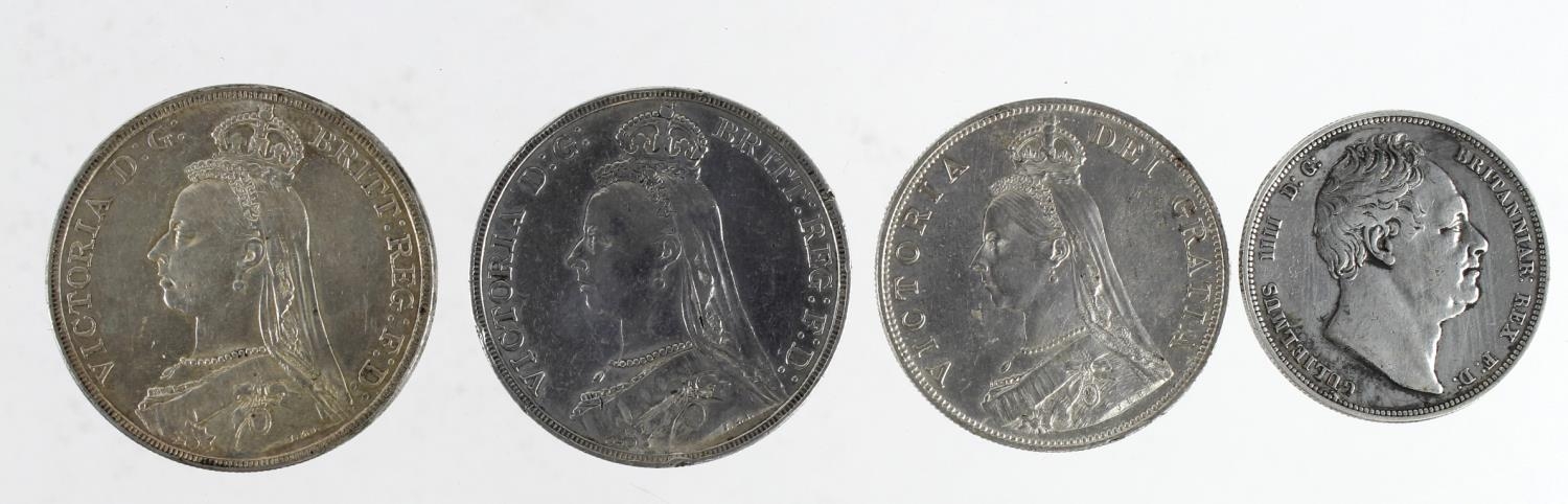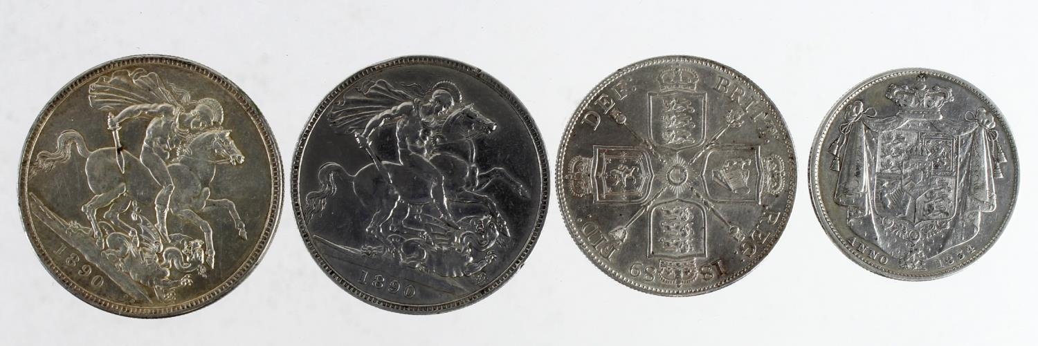 GB Silver (4): Crown 1890 GF knocks, Crown 1890 forgery cleaned GVF, Double-Florin 1889 cleaned GVF, and Halfcrown 1834 script WW, cleaned GF