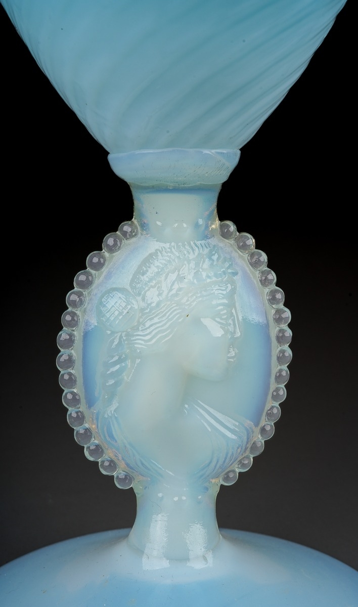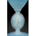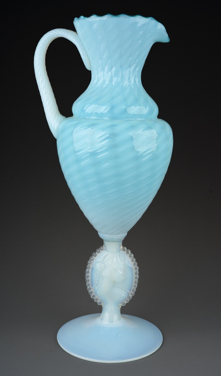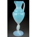An Italian blue and vaseline glass ewer, lattice and swirl decoration, rope twist handle, the stem moulded with a classical female cameo with in an oval with beaded edge, circular foot, height 38cm