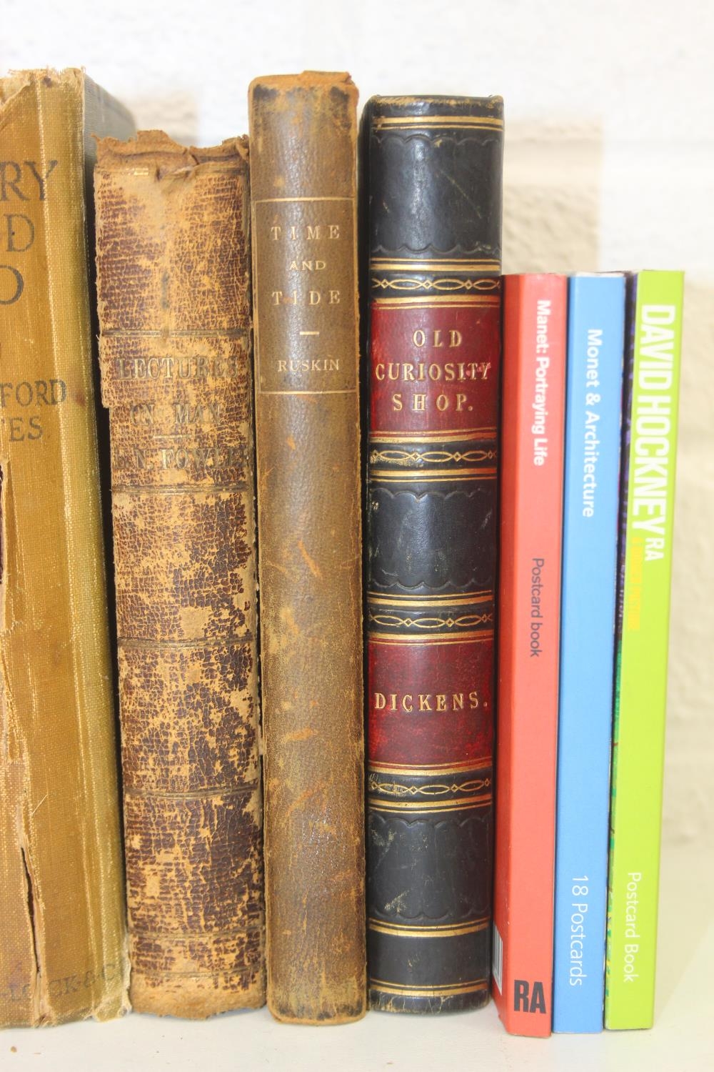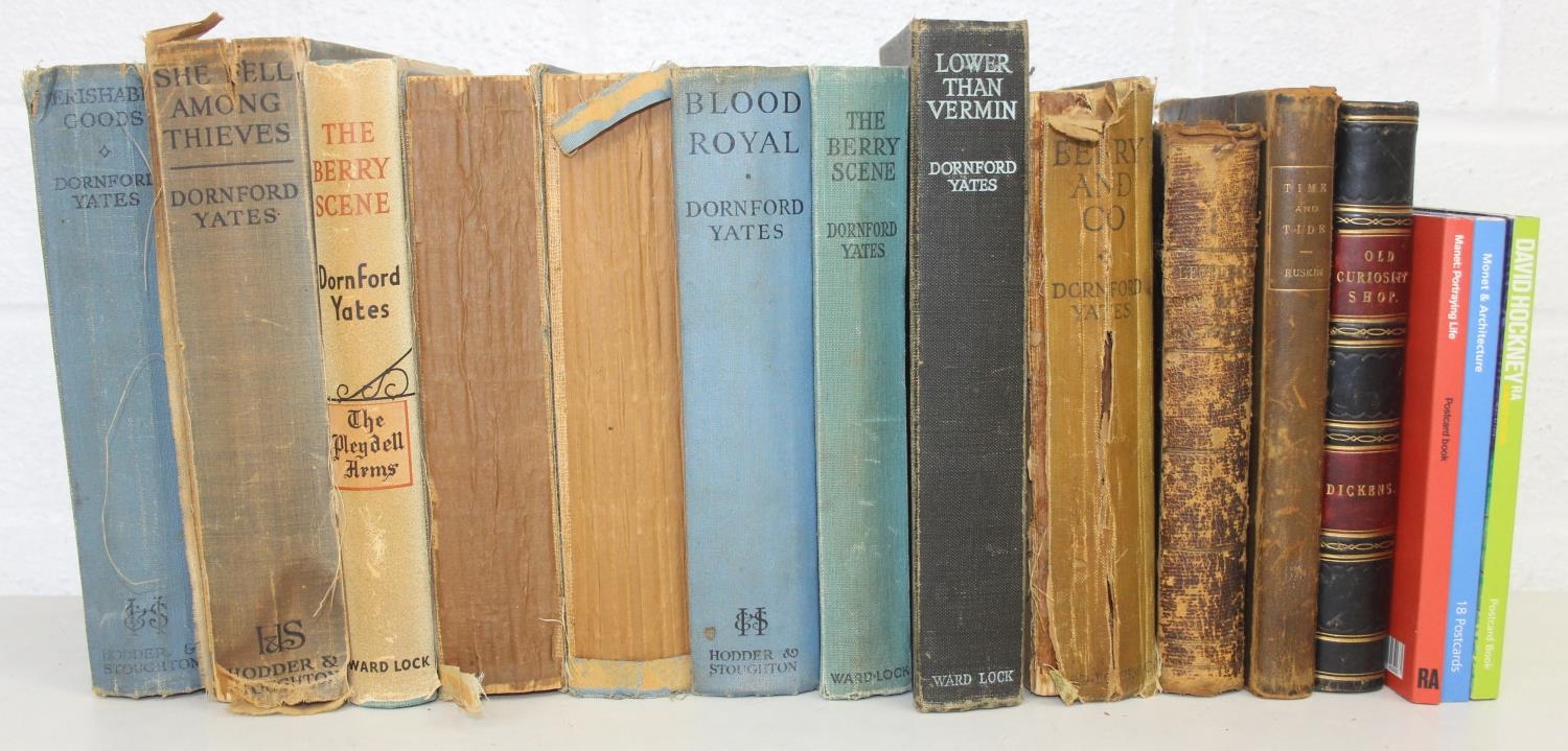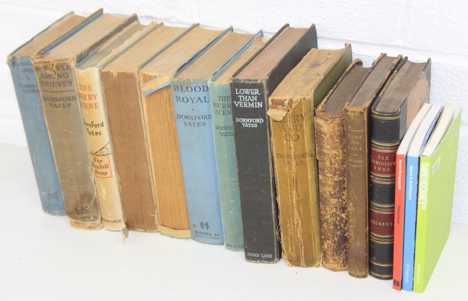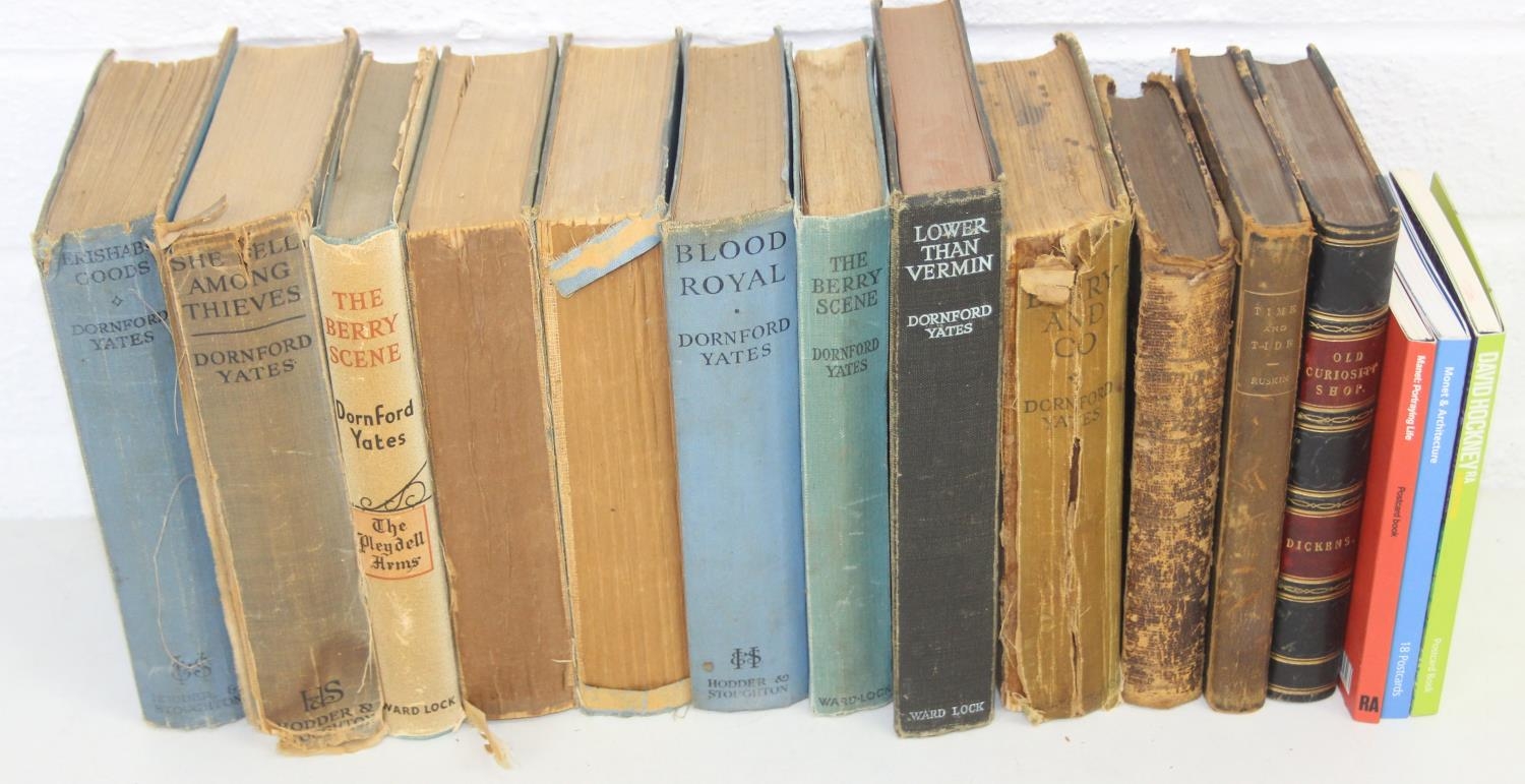 Qty of assorted antique and later books to inc leather bound Dickens, Phrenology & Physiological Register by Fowler 1865, and a number of Dorothy Yates books