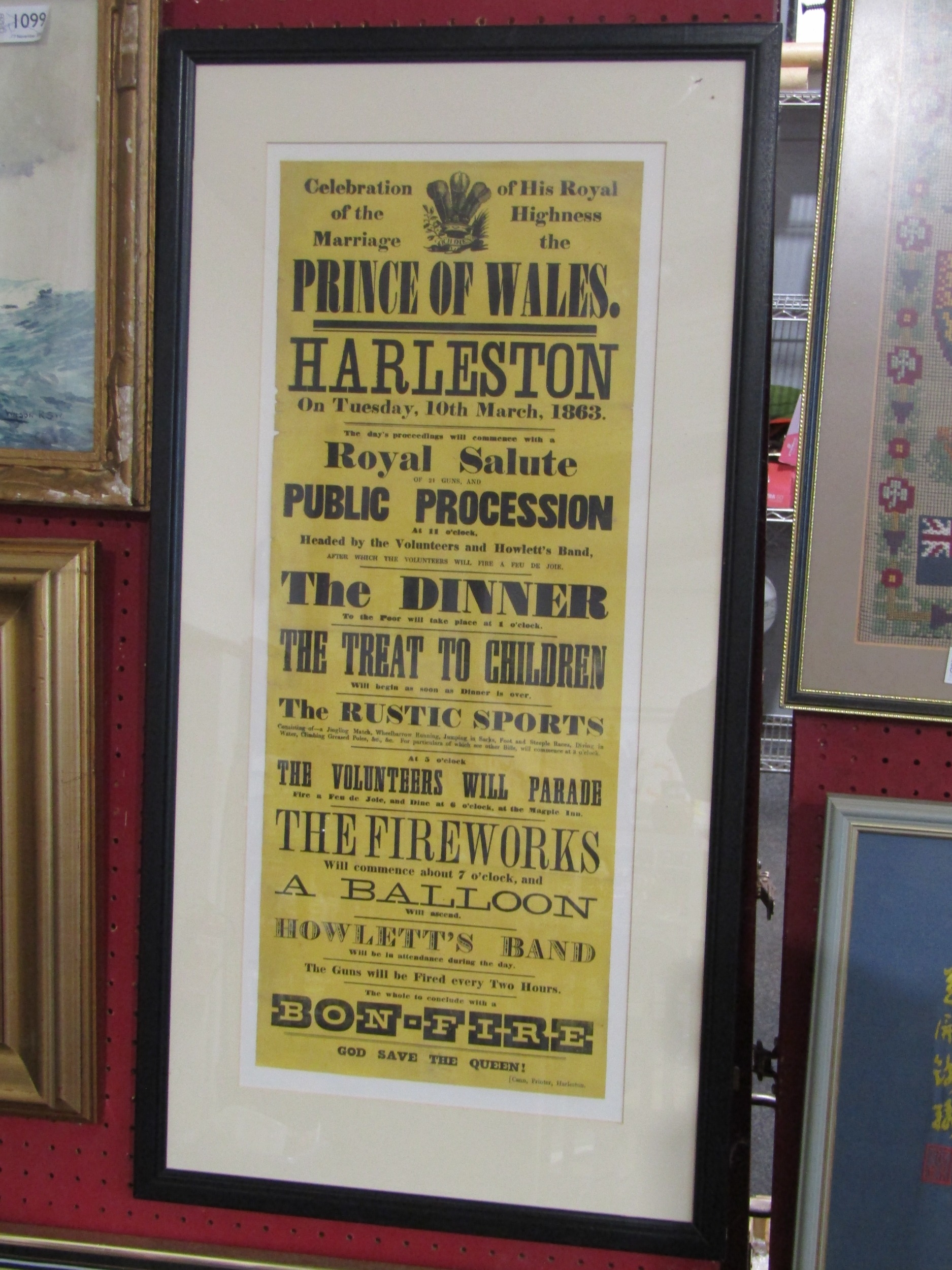 A Victorian framed Prince of Wales Harleston 1863 Royal Salute Public Procession poster, 58cm x 23cm