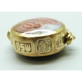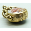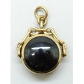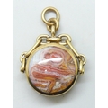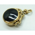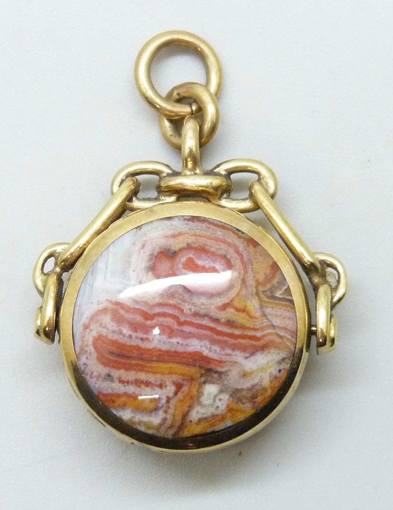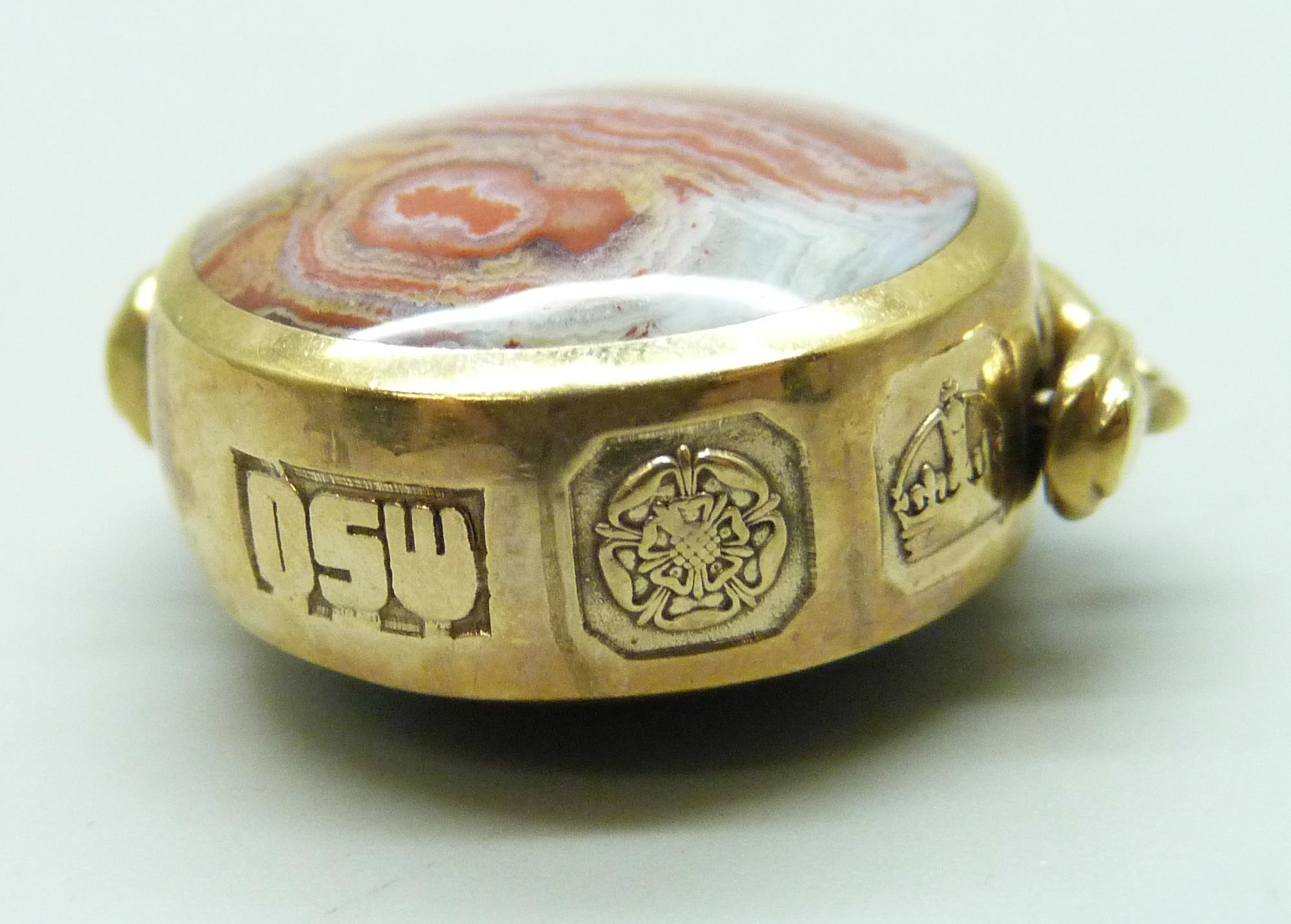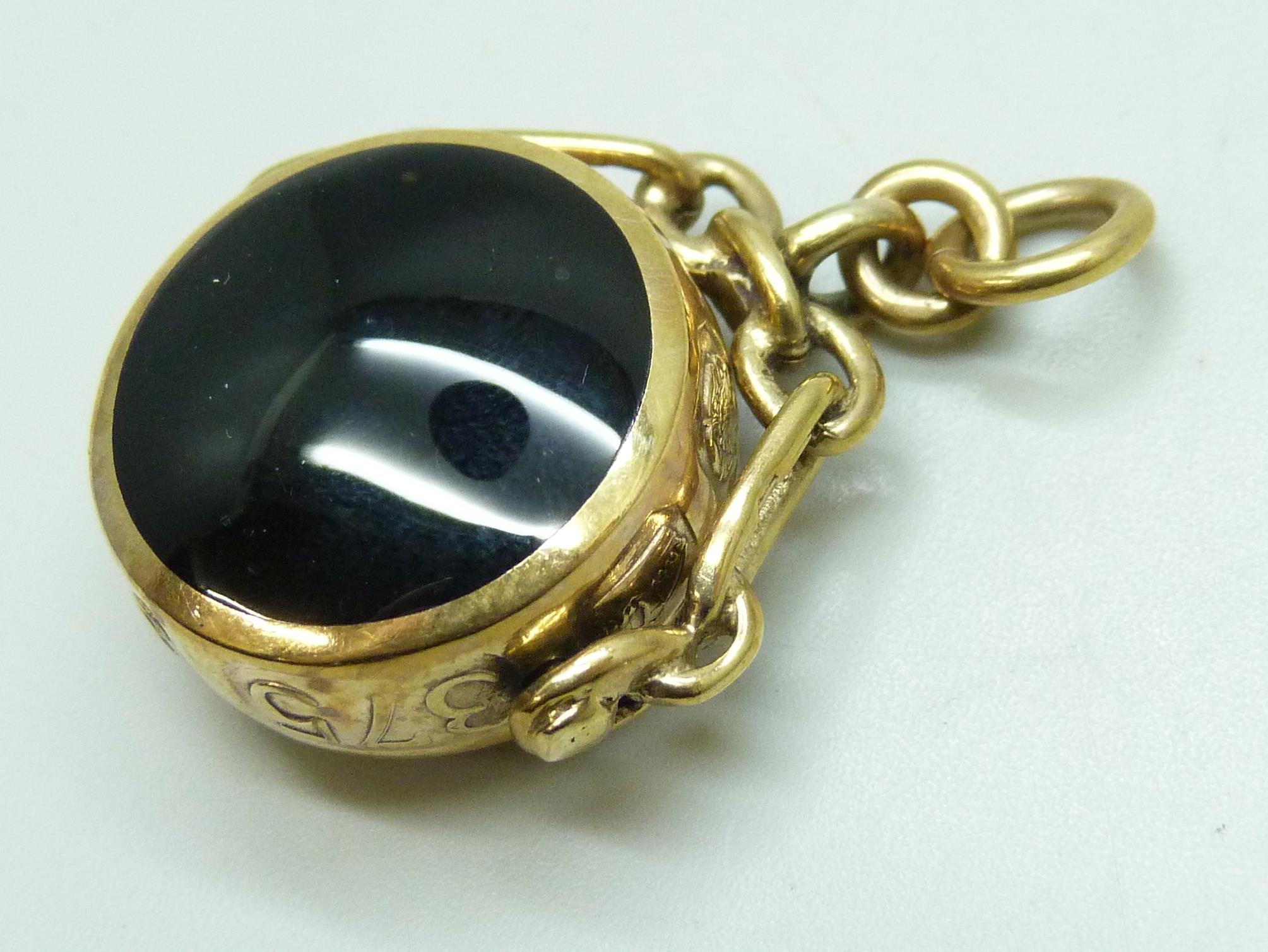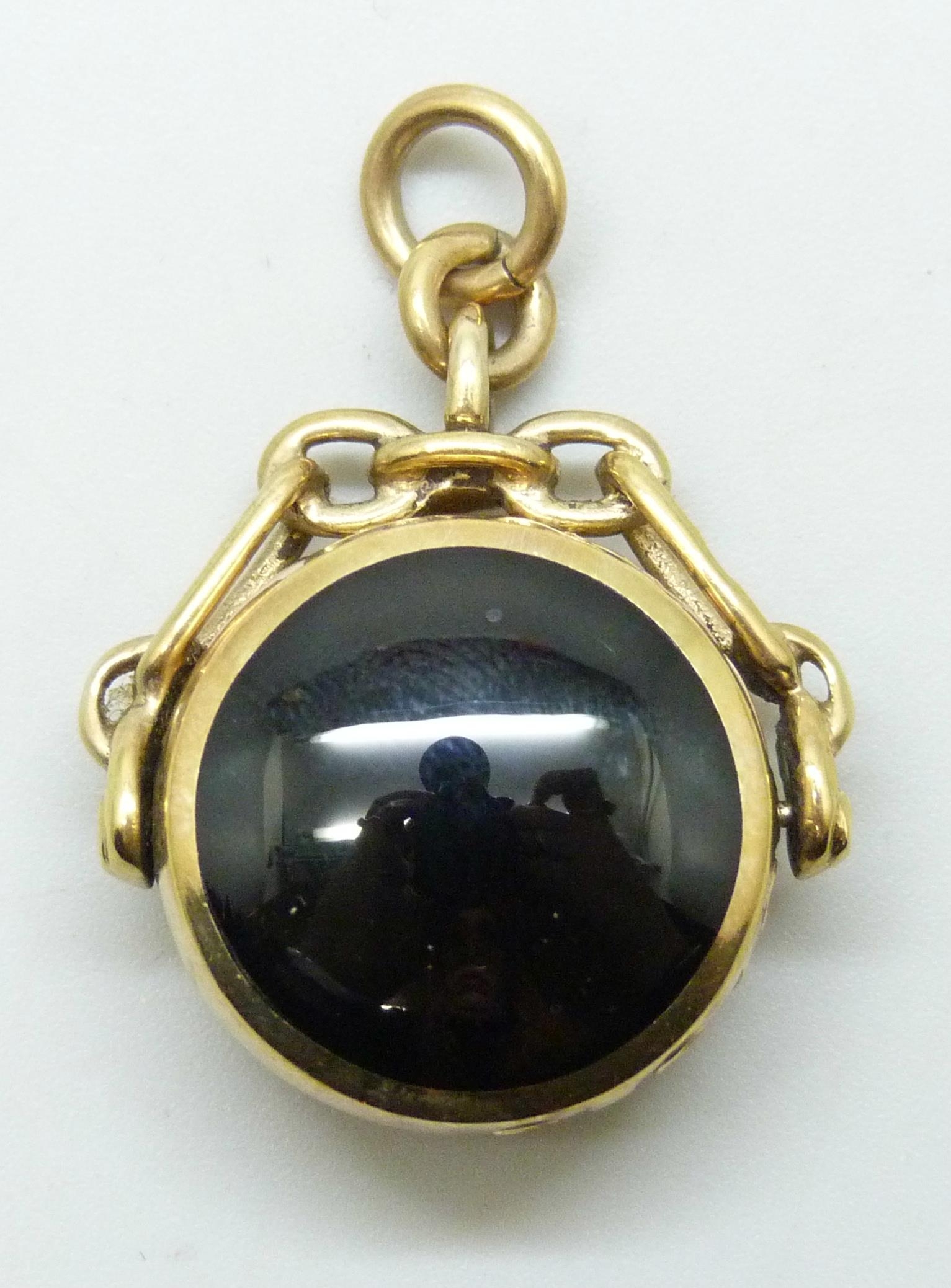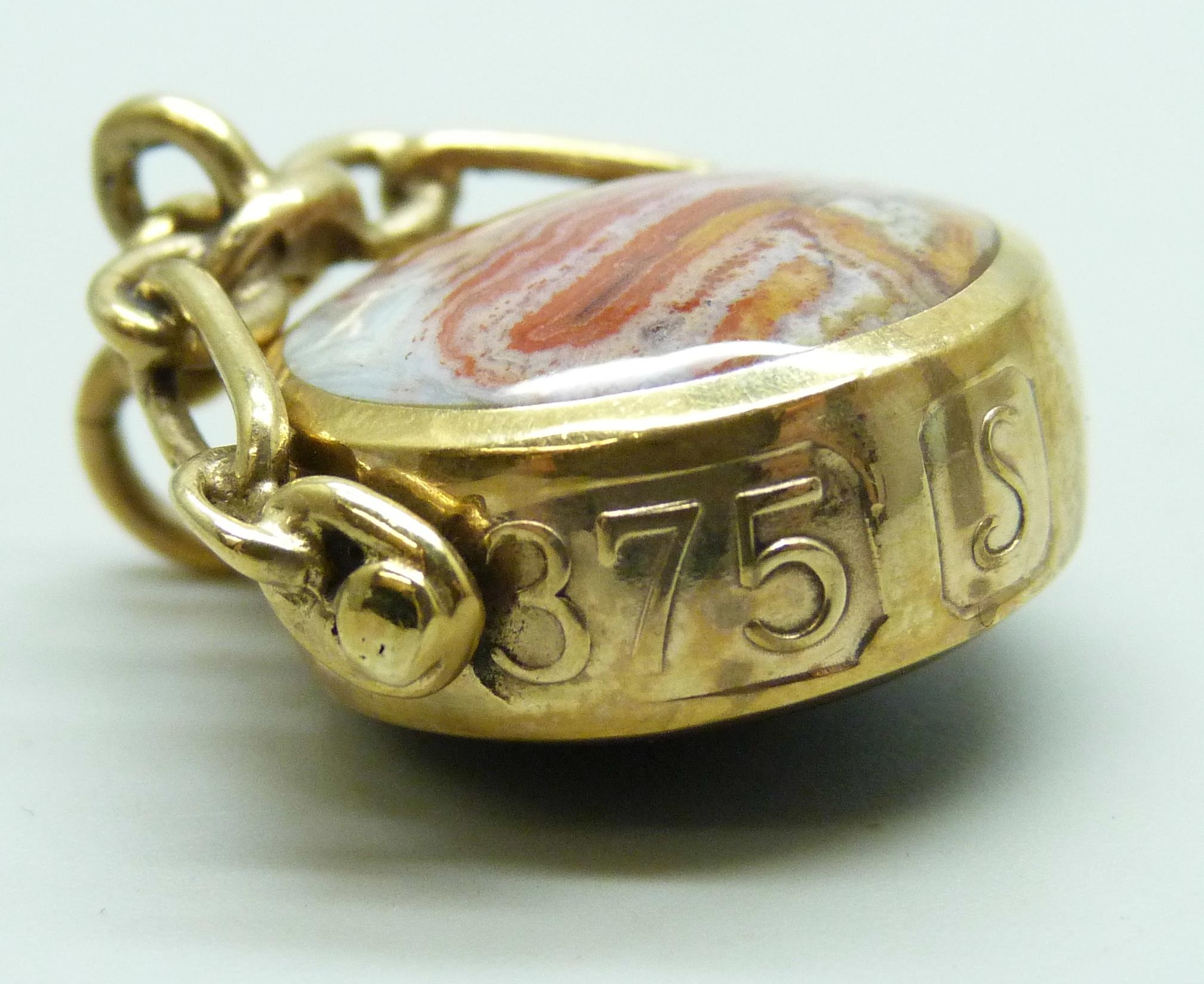 A 9ct gold spinner fob pendant set with agate and onyx, 12.1g, 3.5cm including bail