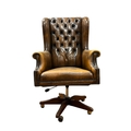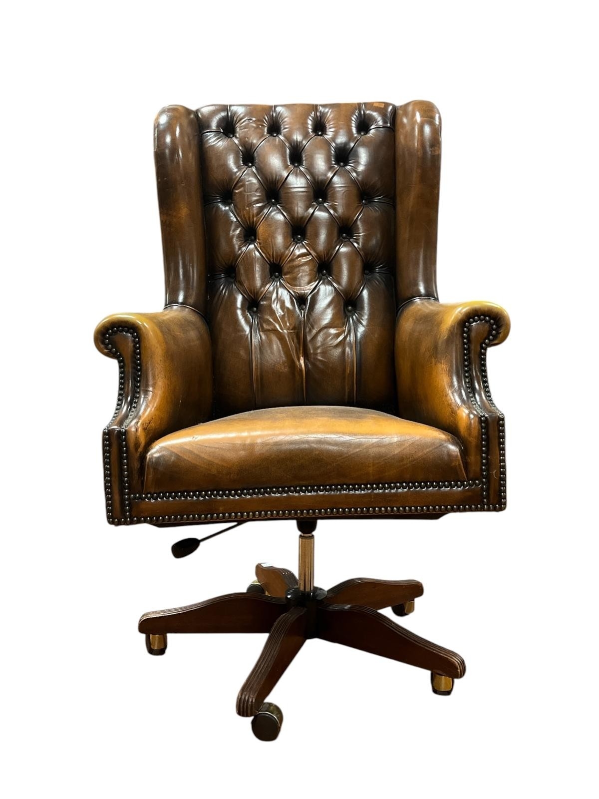A MAHOGANY AND HIDE UPHOLSTERED WING BACK SWIVEL LIBRARY CHAIR with deep buttoned upholstered back and seat with scroll arms on revolving base with castors (AF)