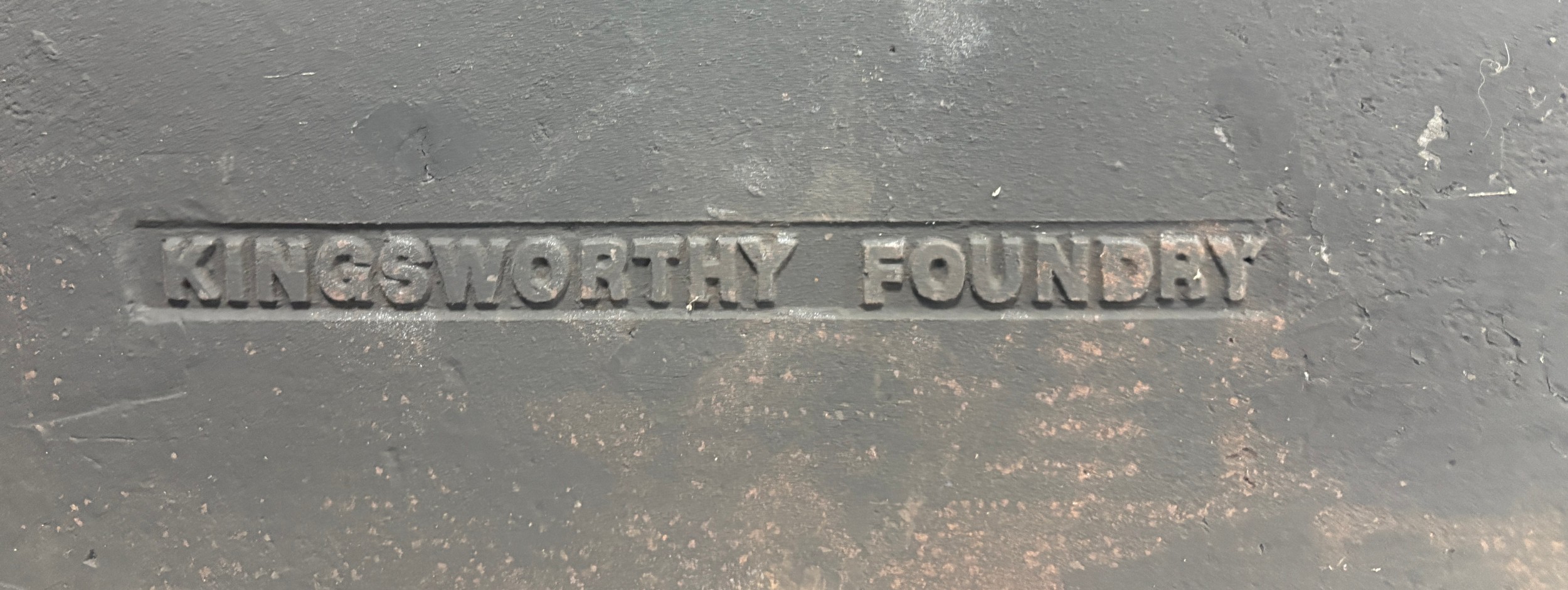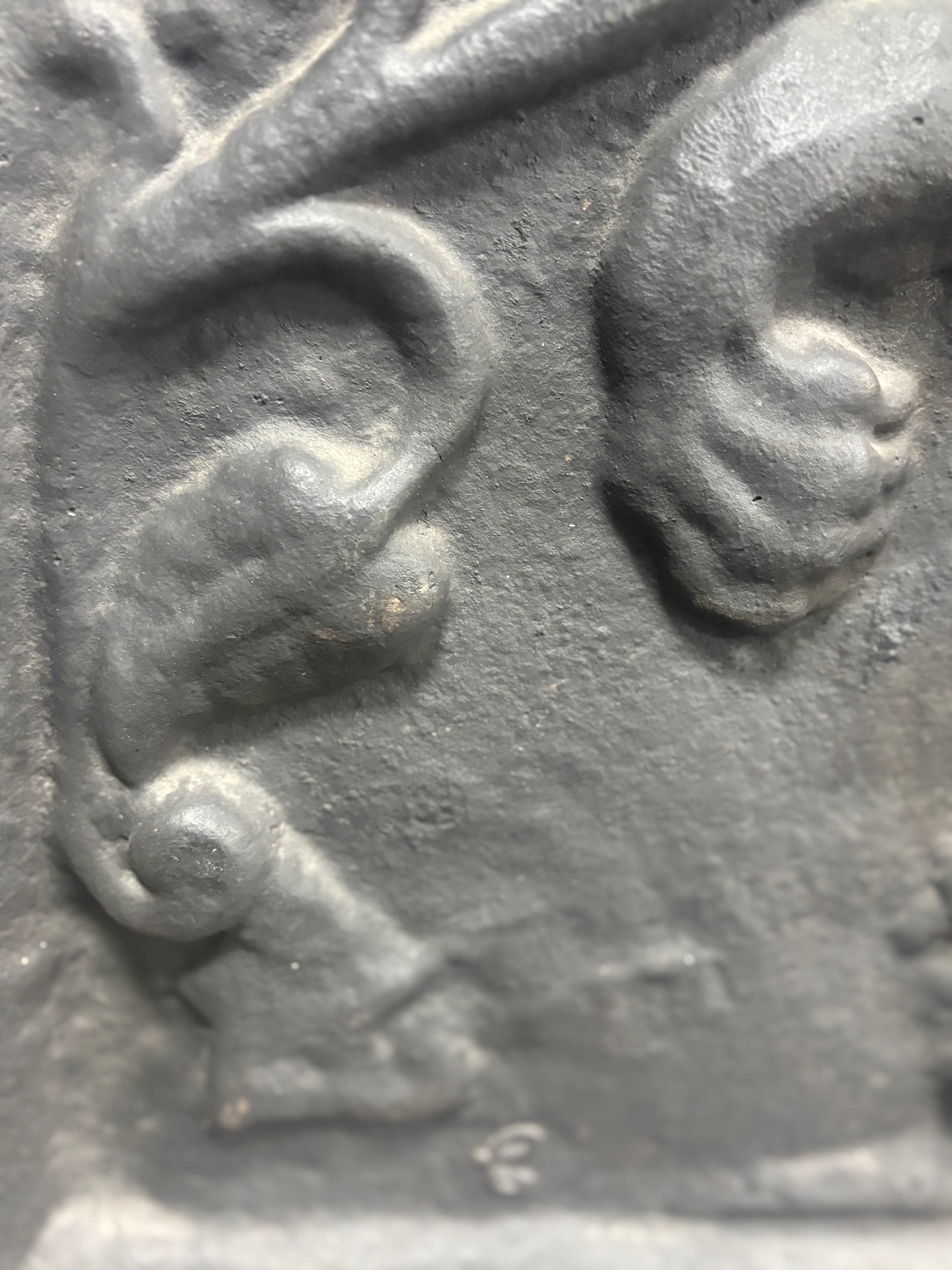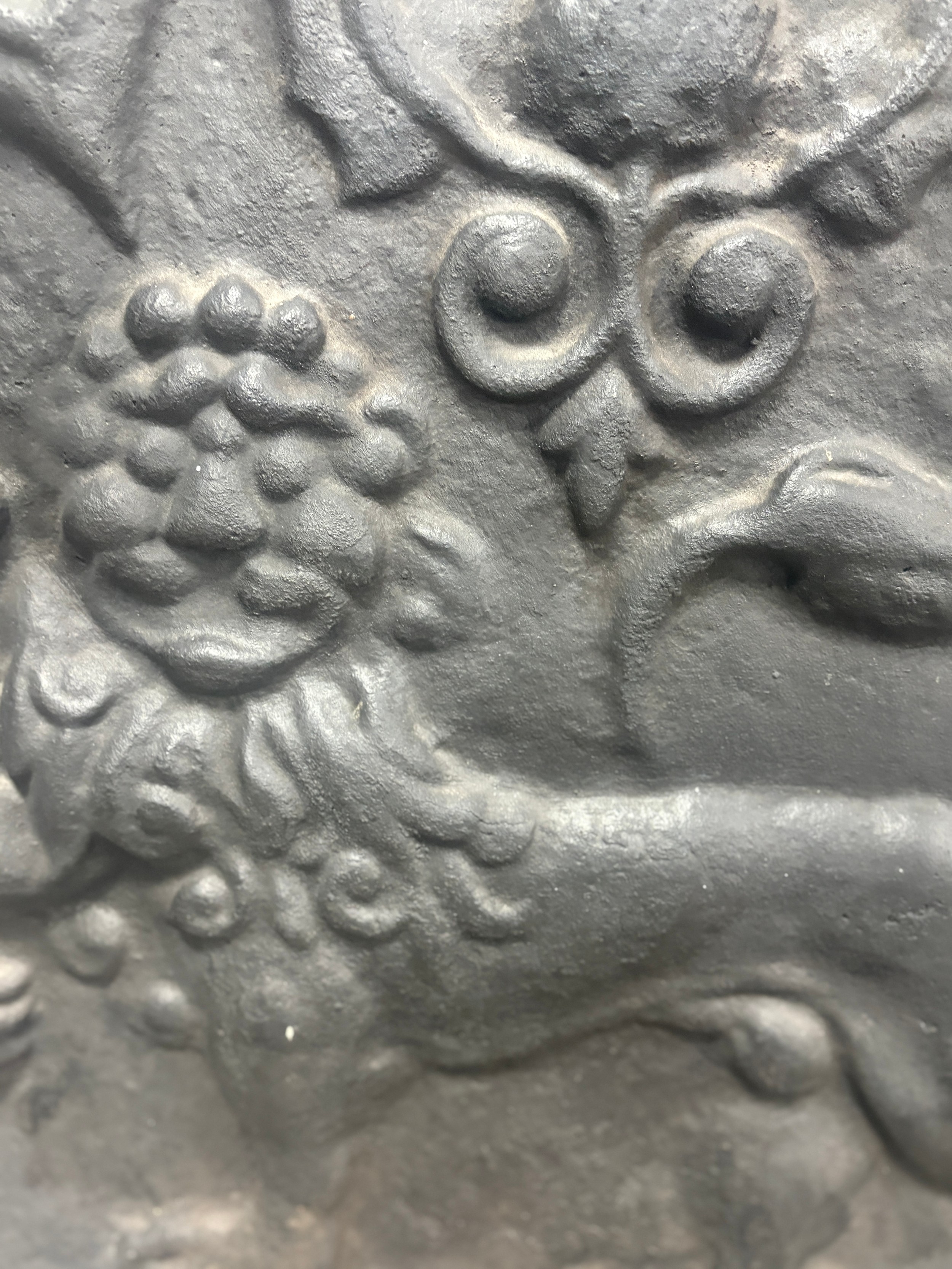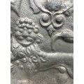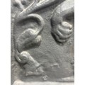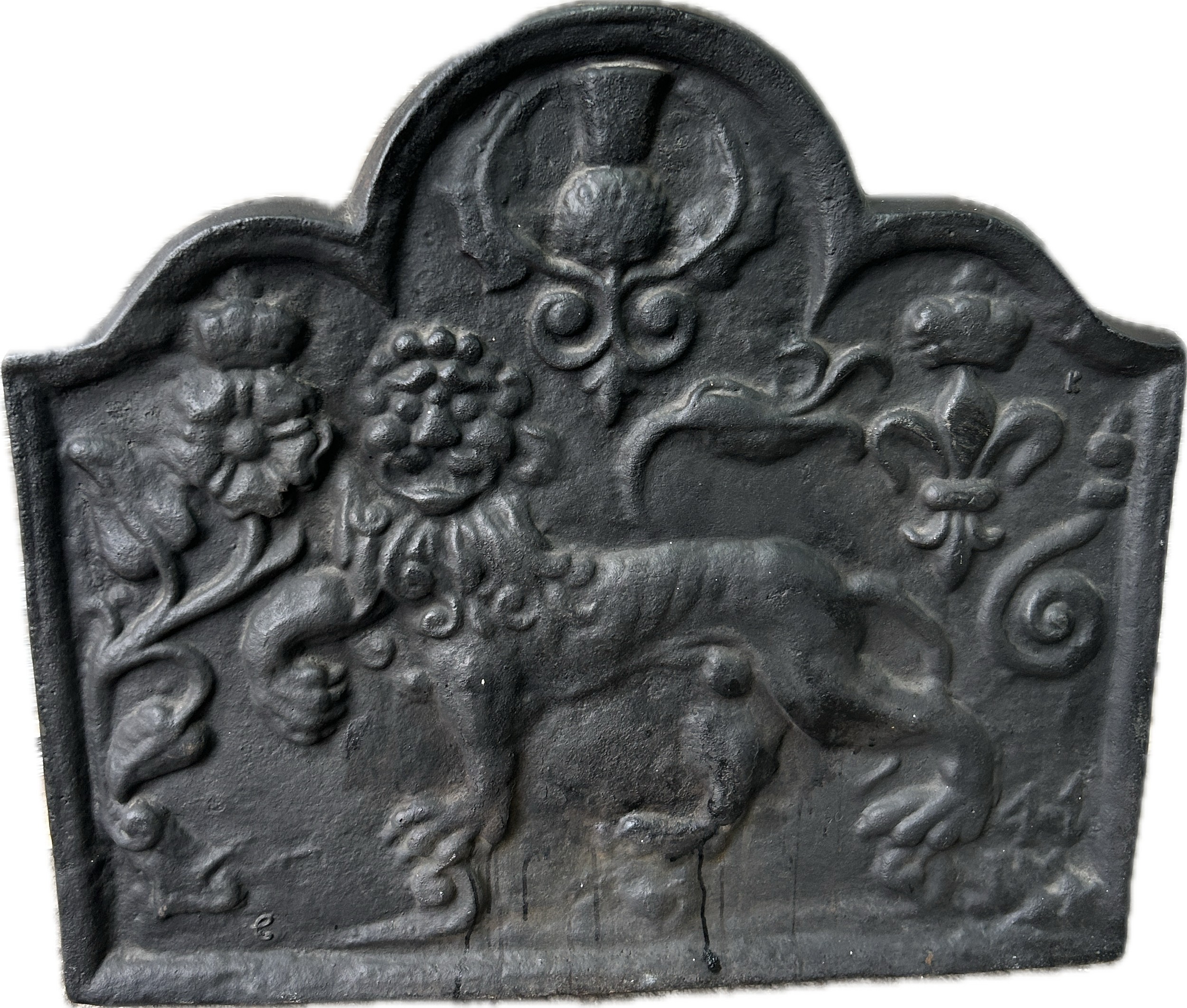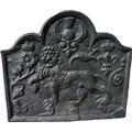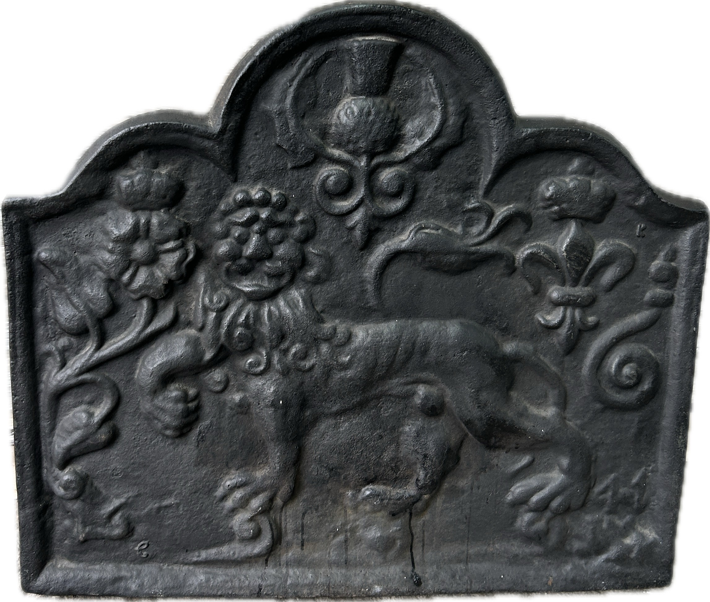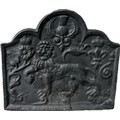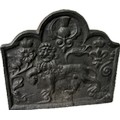 Vintage cast iron fire back with Carolean style, superb lion motif and thistle design, produced by Kingsworthy foundry this piece measures approximately: 26 inches tall x 28.5 wide