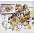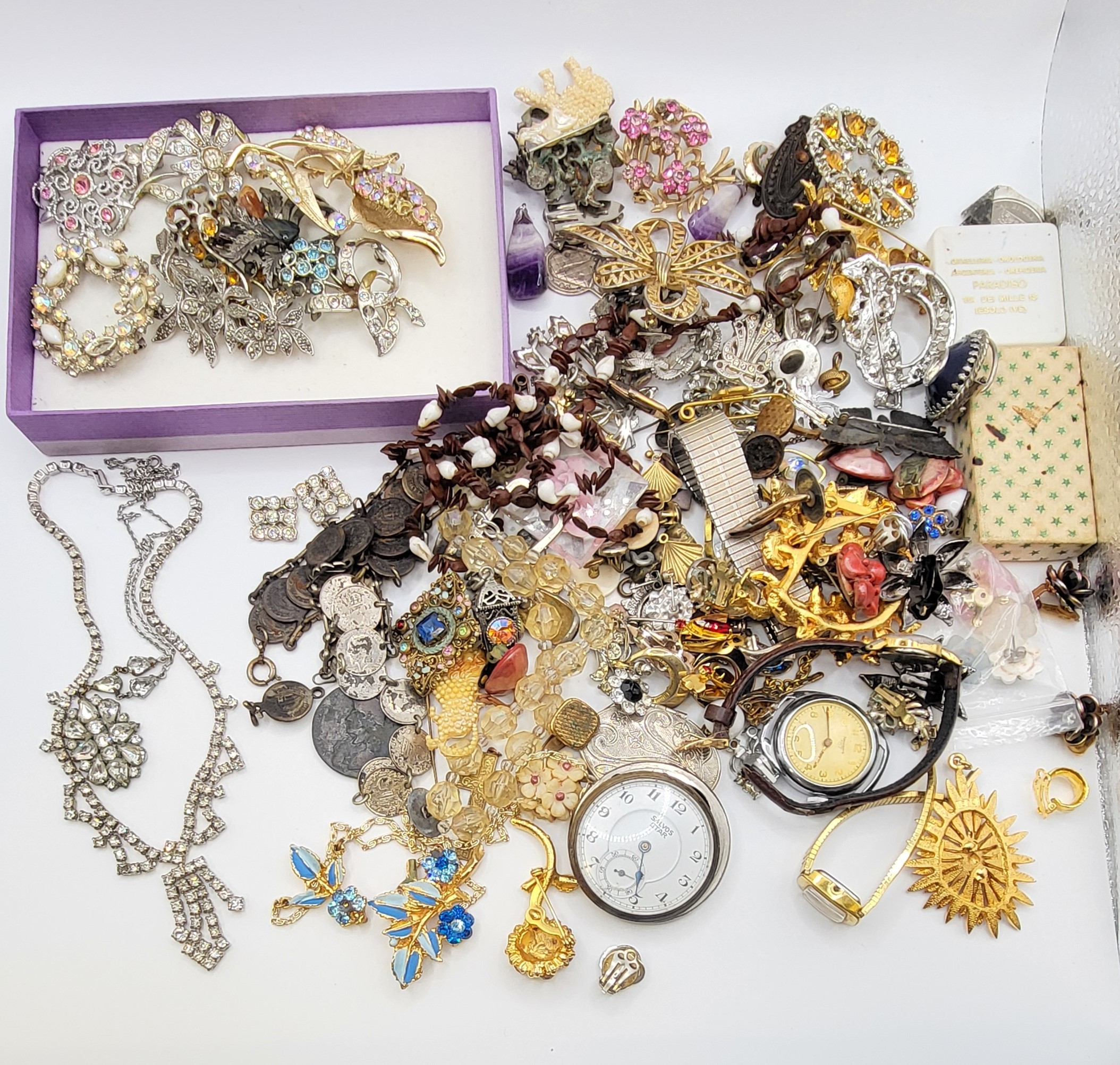Costume jewellery including brooches, cuff links, earrings, fashion watches, lockets, a base metal/ plated elongated link chain, and a bag of old coins.