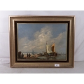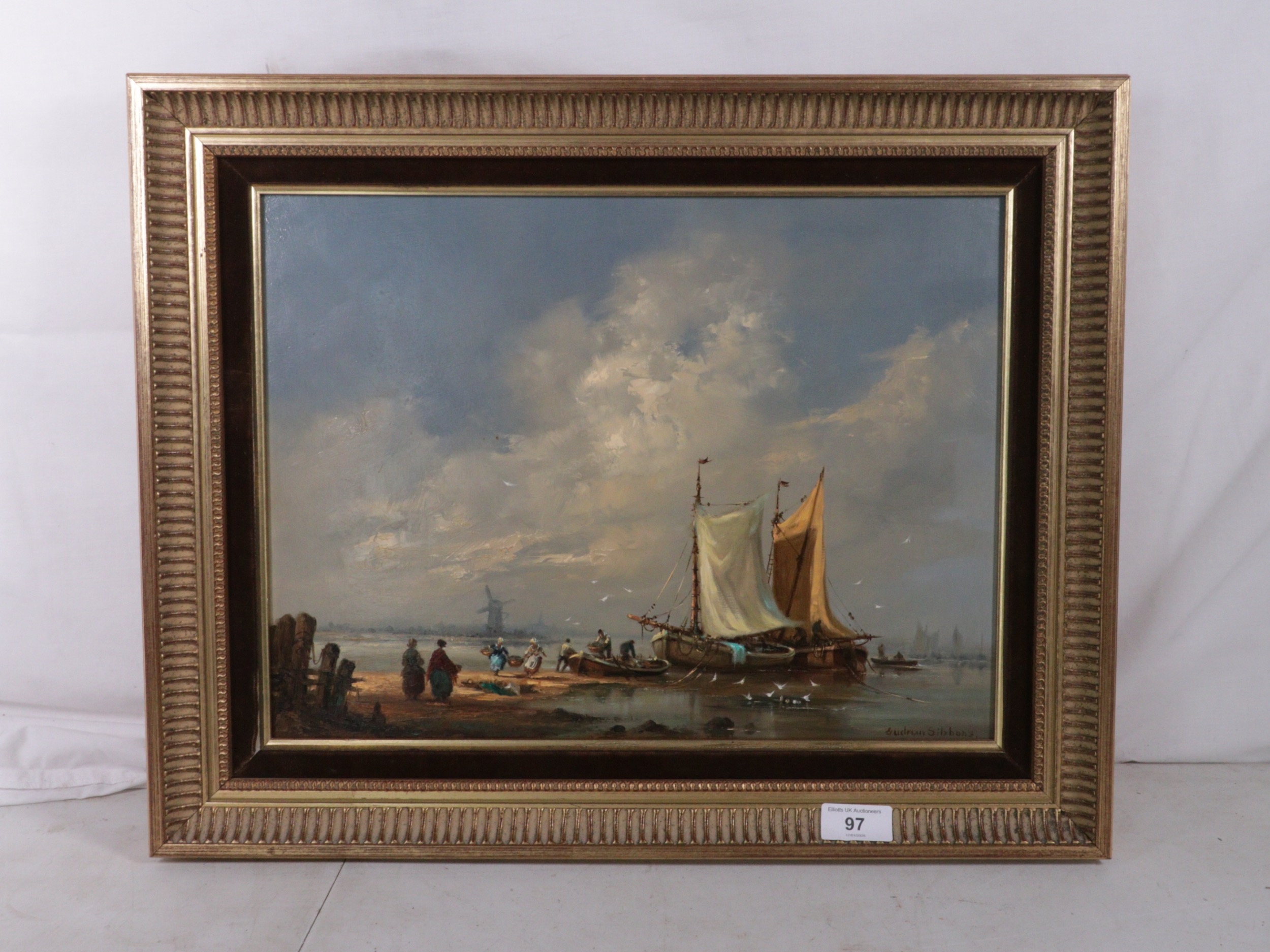 Goodrun Sibbons oil on board depicting a Dutch? coastal scene featuring fishing boats (approx. 40cm x 29cm)