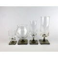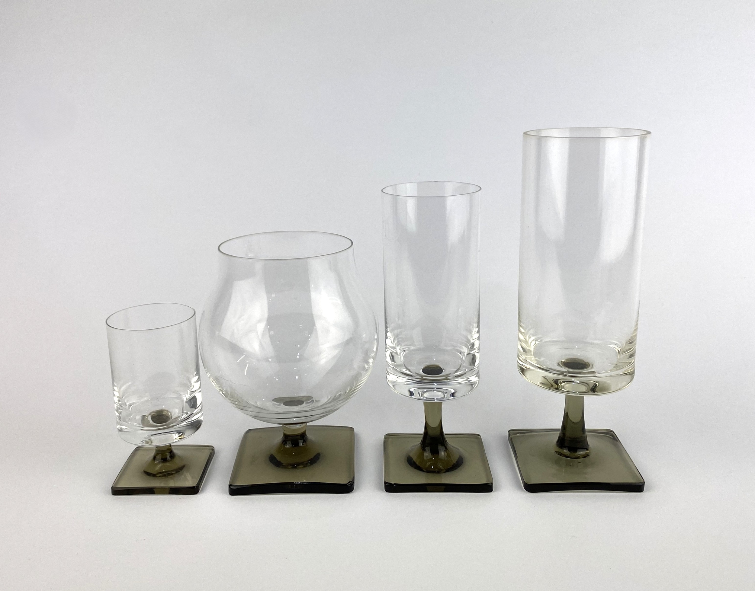 George Butler Jensen (1915 - 1977) for Rosenthal: A set of four vintage 'Linear Smoke - Berlin' drinking glasses, c. 1960s, each with clear glass bowl and square smoked glass foot, with etched makers mark to base, including; brandy balloon, champagne flute, wine glass and port glass, the largest height 17.75cm (4)