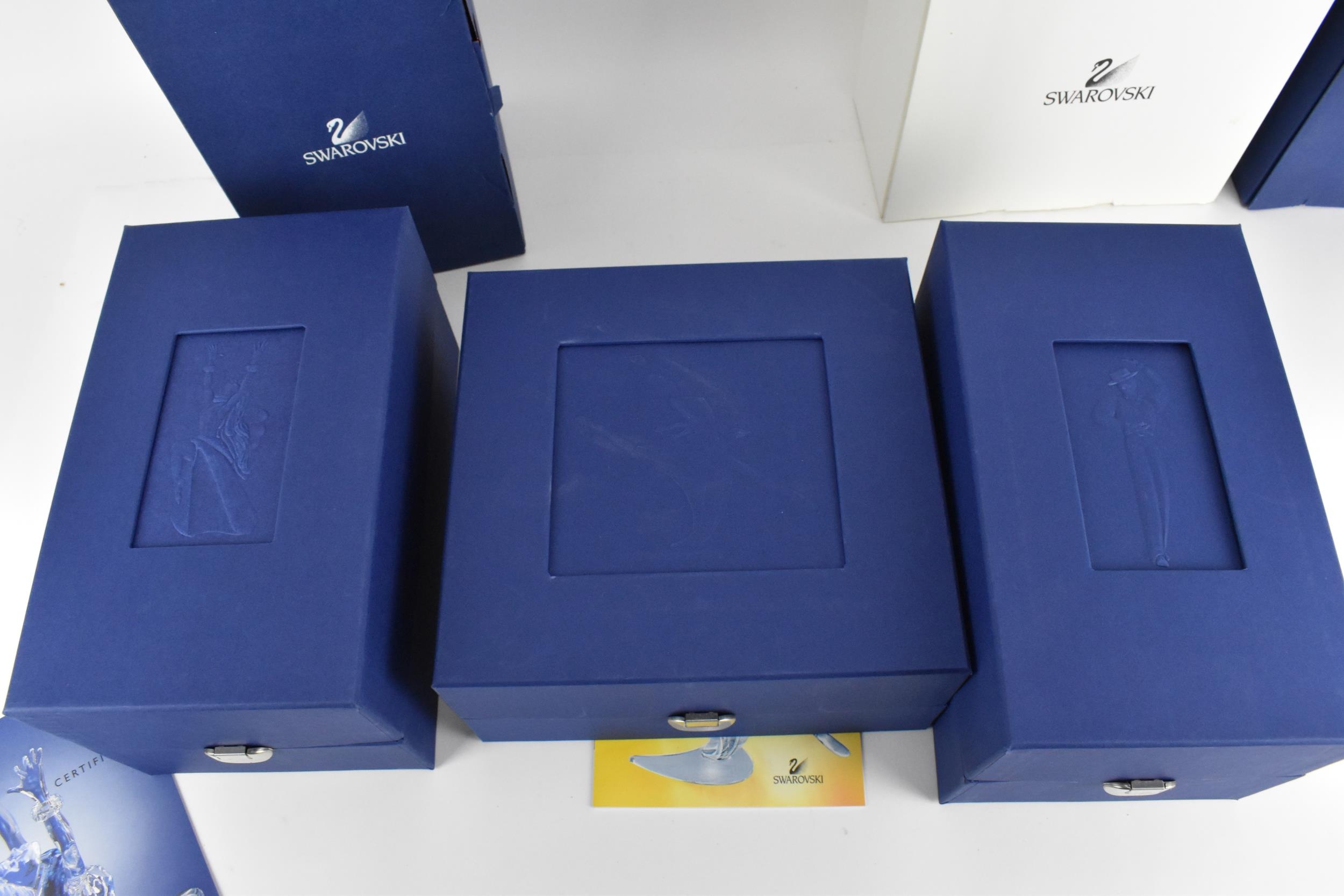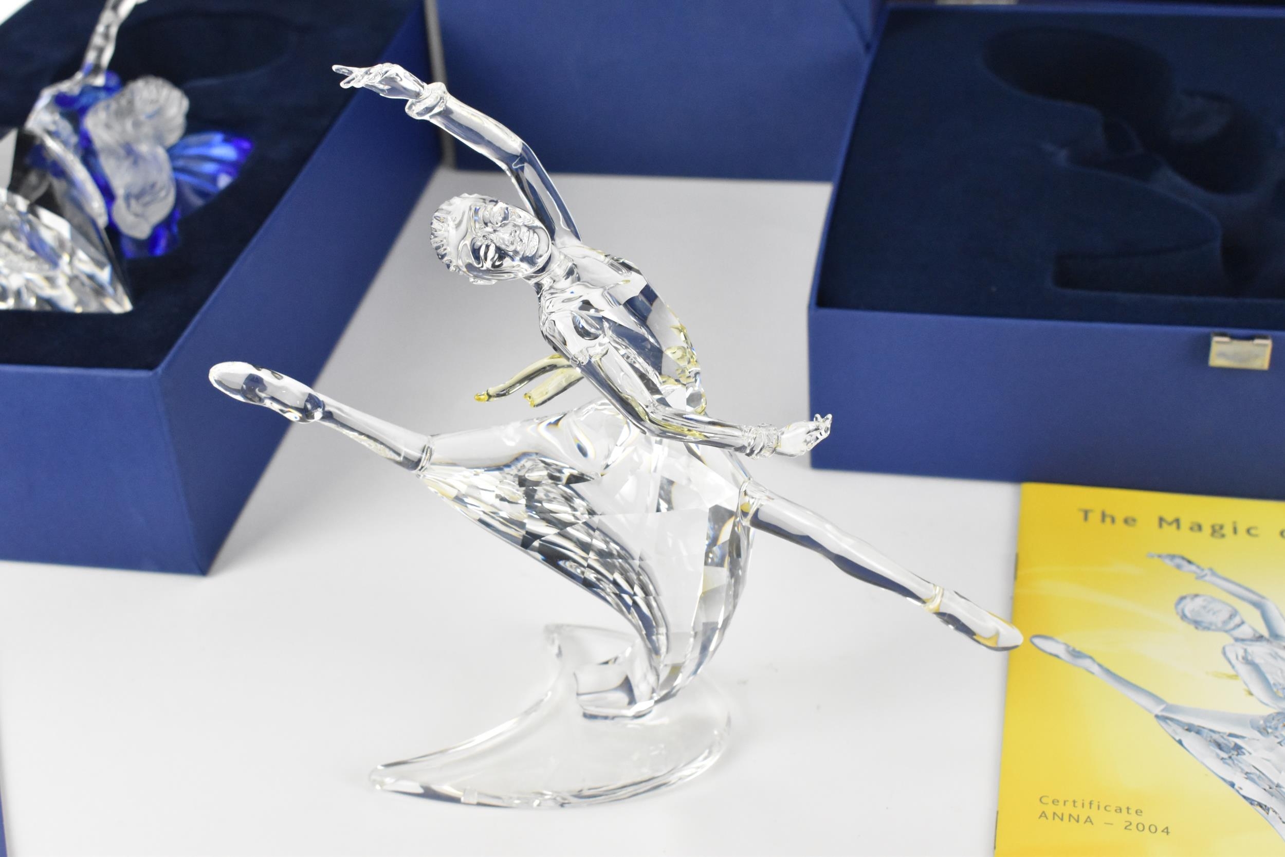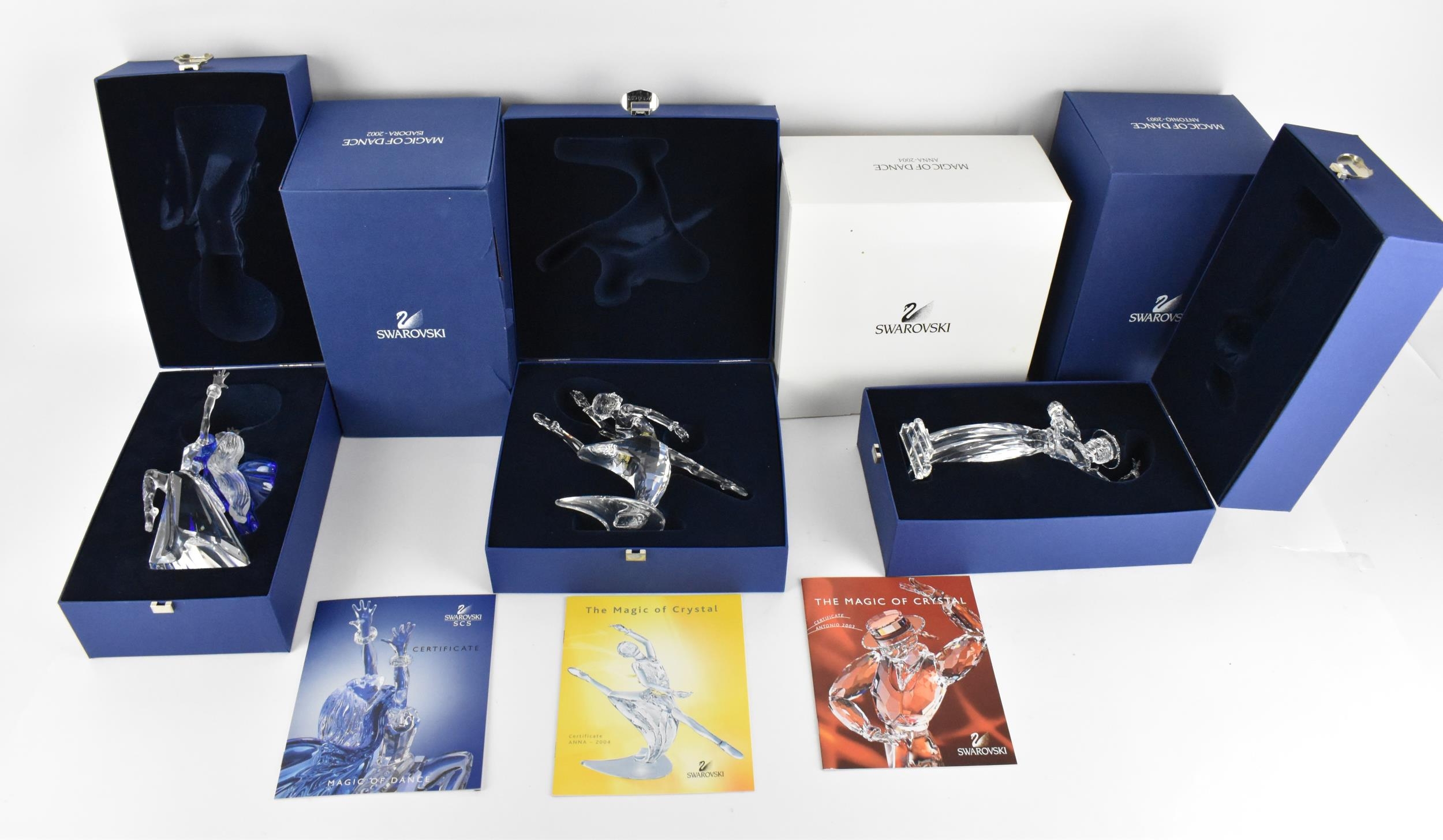 Three Swarovski CSC dancer figures, designed by Anton Hirzinger, comprising Magic of Dance 2002 'Isadora', 23cms H, Magic of Crystal 2003 'Antonio', 23cms H and Magic of Crystal 2004 'Anna'