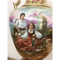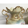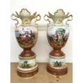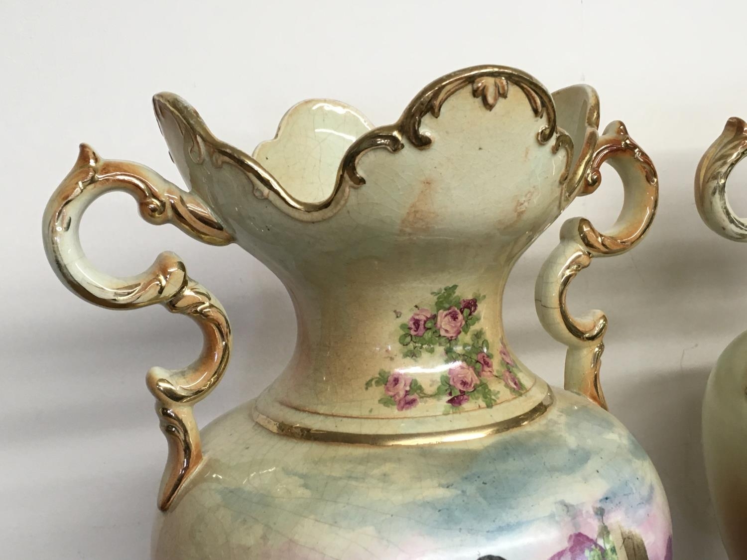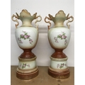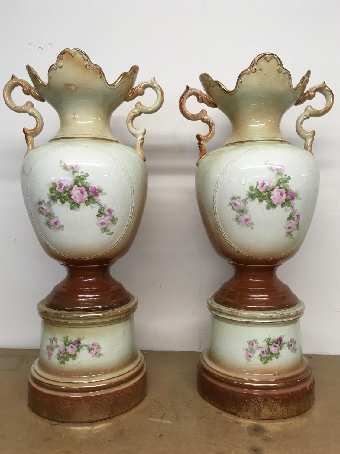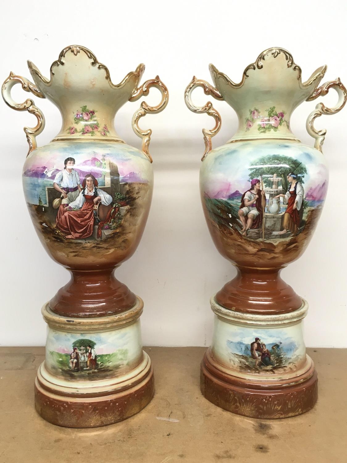 A pair of Victorian vases decorated with hand painted panels of classic scenes and pink rose designs , gilt detailing and handles, open tops and pedestal bases. 56cm tall approximate total height. This lot cannot be posted