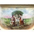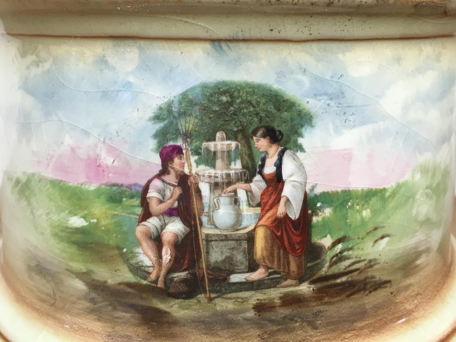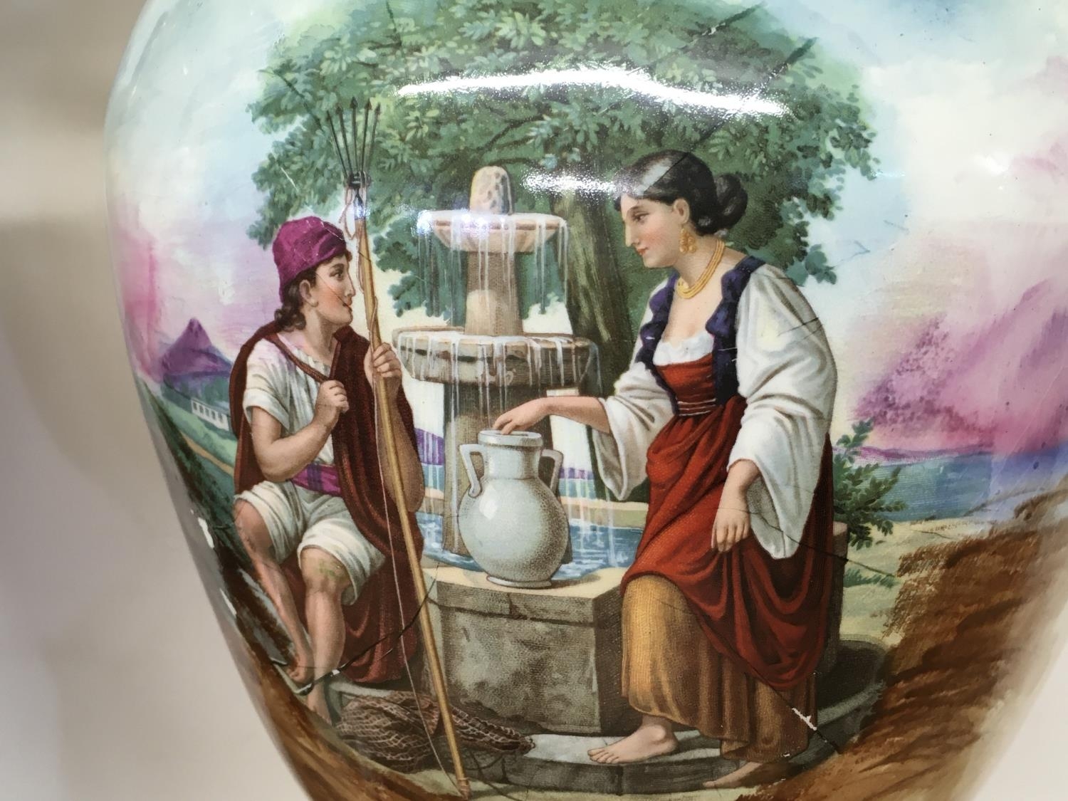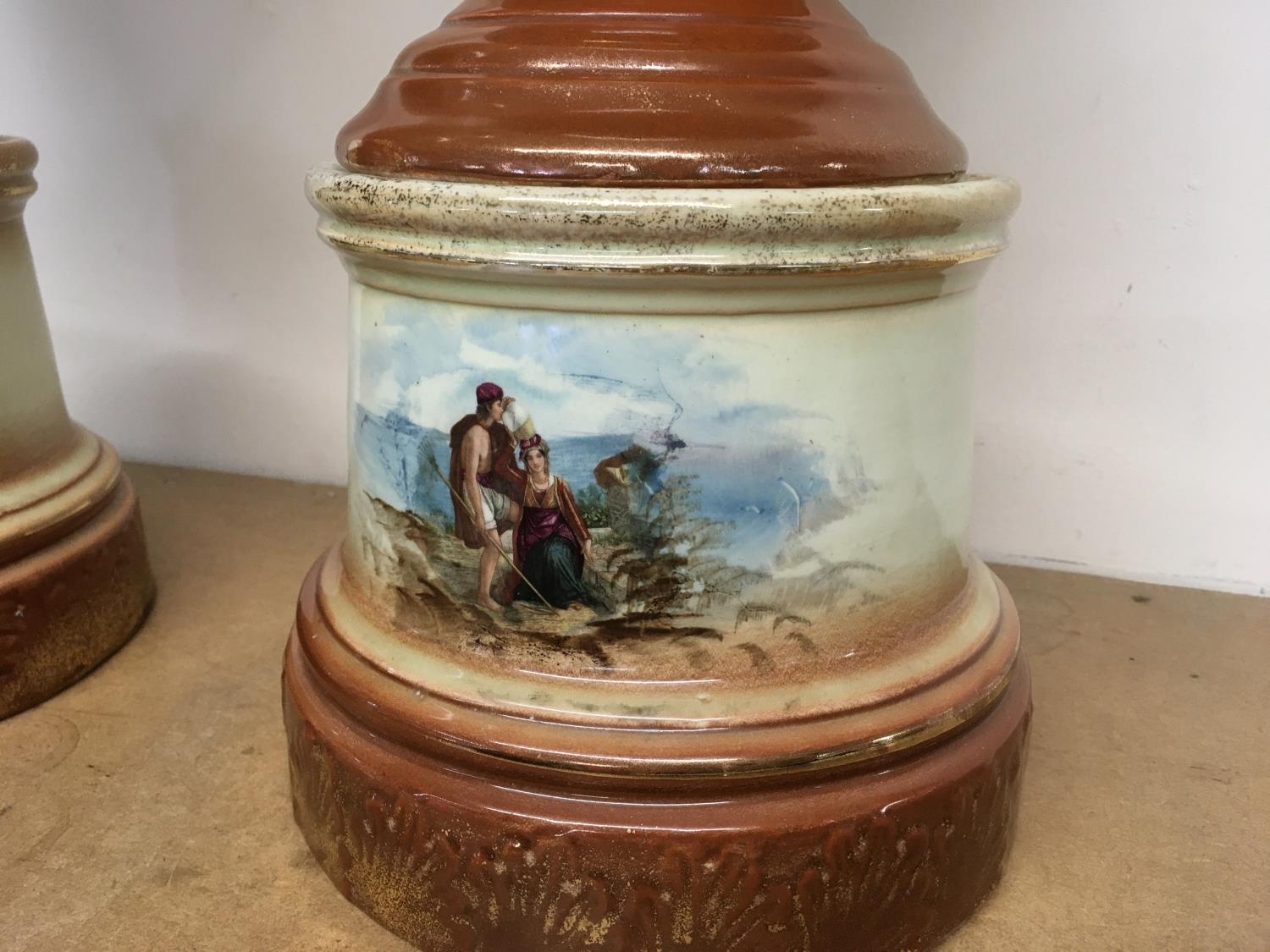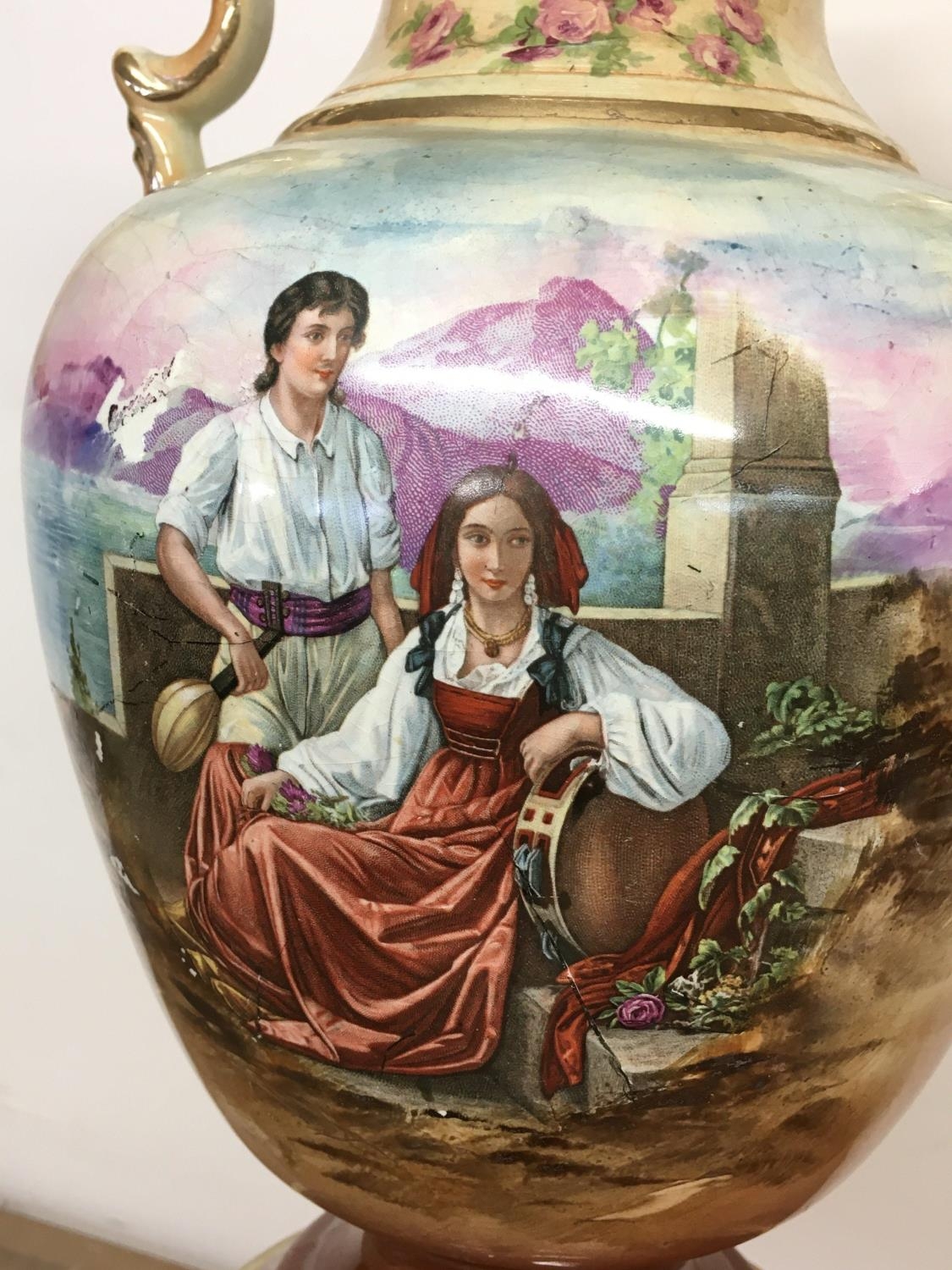 A pair of Victorian vases decorated with hand painted panels of classic scenes and pink rose designs , gilt detailing and handles, open tops and pedestal bases. 56cm tall approximate total height. This lot cannot be posted
