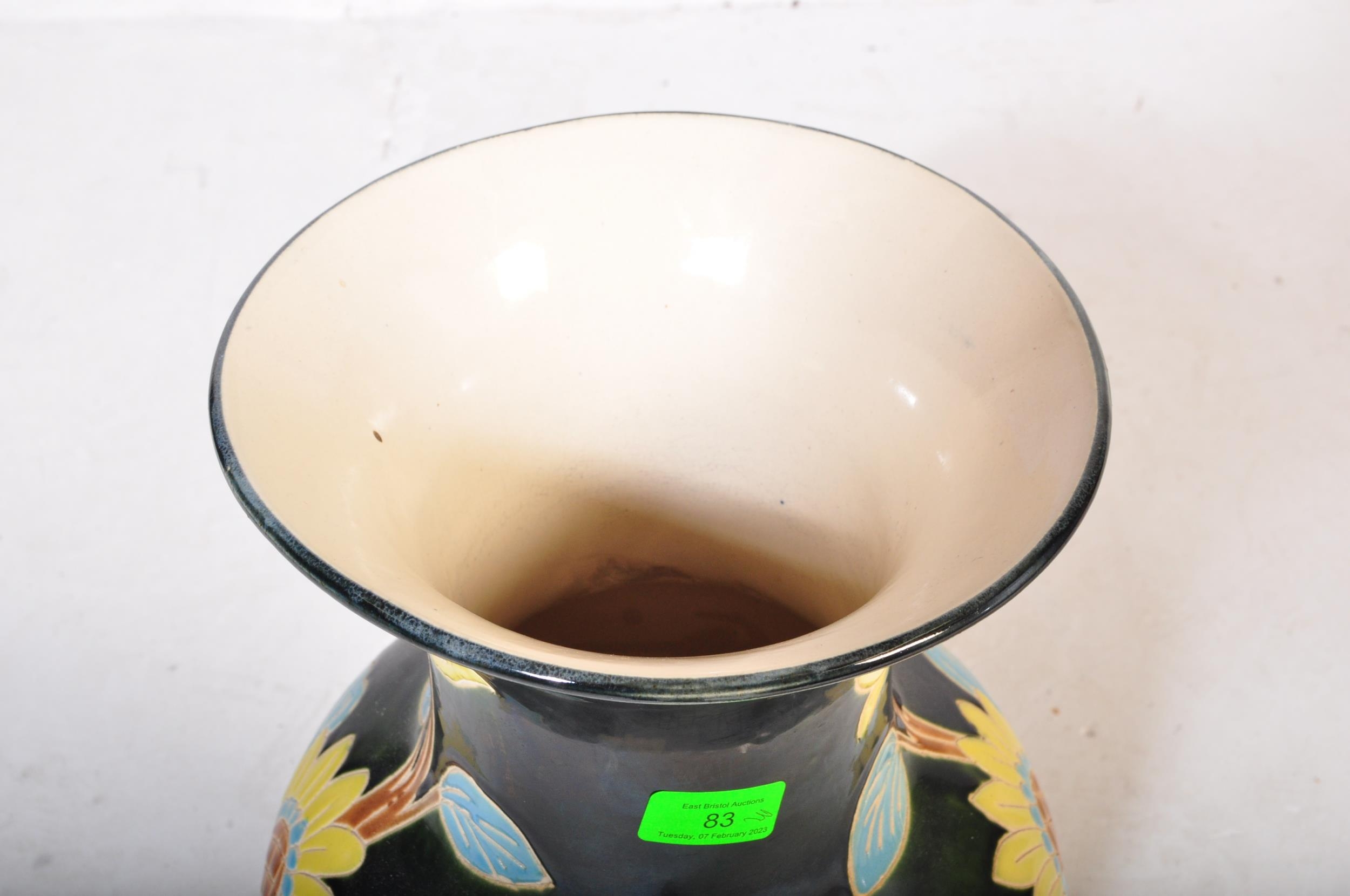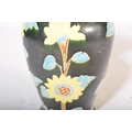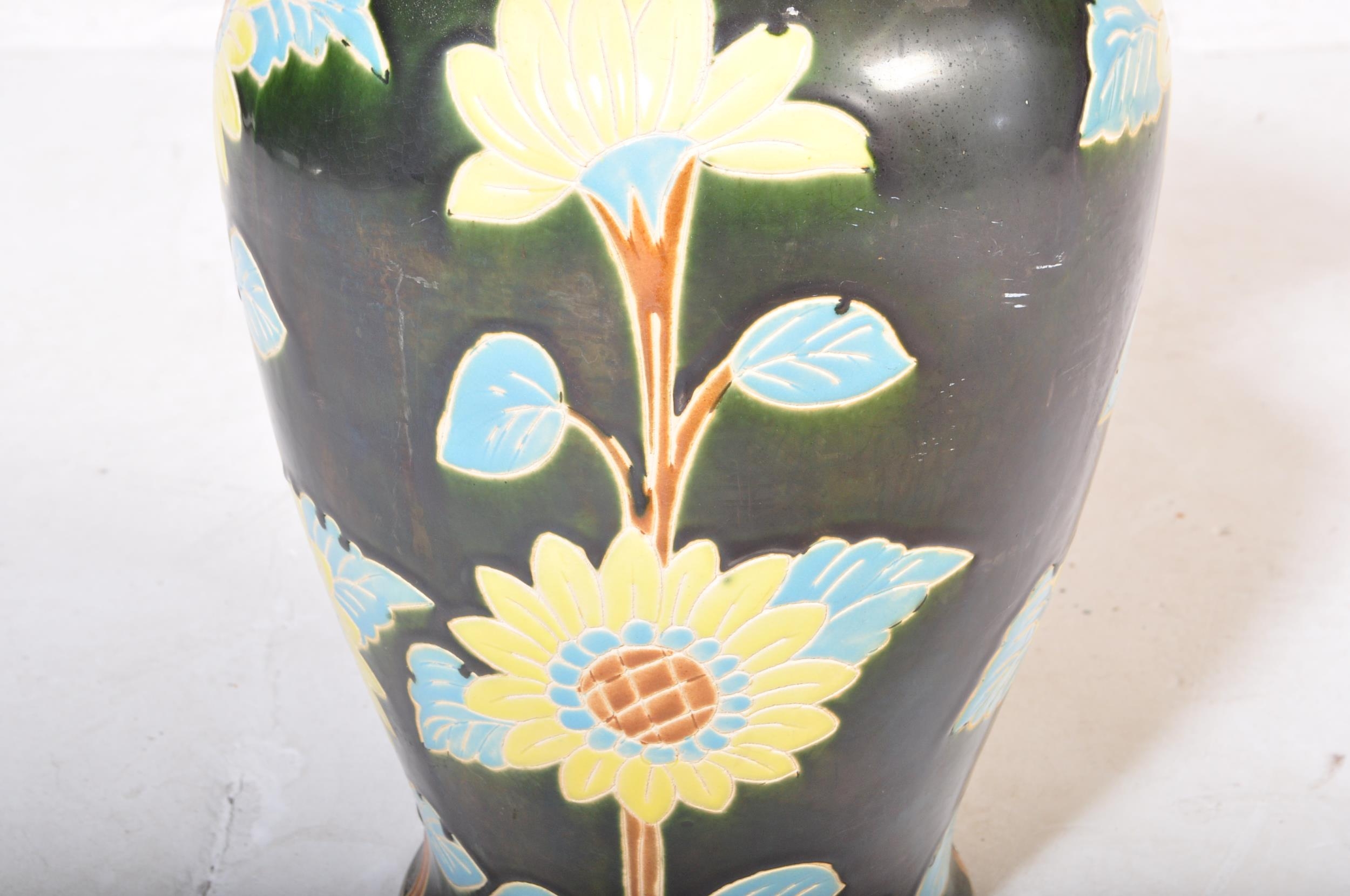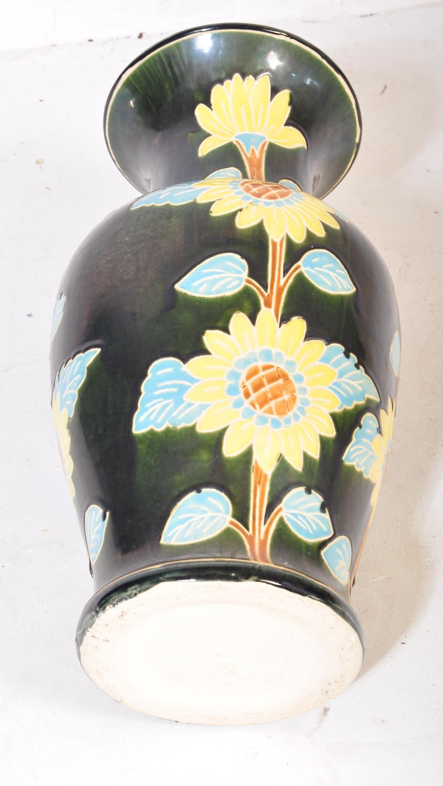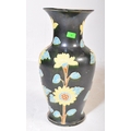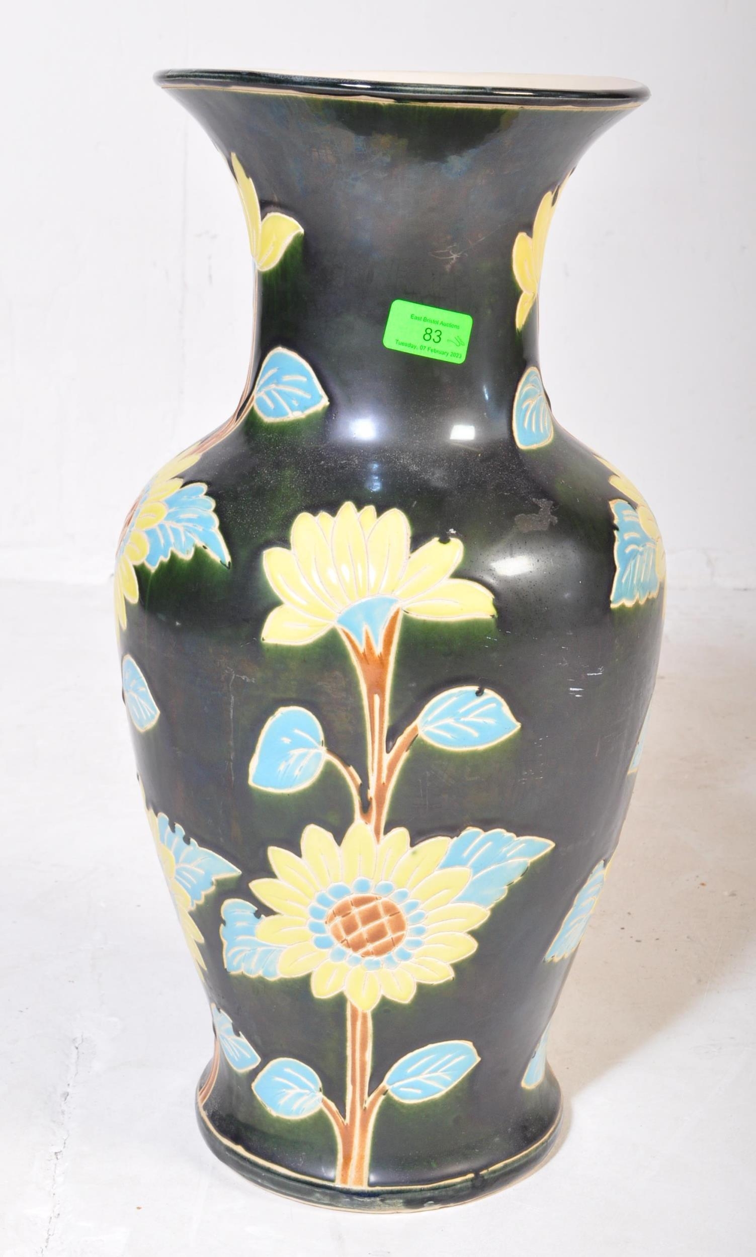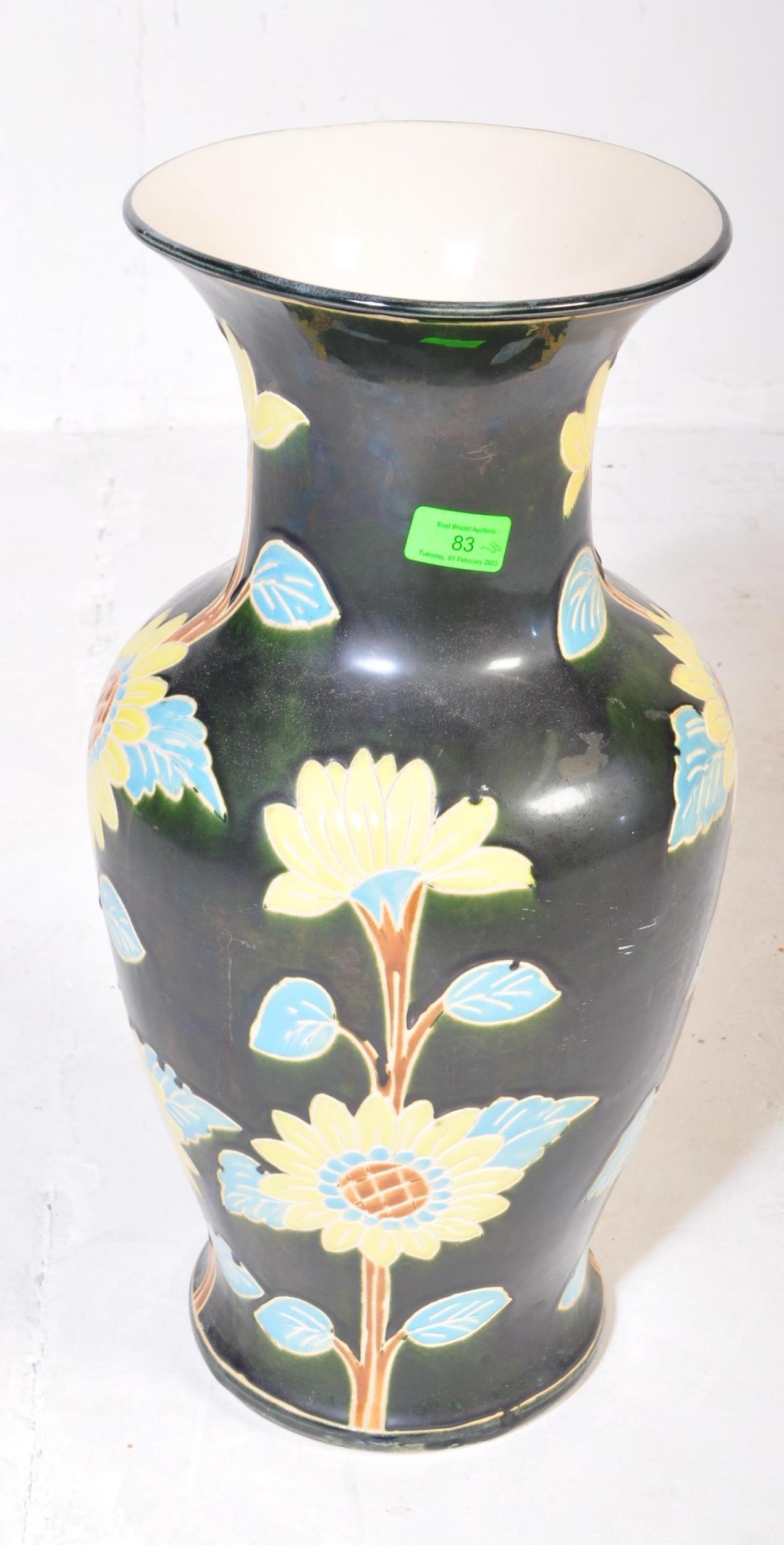 A vintage 20th Century ceramic pottery vase. Having a green ground with foliate and floral painted decoration. No makers mark. Measures approx. 53cm tall.