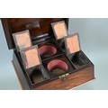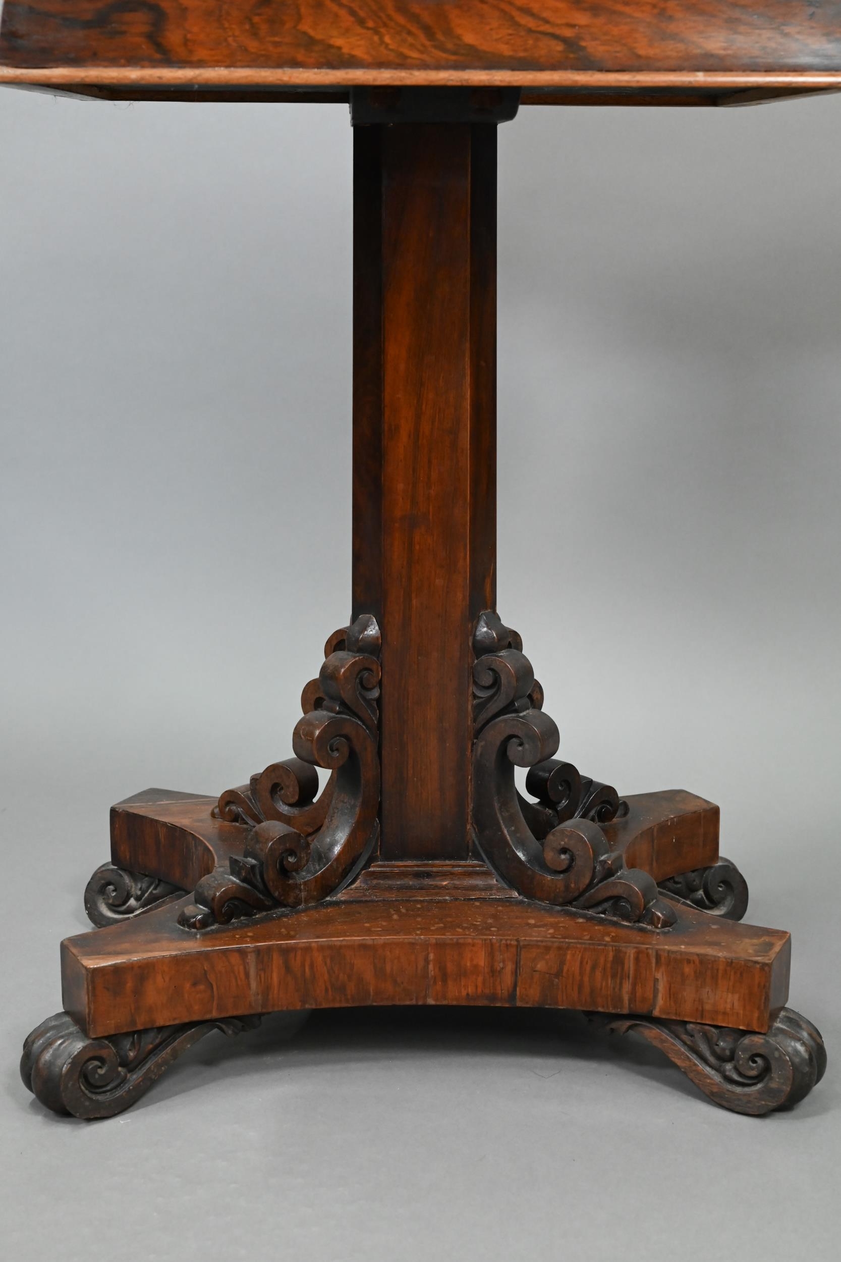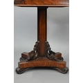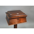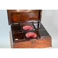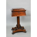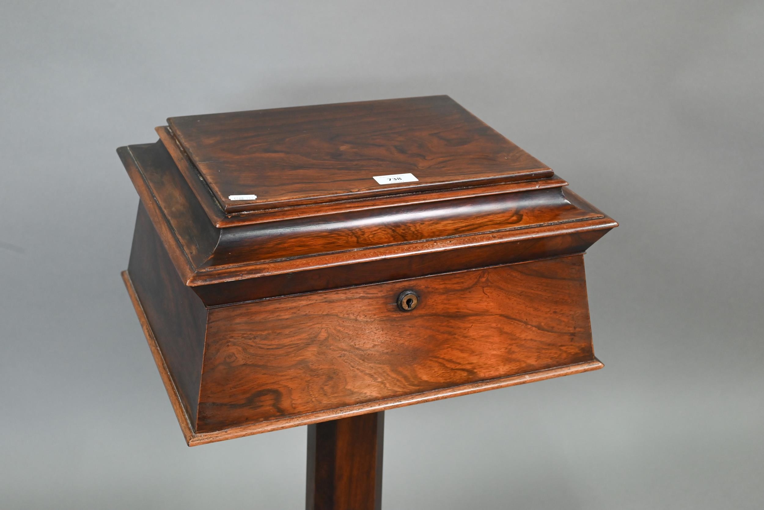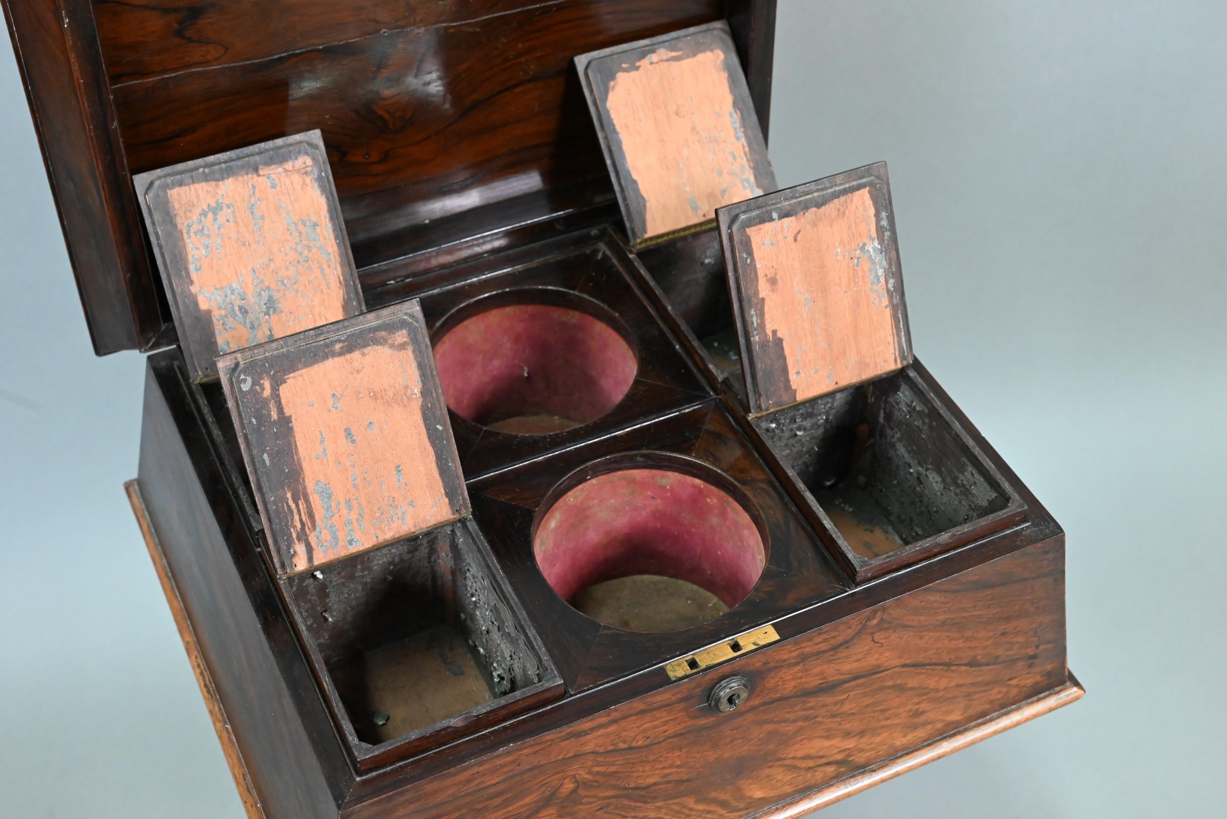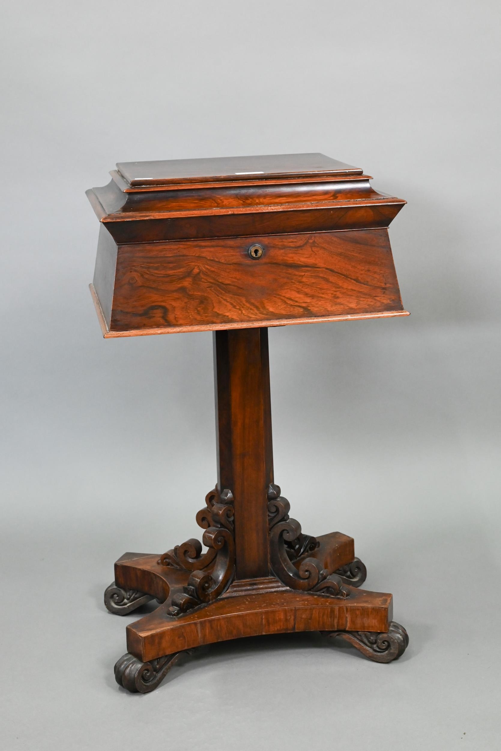 A Regency rosewood sarcophagus form teapoy, the interior with four lidded tea boxes, centred by two circular wells, raised on a platform base on moulded scroll feet, 42 cm x 35 cm x 75 cm h