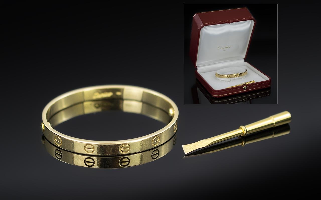 Cartier 18ct Yellow Gold 'Love' Bangle, Decorated with screwhead motifs, signed Cartier and numbered 798917, stamped 750 (Size 17), accompanied by a screwdriver, Cartier red leather fitted case and Certificate