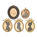 English profilists, 19th century - Silhouettes of Robert Temple of Colne, Lancashire (1811-1851) and his wife Margaret, nee Chaffer and a young lady, possibly Charlotte Gidley, cut paper, one heightened in gilt, oval 78mm and smaller, in matching neo classical style gilt brass frames crested by a ribbon bow, and two other portraits (5)