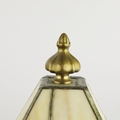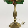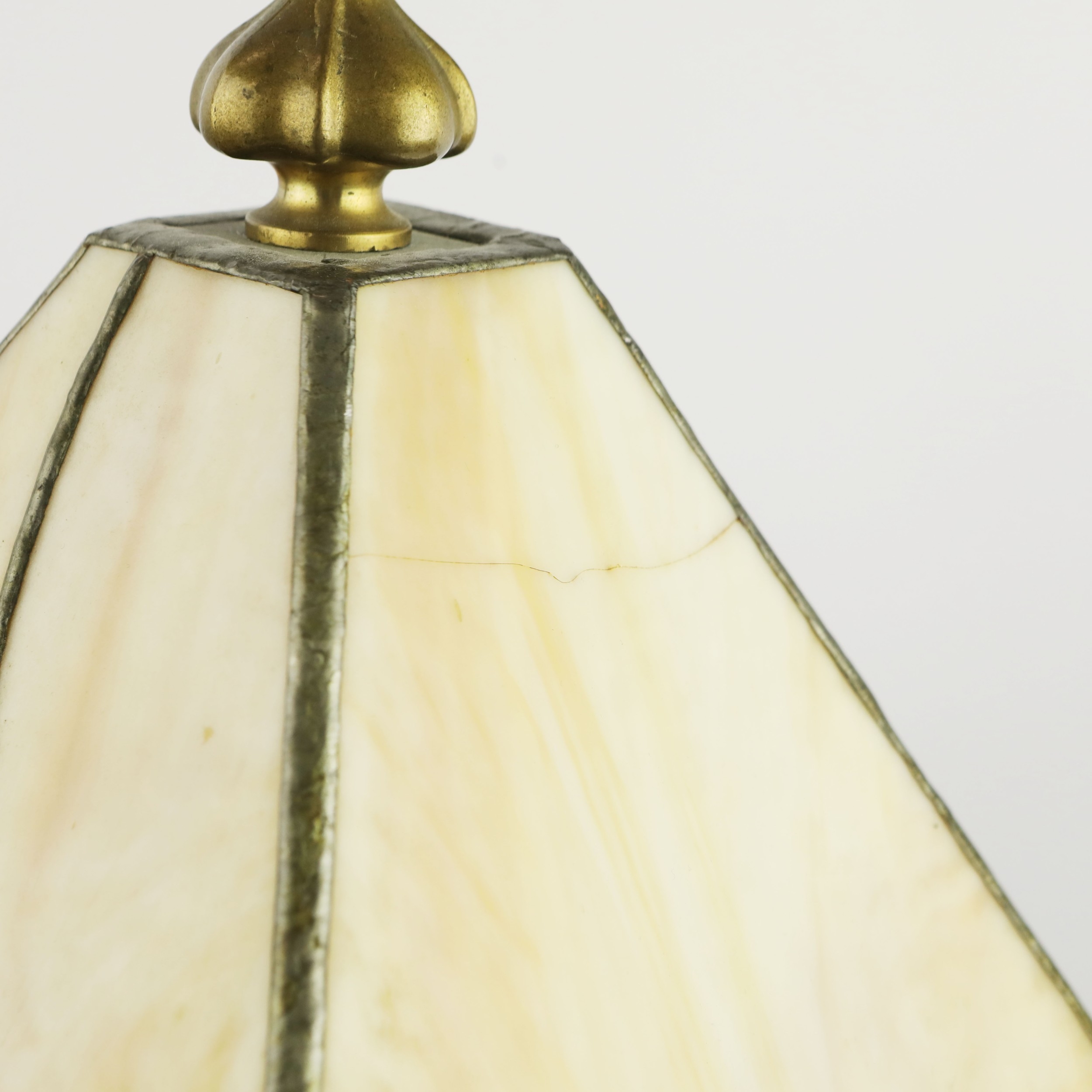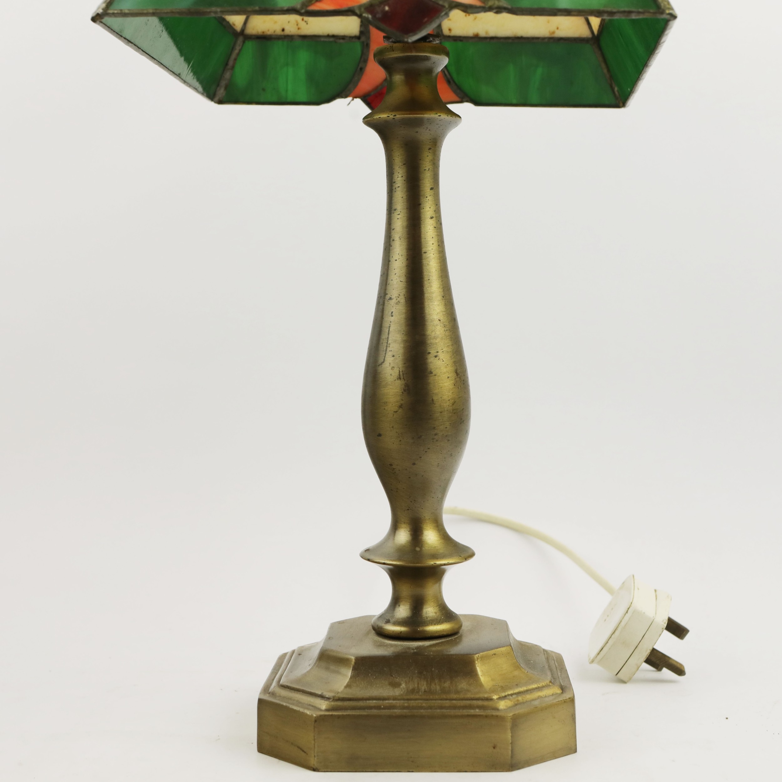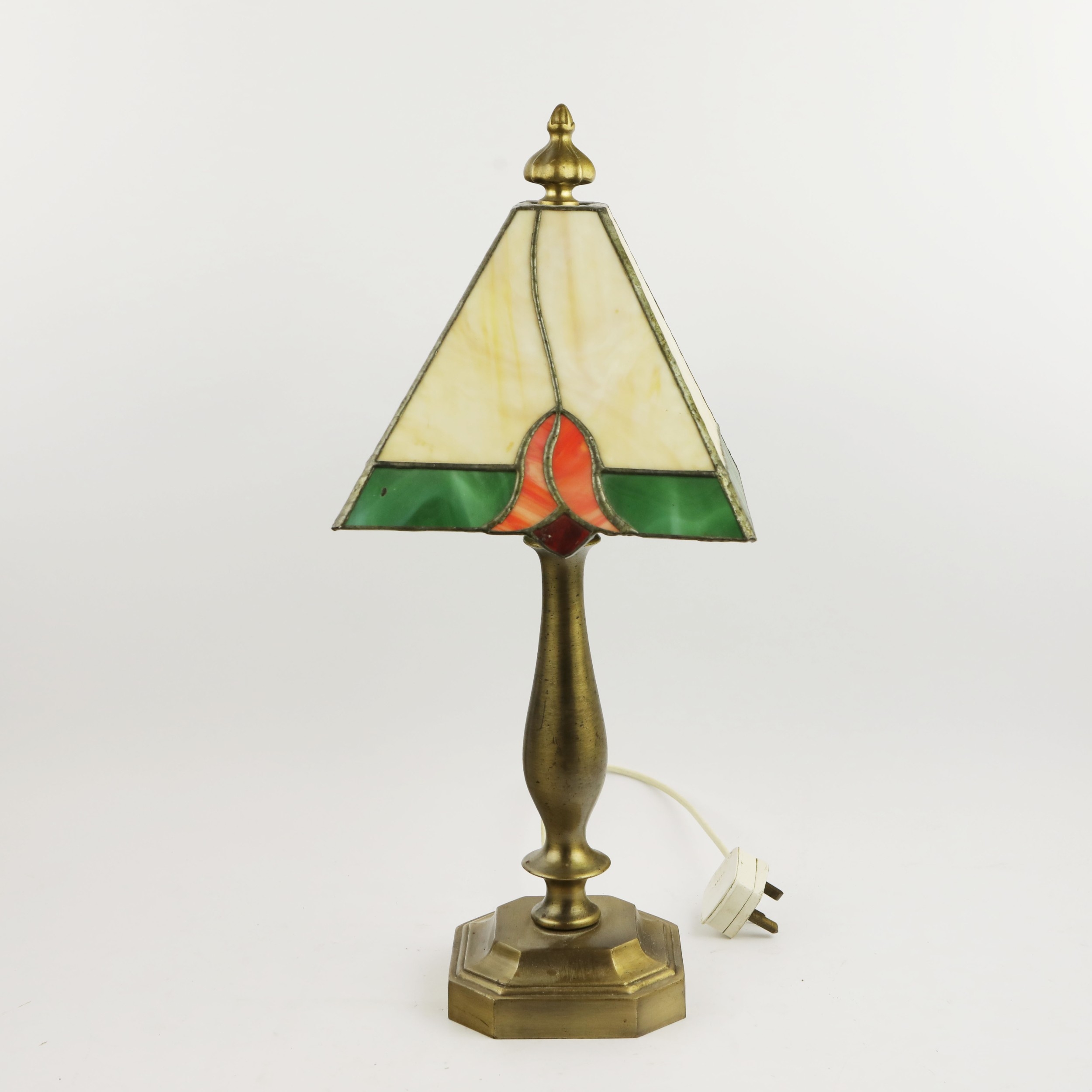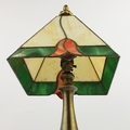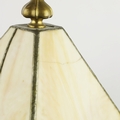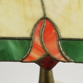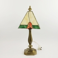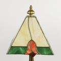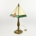 TIFFANY STYLE TABLE LAMP. fitted with a four sided shade in cream and green, raised on a brass lamp base, 51cm high.