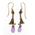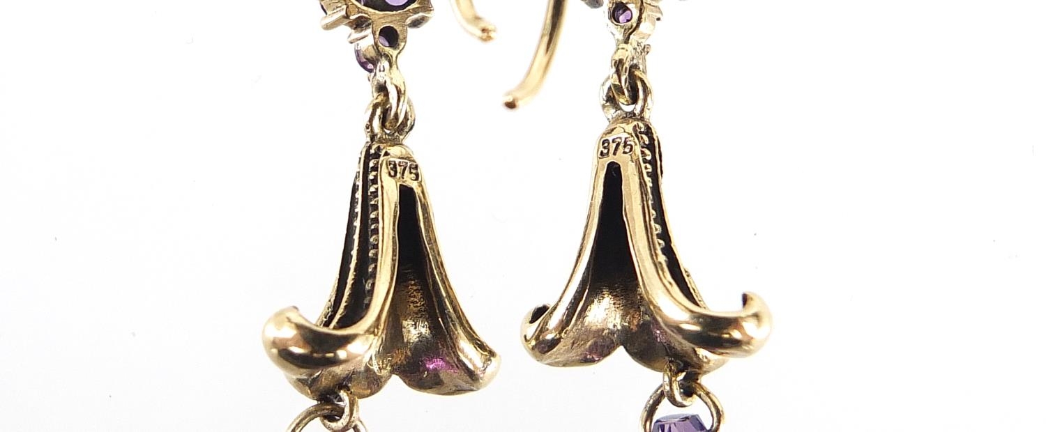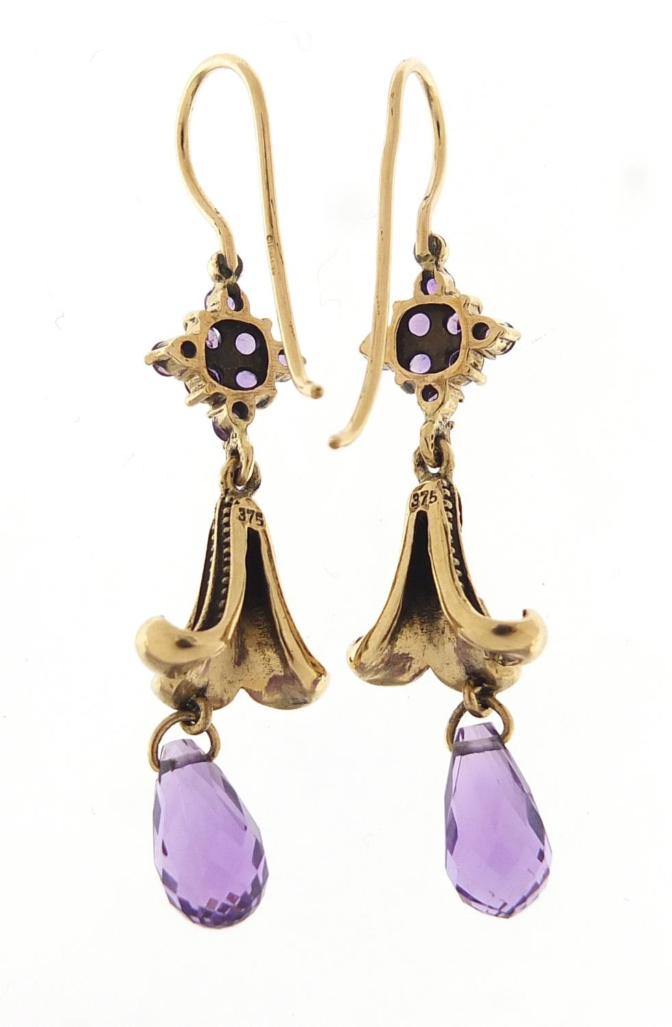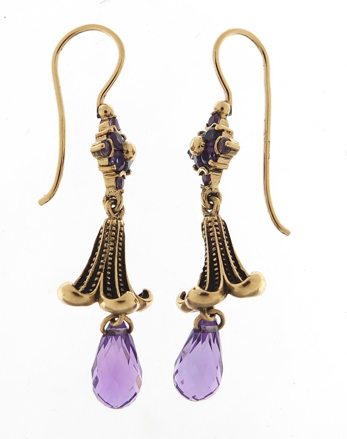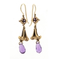 Pair of 9ct gold amethyst drop earrings, 5cm high, 6.0g