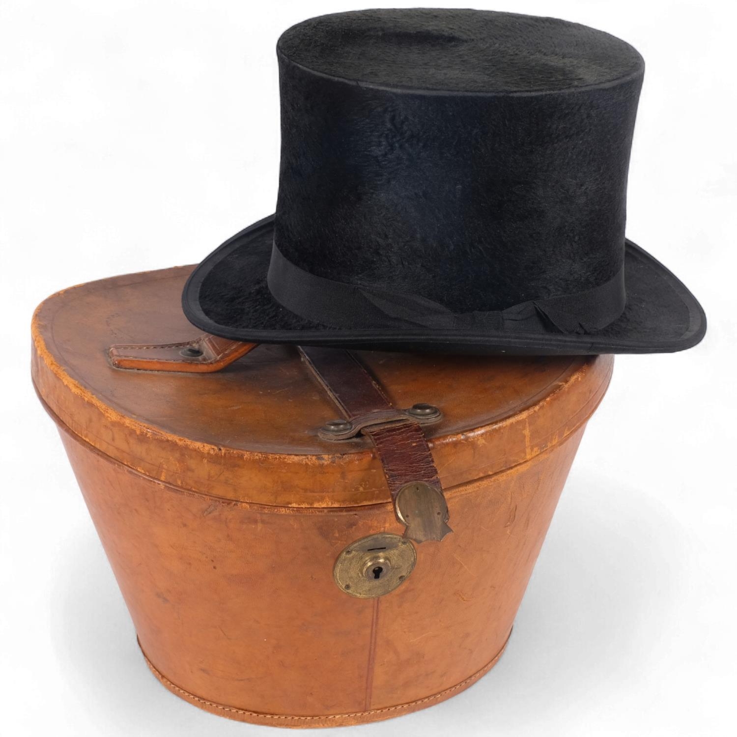 A Victorian and leather hat box, together with a black top hat, London Manufacturer, Durable, internal L19.5cm, W15.5cm, overall L30cm x 25cm
