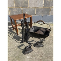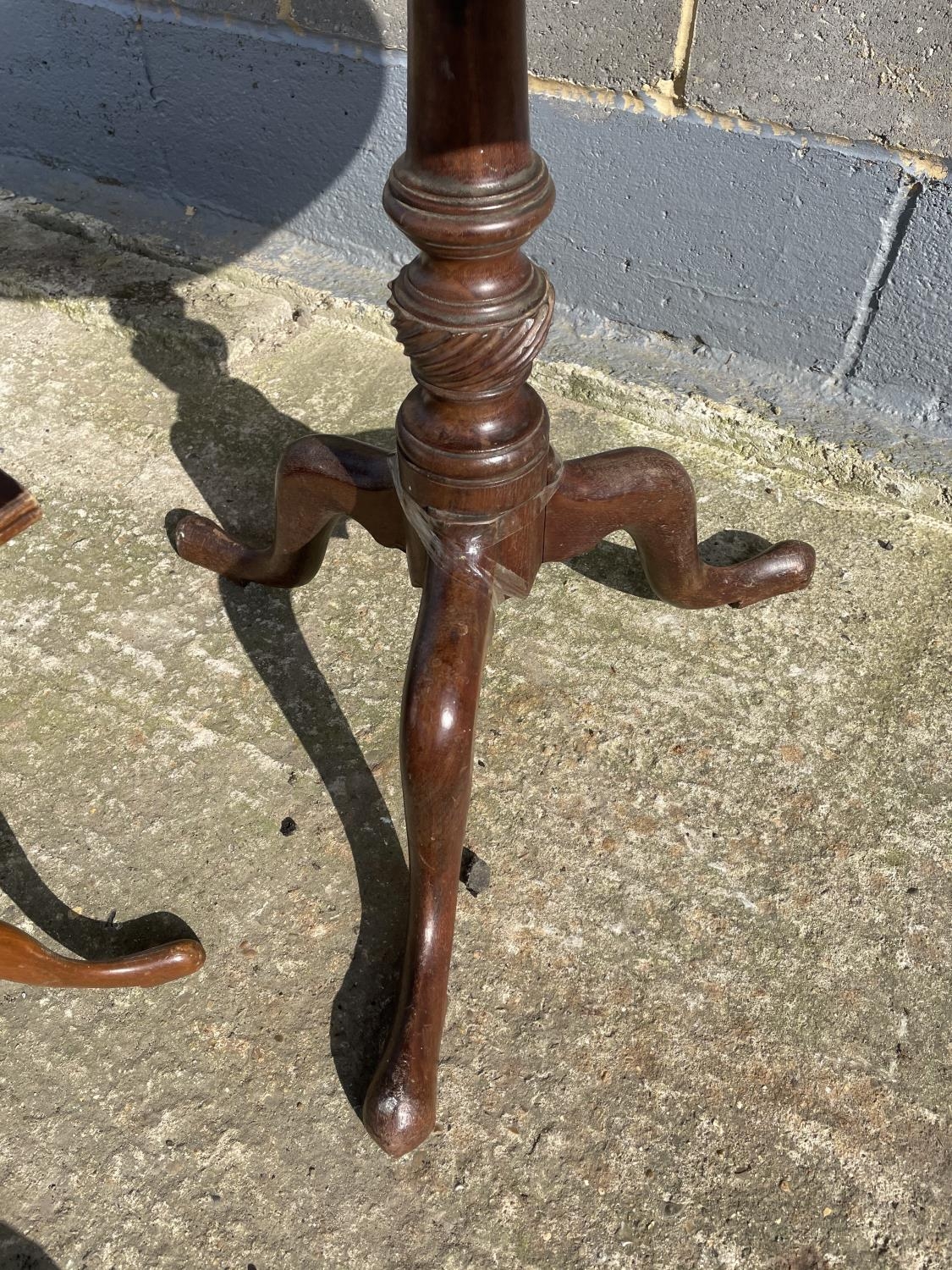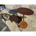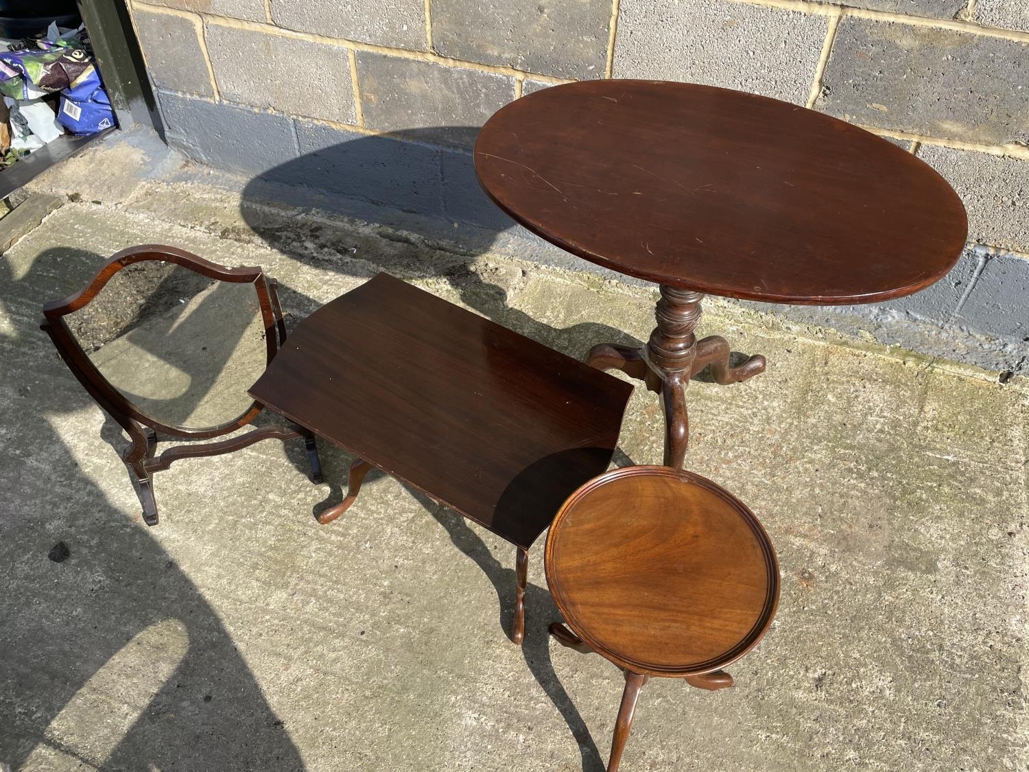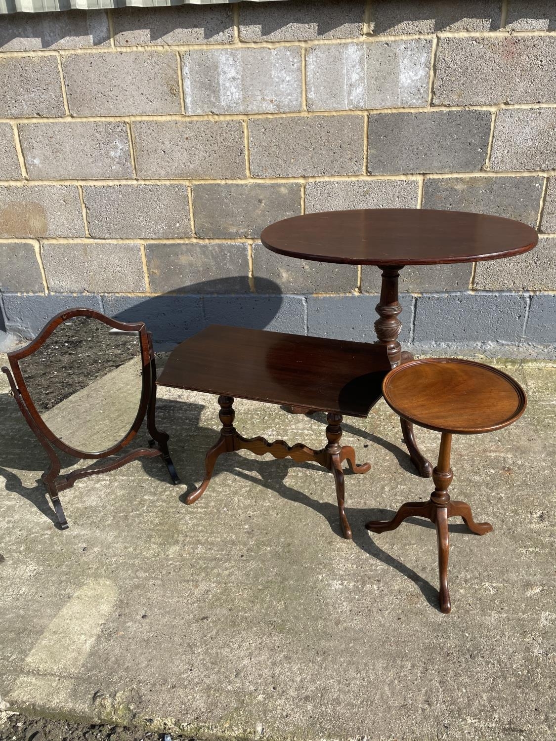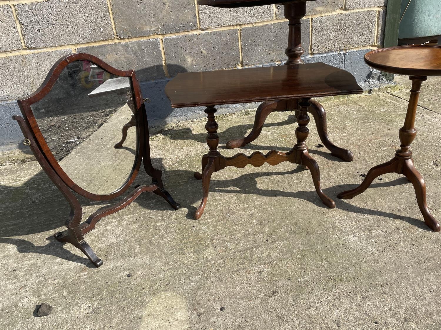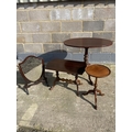 A Victorian mahogany oval snap top table (af) together with two mahogany occasional tables and a swing mirror