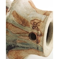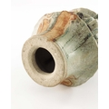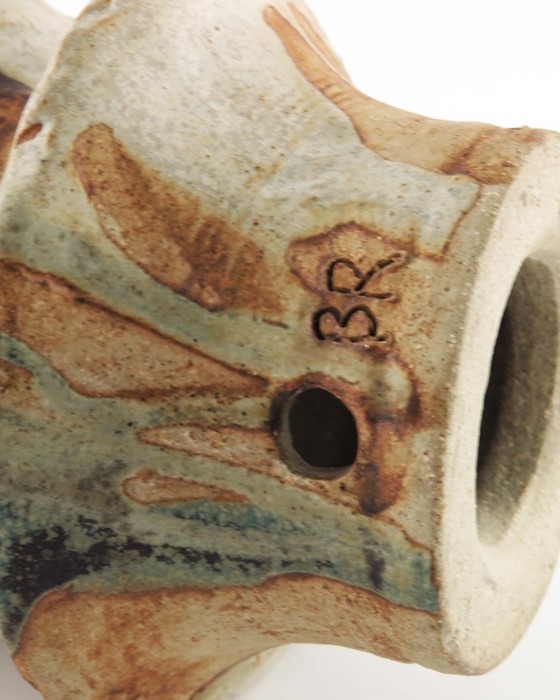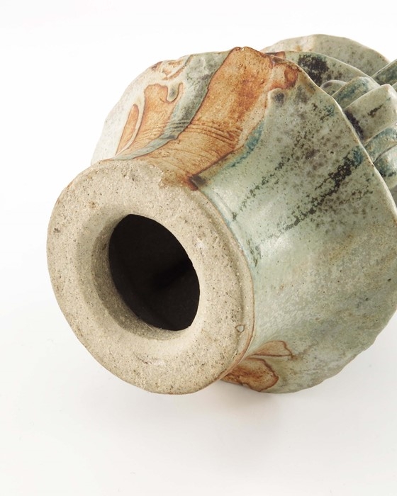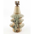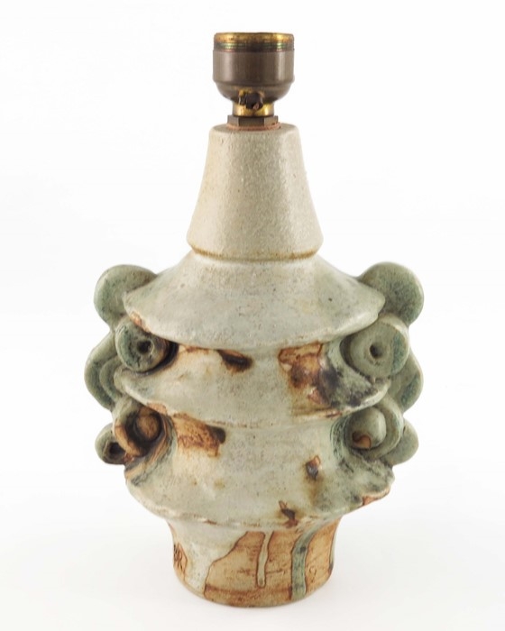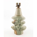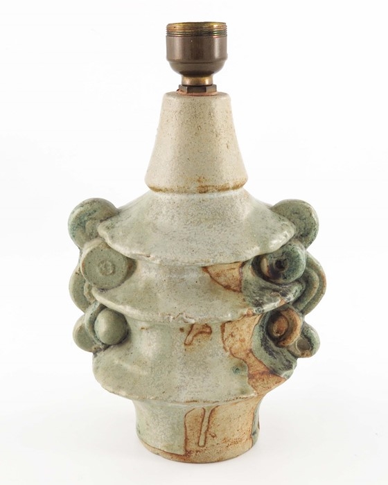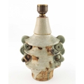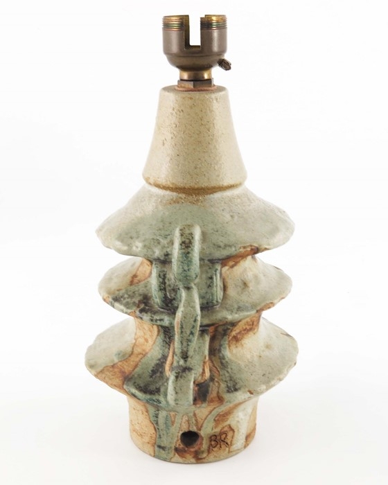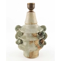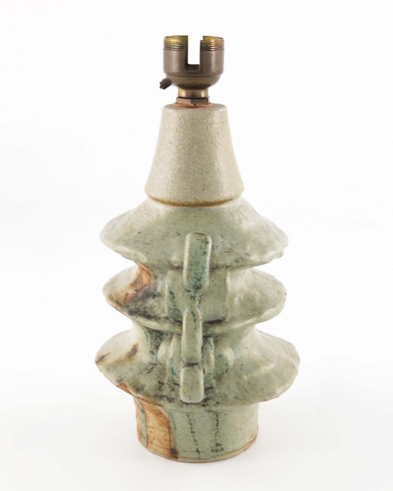 Bernard Rooke (b.1938), a studio pottery lamp base, relief moulded with bladed steps and naturalistic tube and ring handles, incised mark, 21.5cm high to fitting