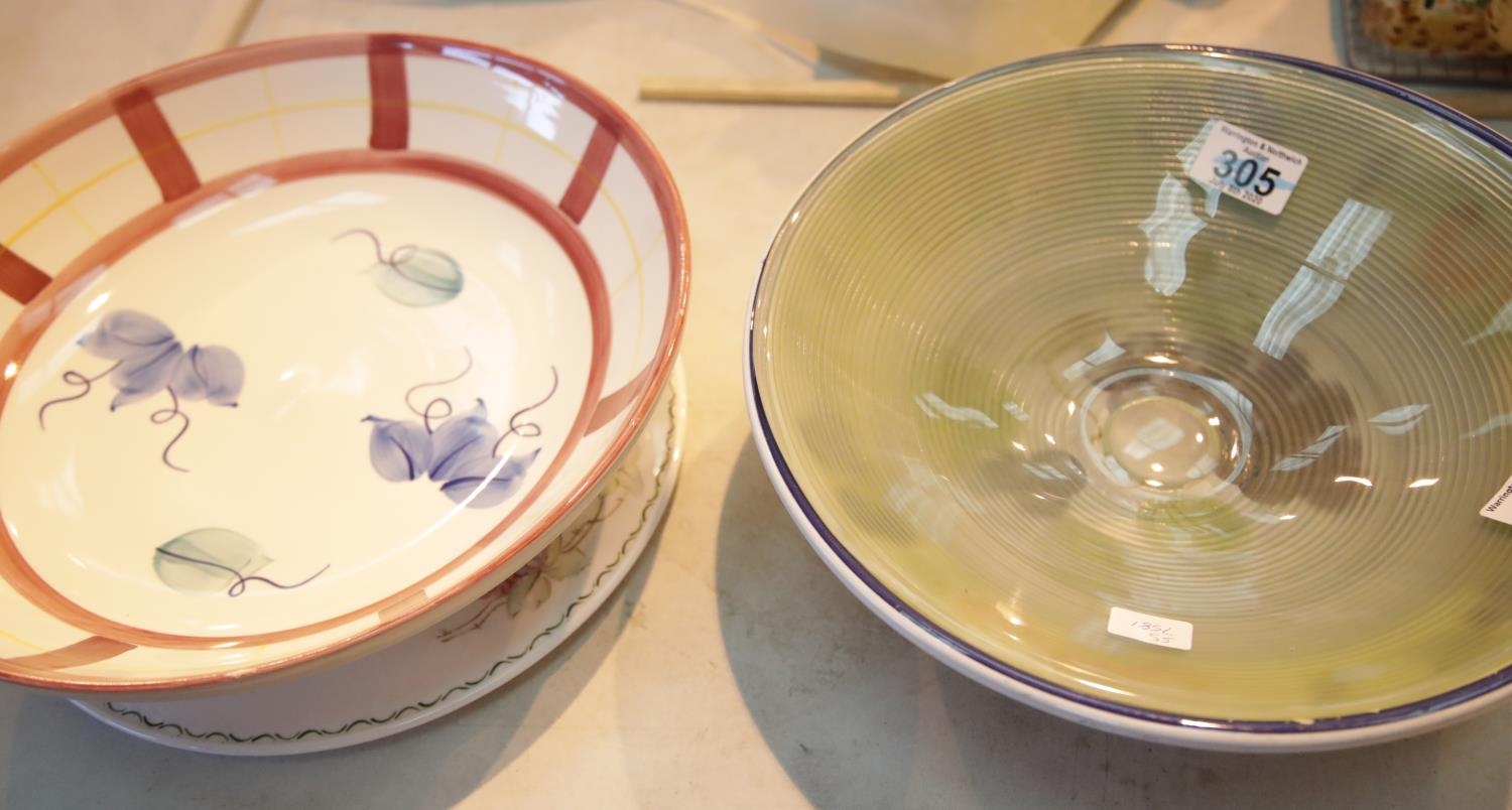 Two large ceramic bowls, a glass bowl and a charger. This lot is not available for in-house P&P.