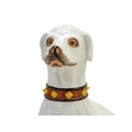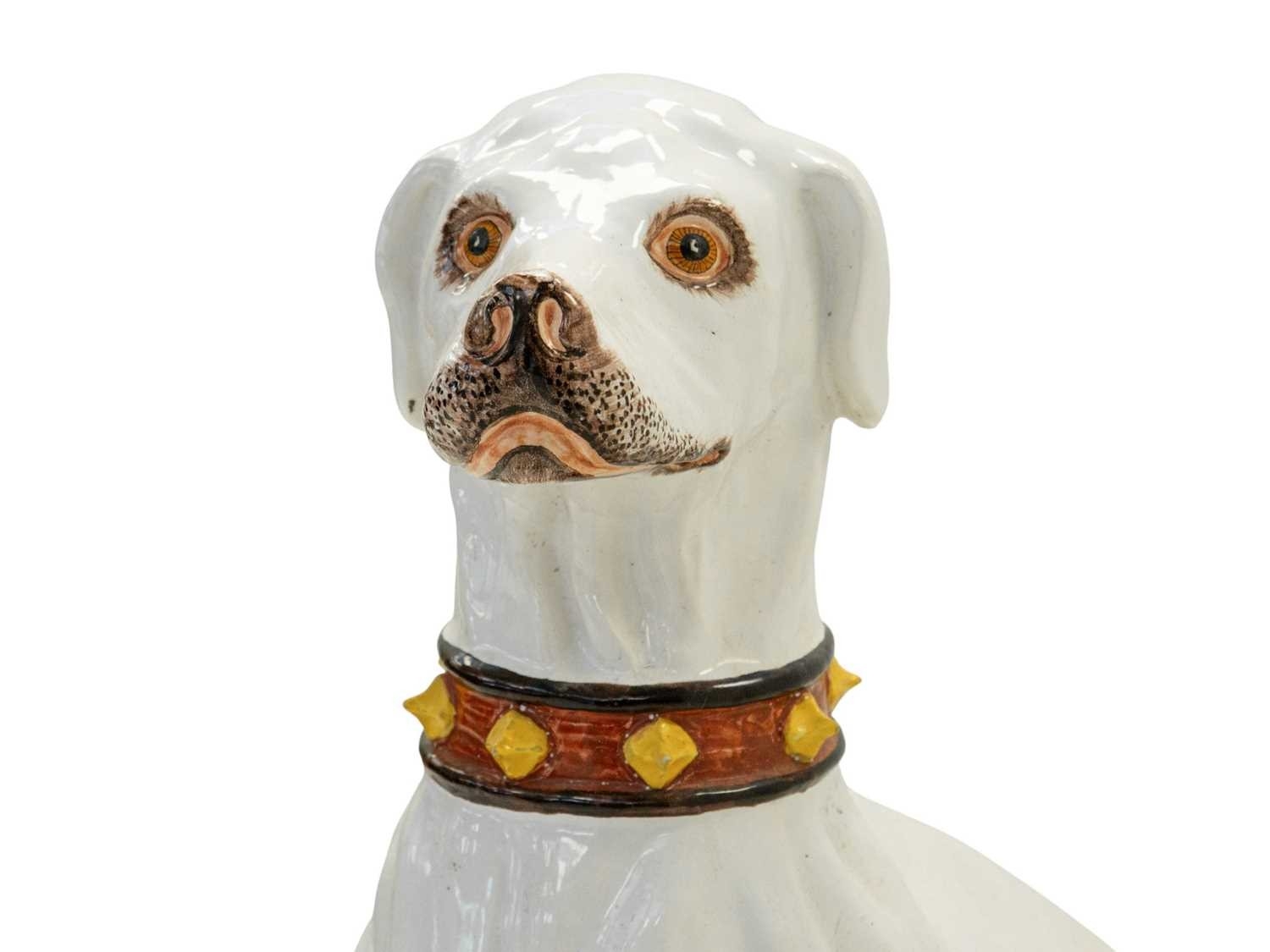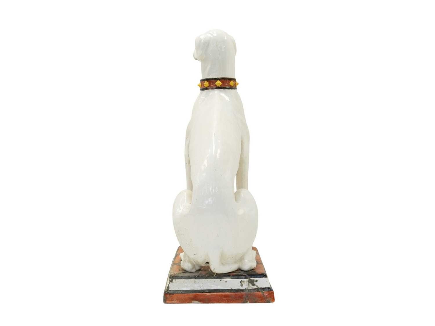 A remarkable life size Italian faience model of a seated greyhound. 19th century, sporting a painted collar and seated upon a painted rectangular base, height 98cm.
