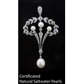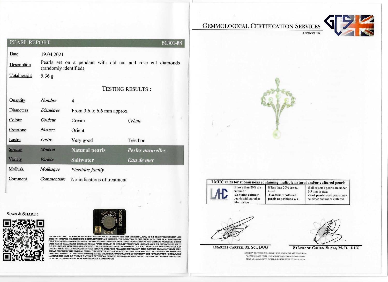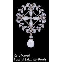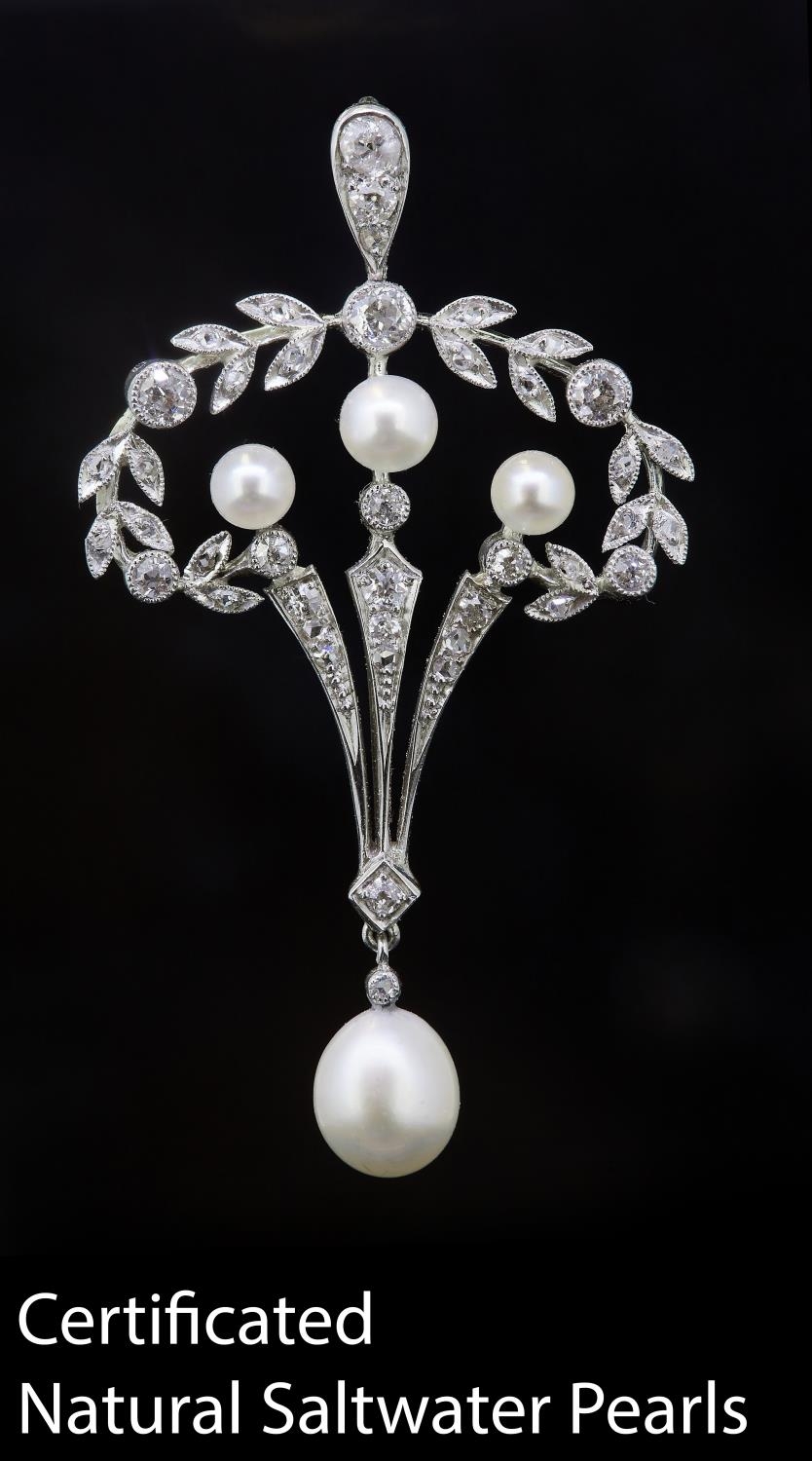 BELLE-EPOQUE NATURAL SALTWATER PEARL AND DIAMOND PENDANT, the pendant of part wreath dsign, set with diamonds and accentuated with 3 pearls to the centre, with a 3-row diamond drop to the center suspending a larger natural saltwater pearl. L. 5.2 cm. 5.4 grams. With a fitted box. Accompanied by GCS London report No. 81301-85 stating that the 3.6 to 6.6 mm. pearls are natural, Saltwater origin, Cream colour, orient overtone, Very good Lustre.