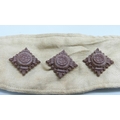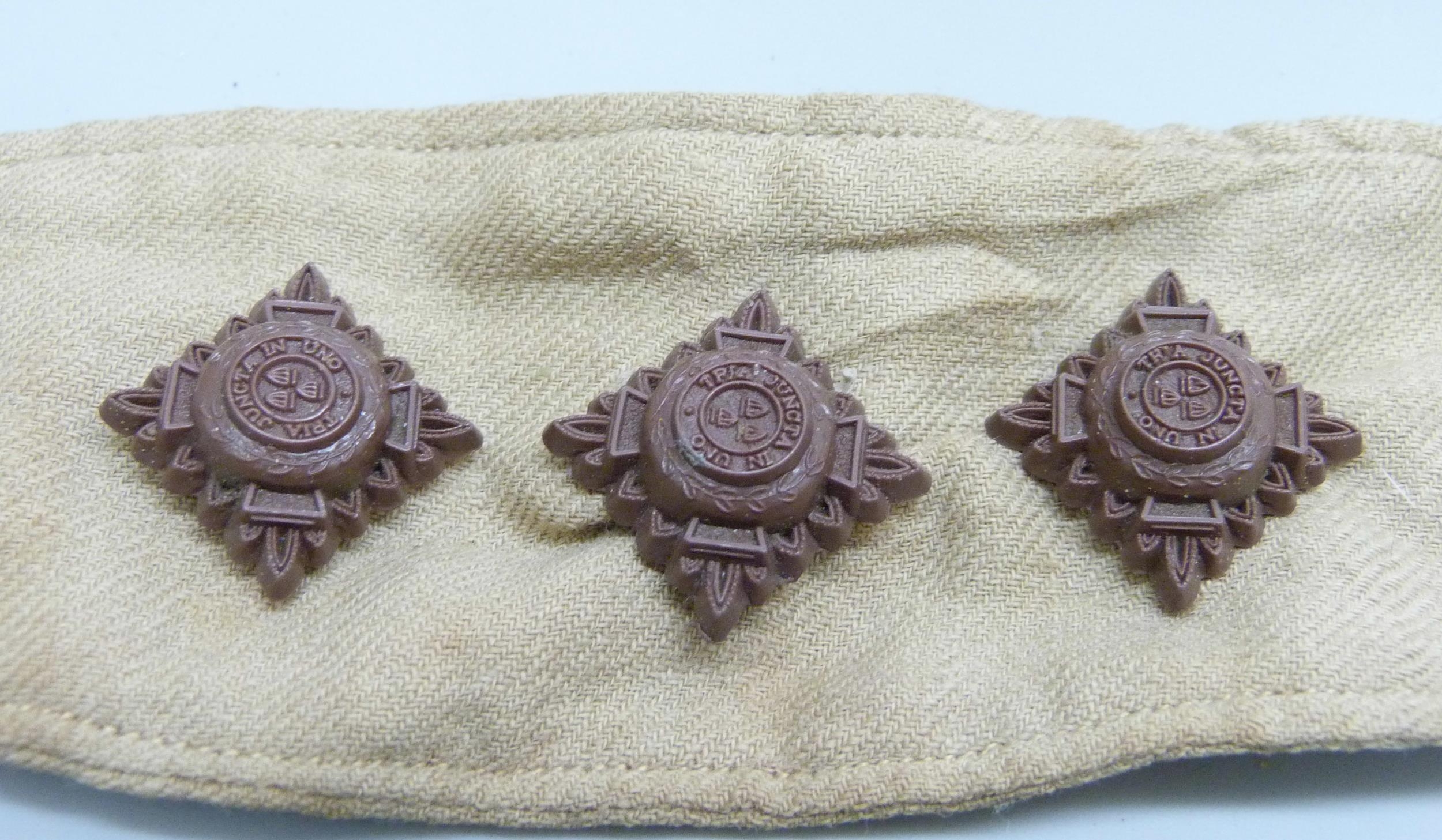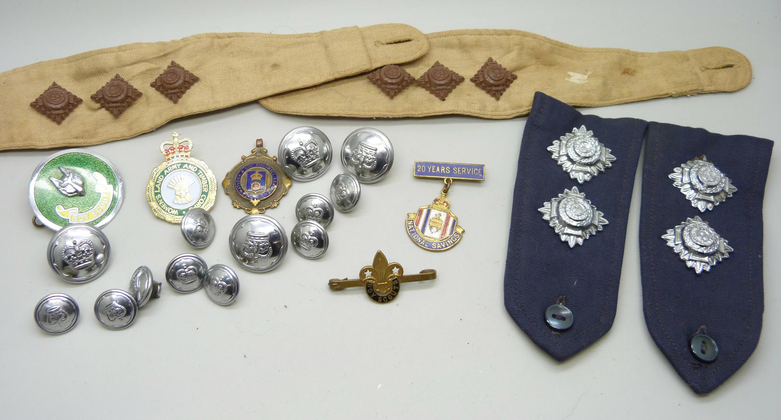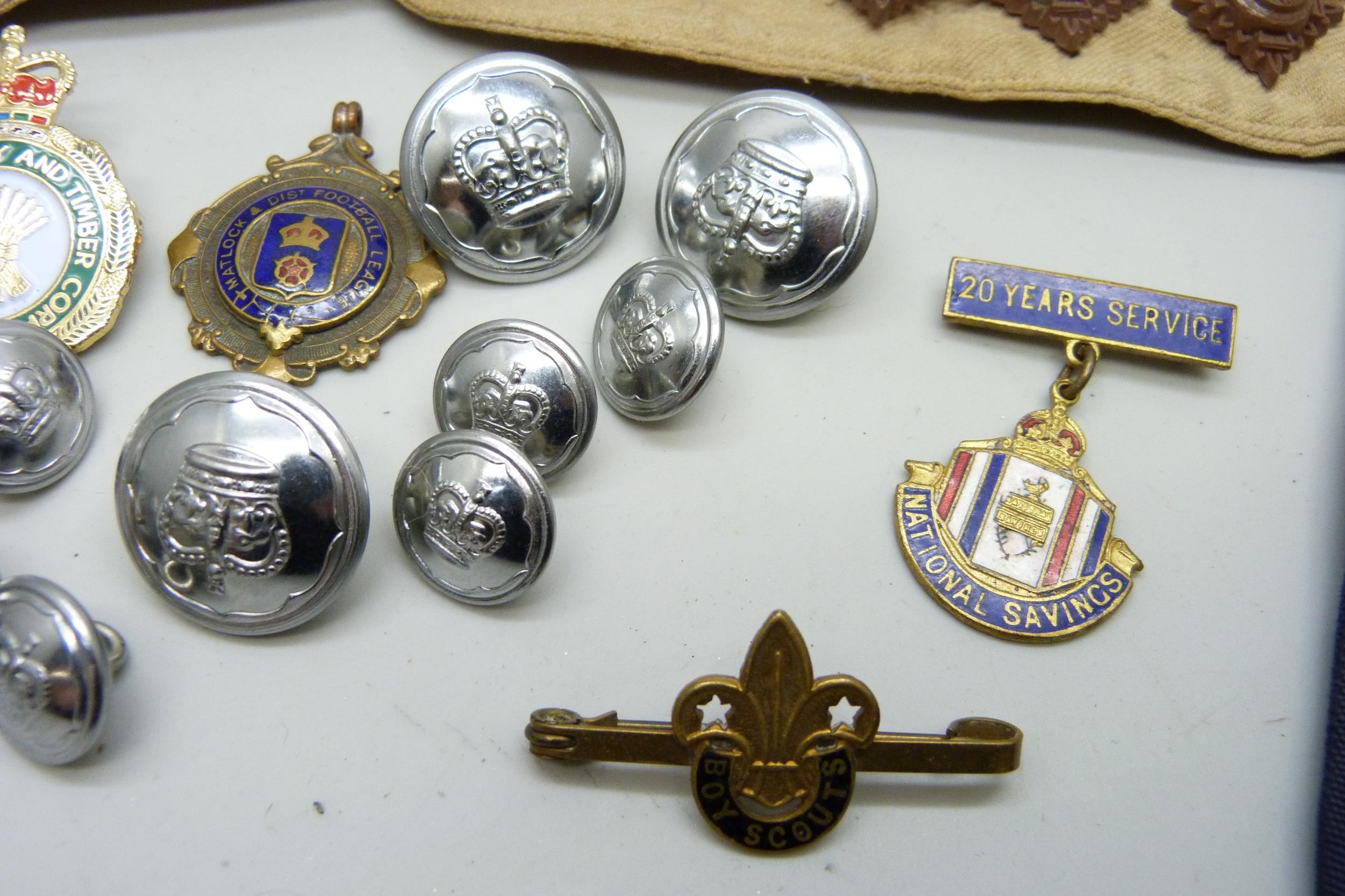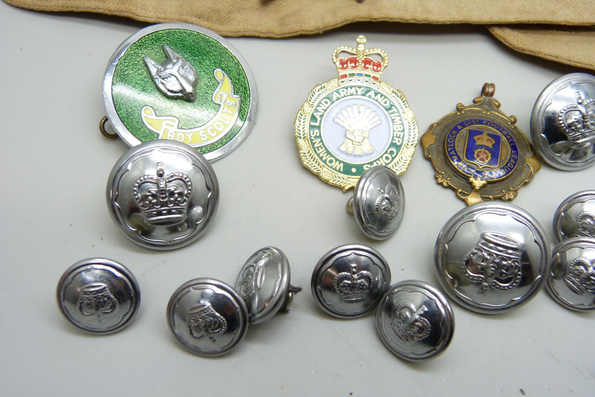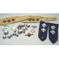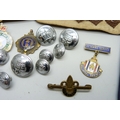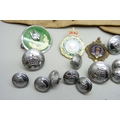 A collection of mixed badges and buttons including military