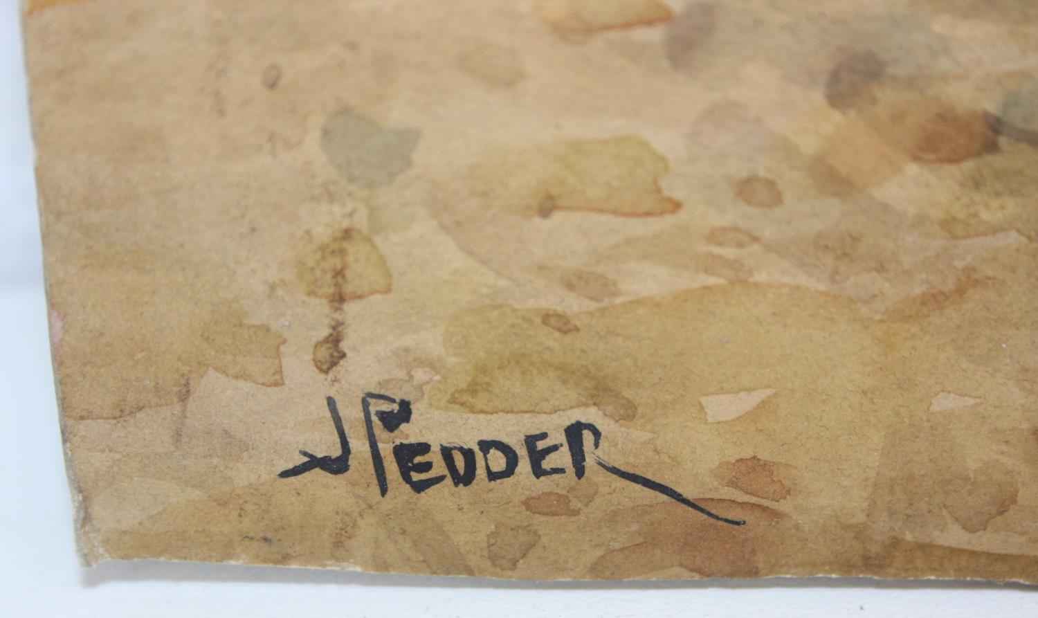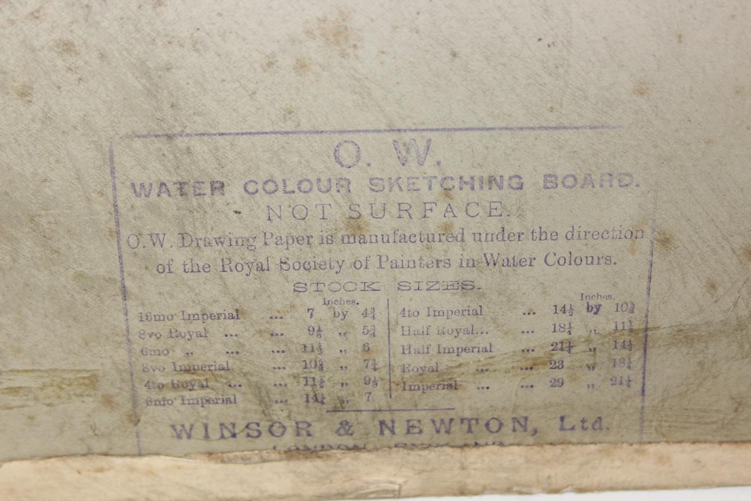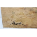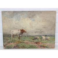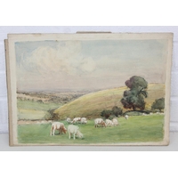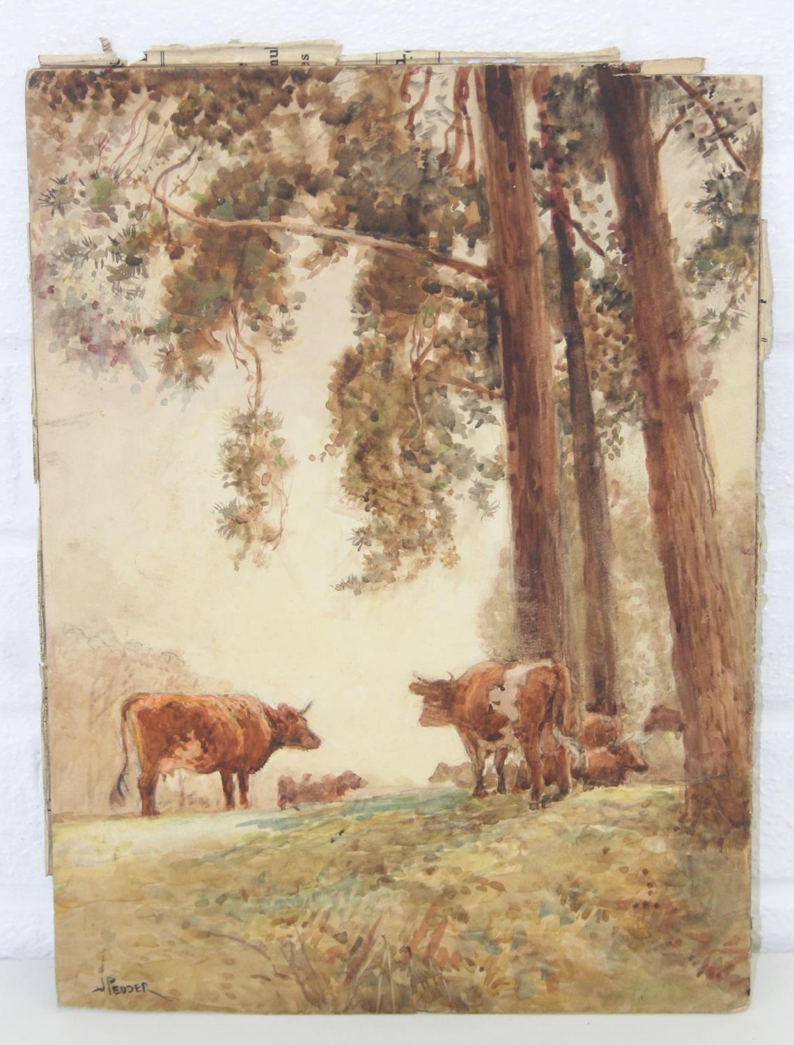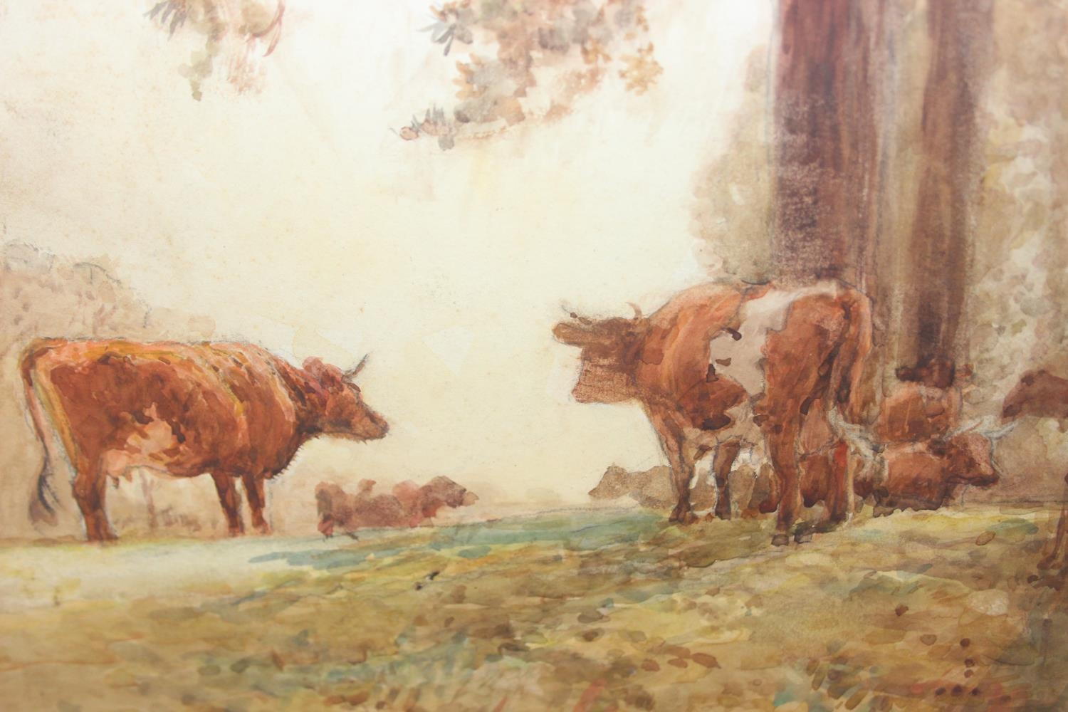 watercolour on paper mounted on board depicting cows grazing in woodland,