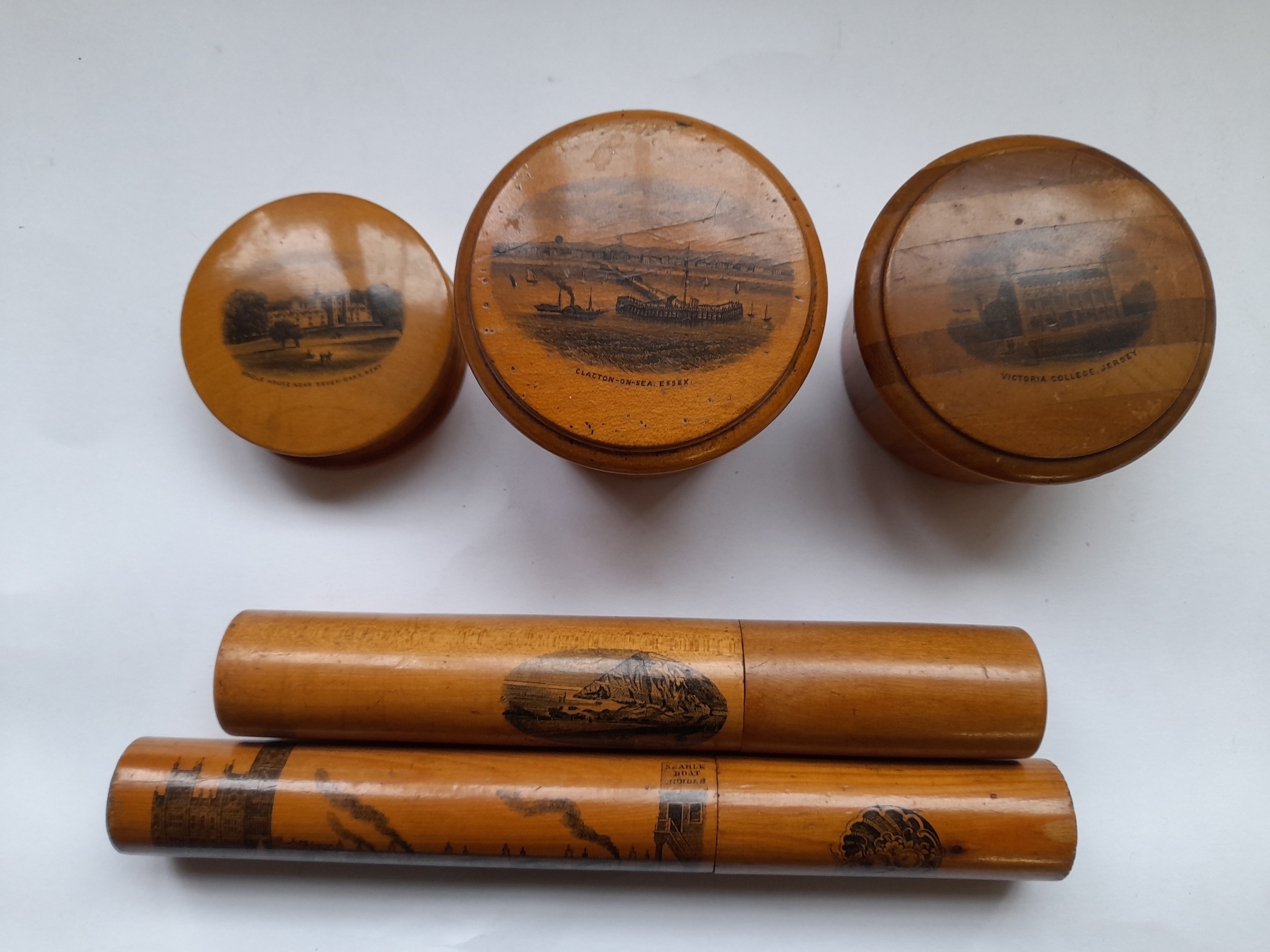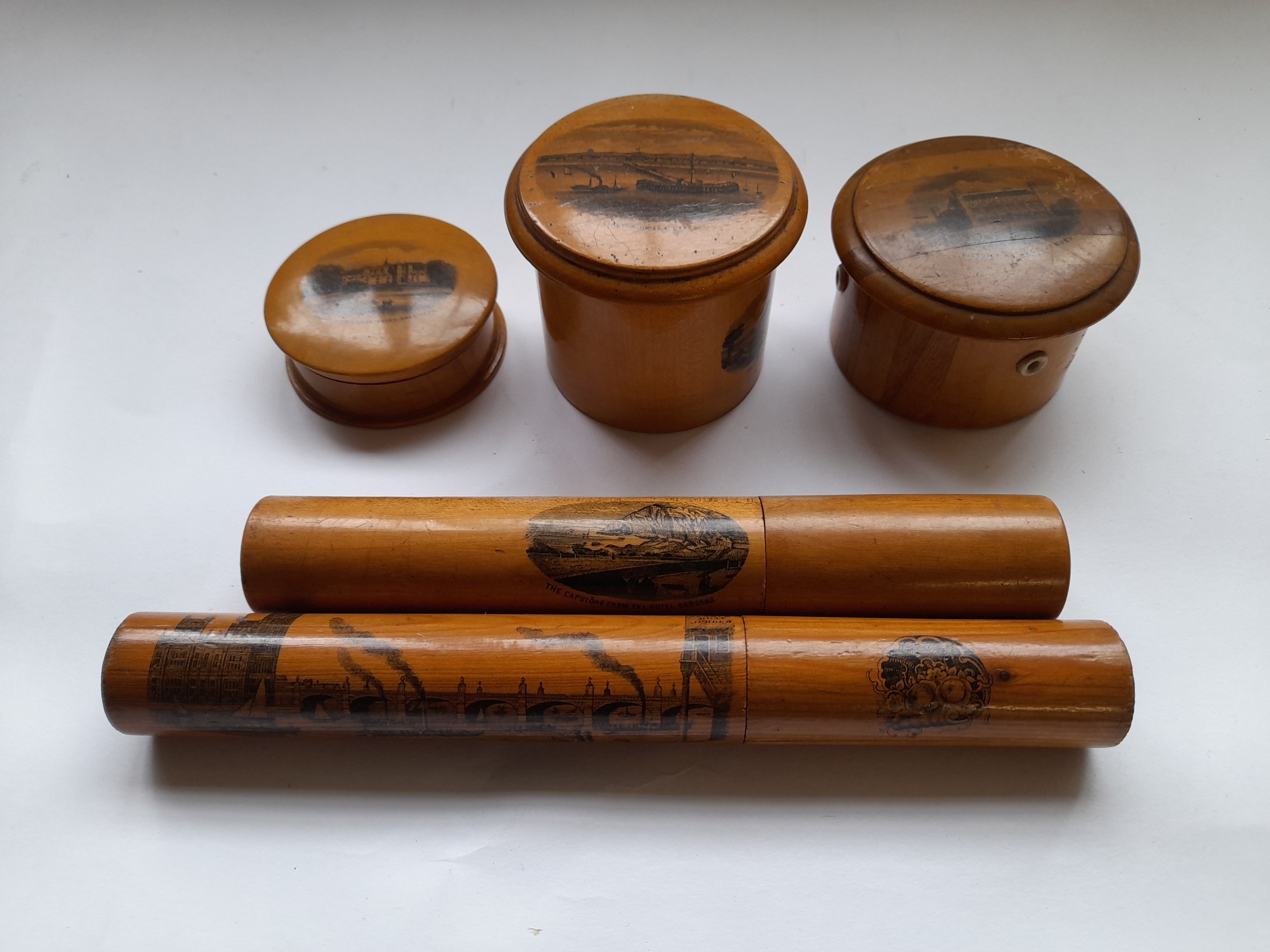4 x pieces of Mauchline ware and a turned pine cigar holder. (5)