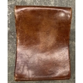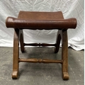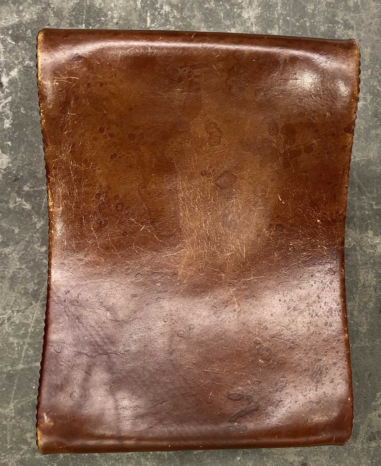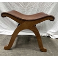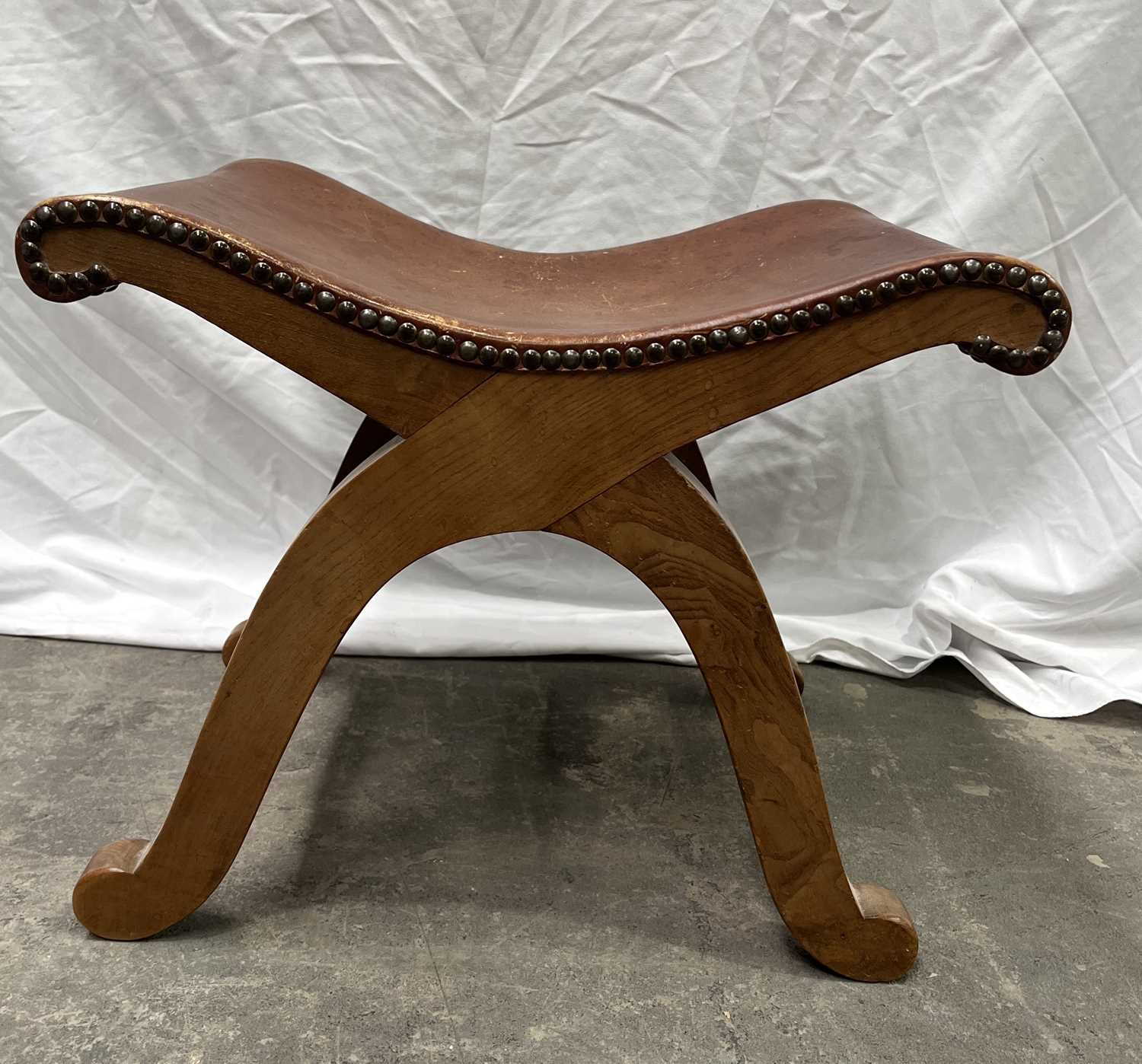 A Spanish wood and leather x-frame stool, 20th century, Probably by Pierre Lottier for Valmazan, upholstered in tan leather with brass studding, turned stretchers, marked to the underside 'Valmazan Made In Spain', height approx 37cm, width 47cm, depth 35cm (1)