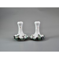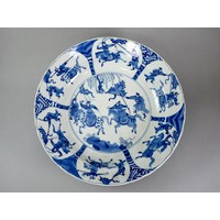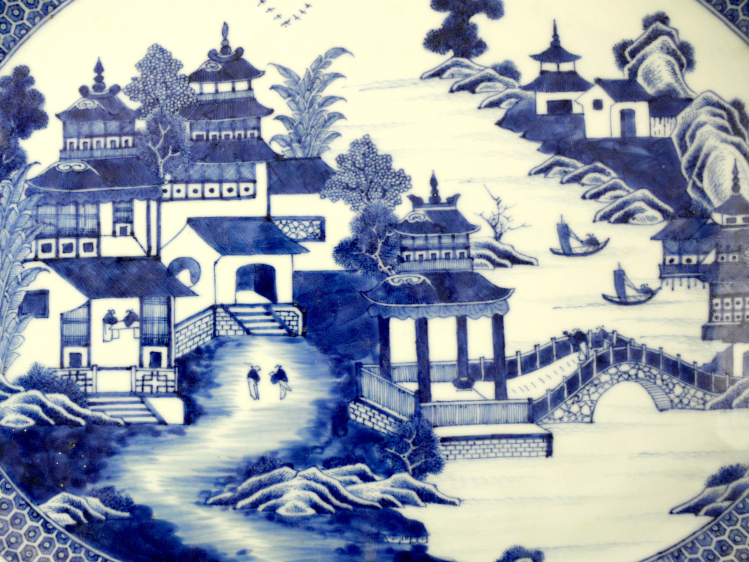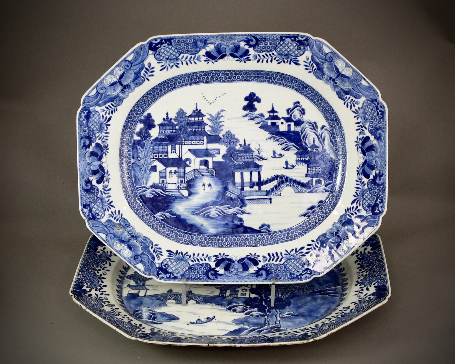 Both with a well painted central medallion of a bridge and lakeside pavilions, the rim with a butterfly and diaper panel border.