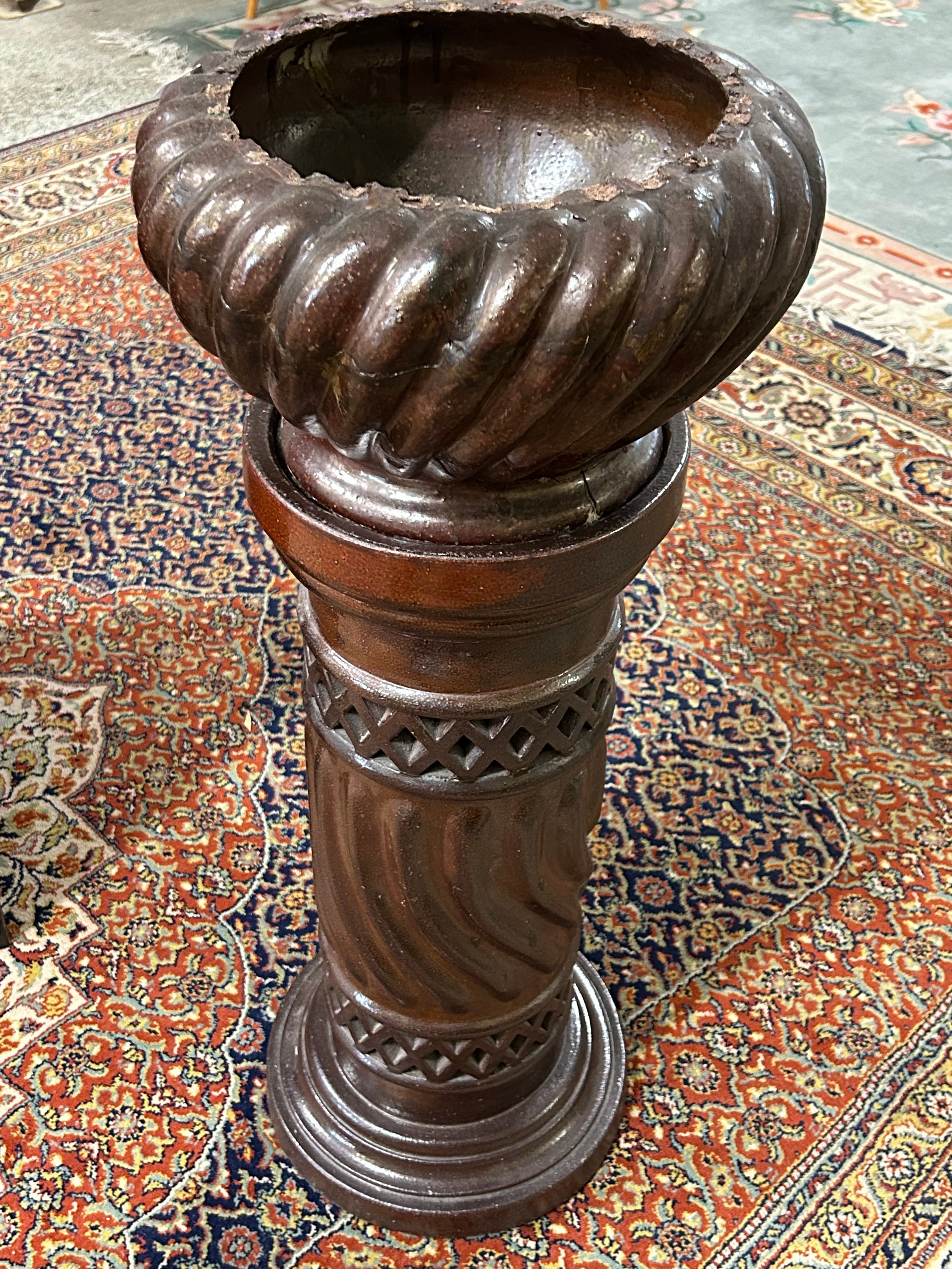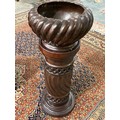 A brown glazed pottery jardiniere of wrythen form, on column - 33in. high