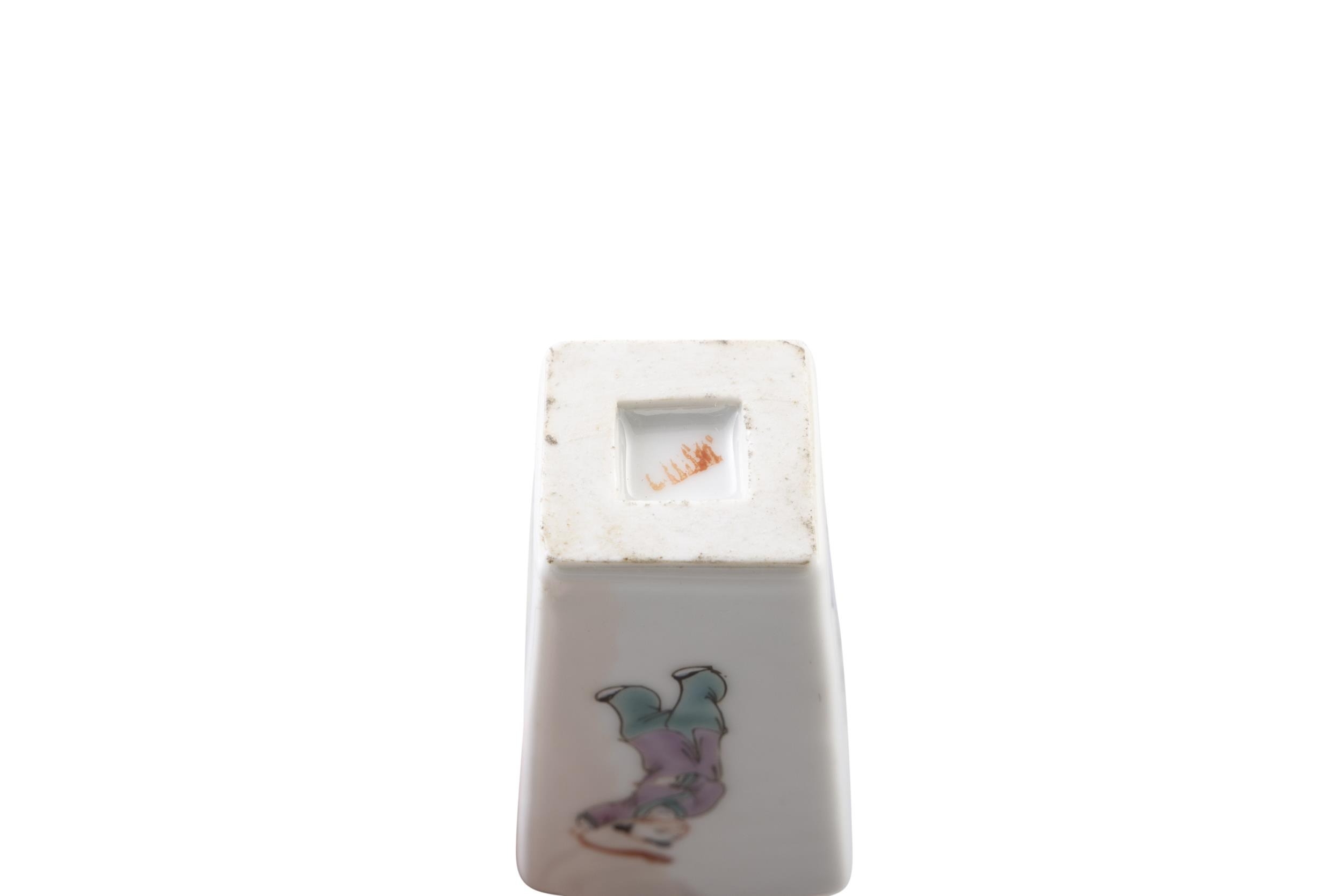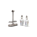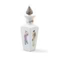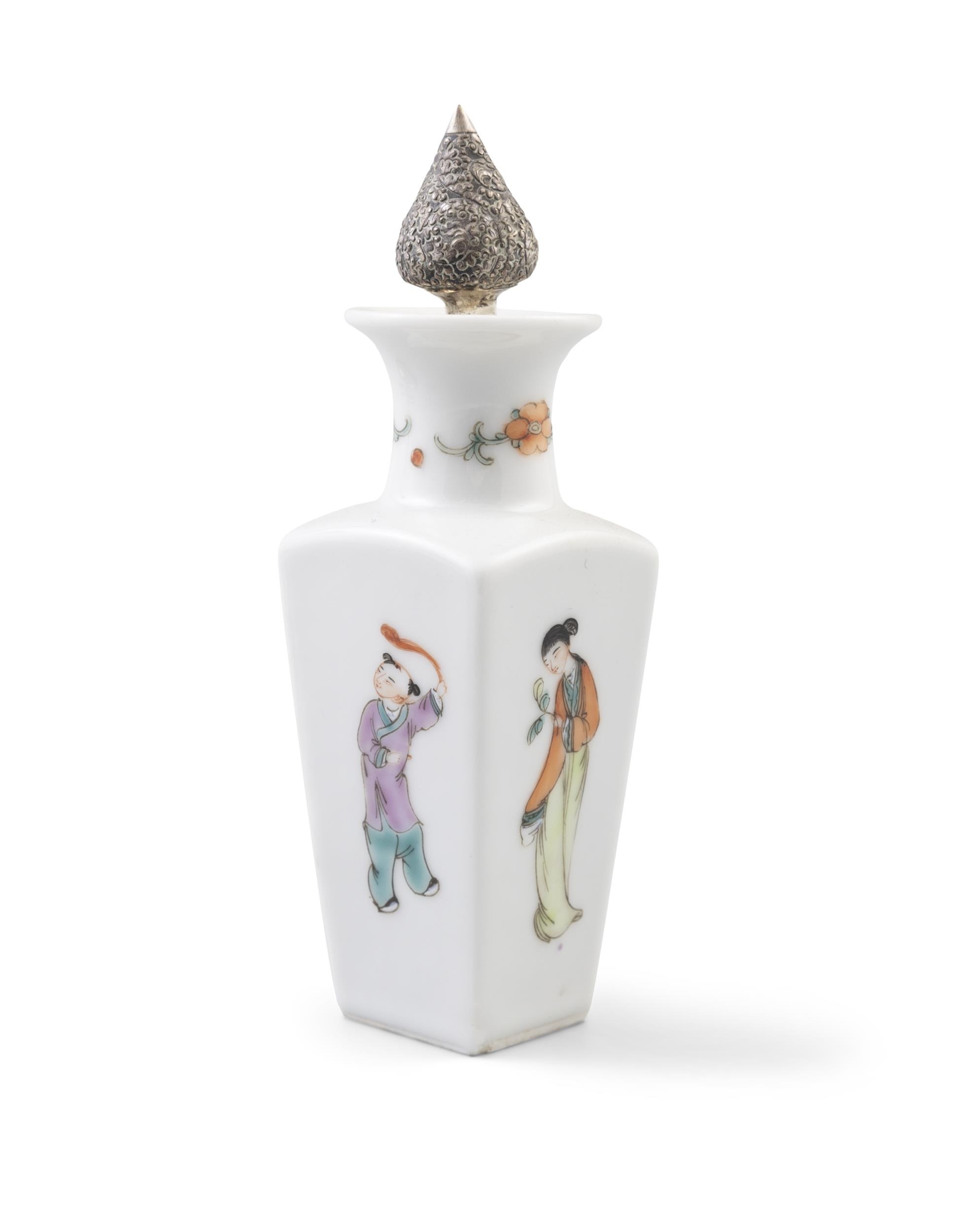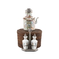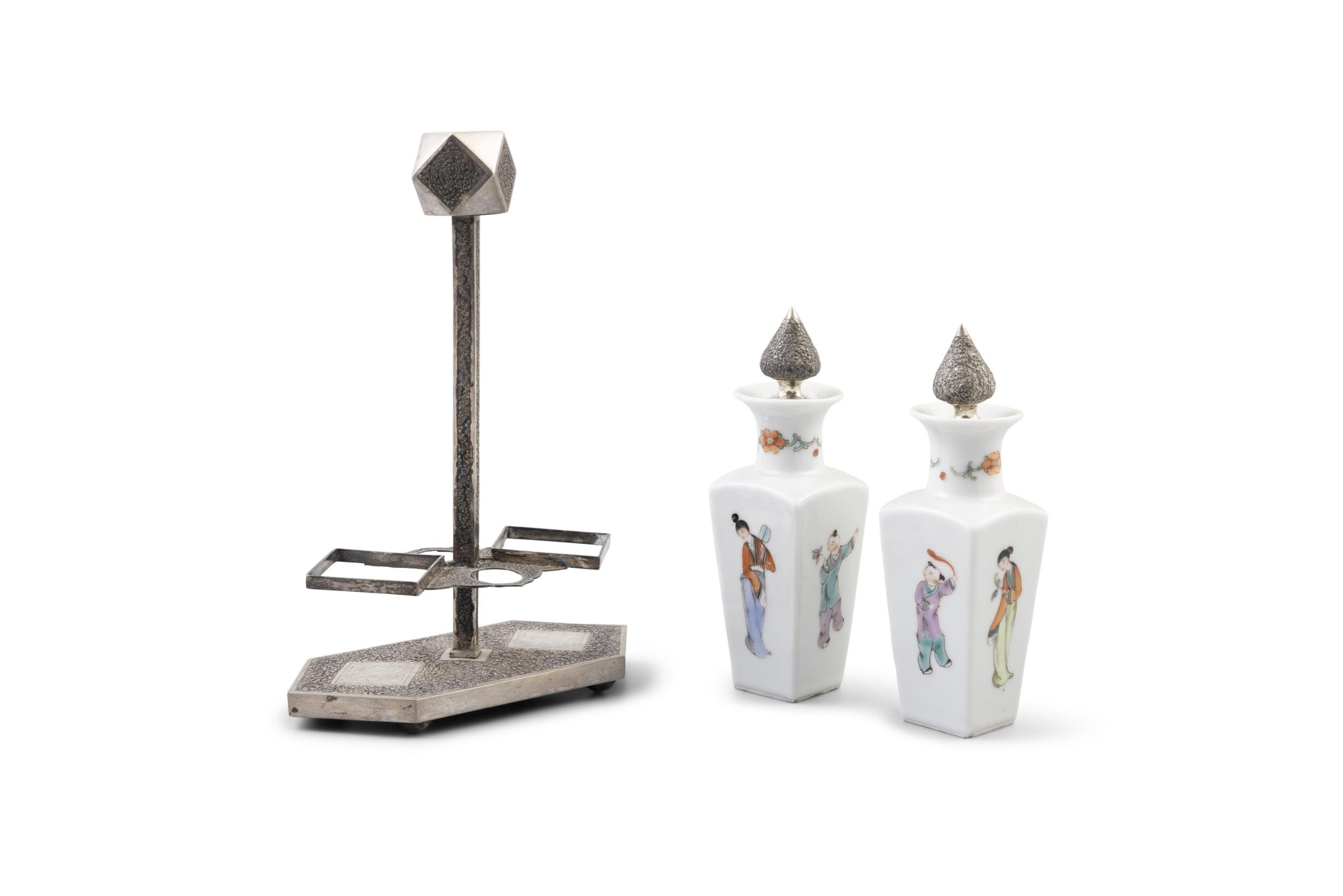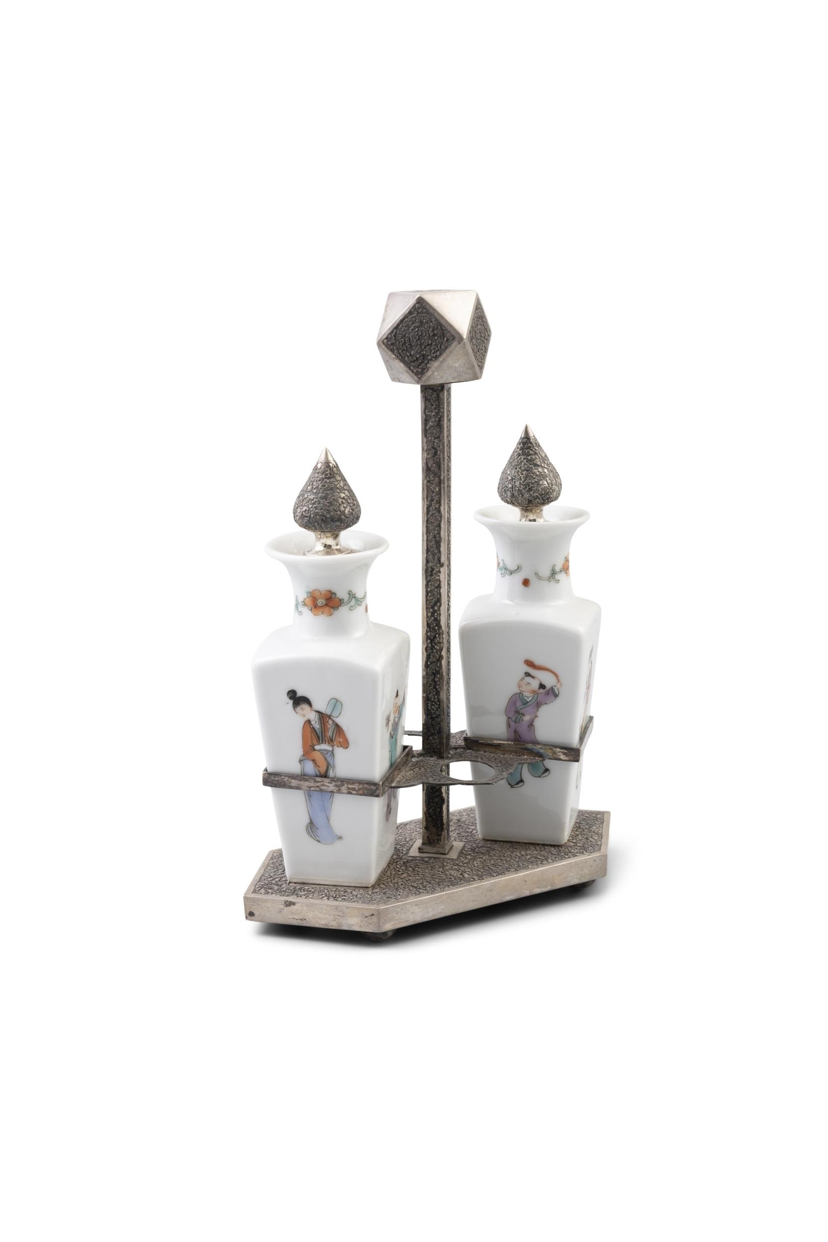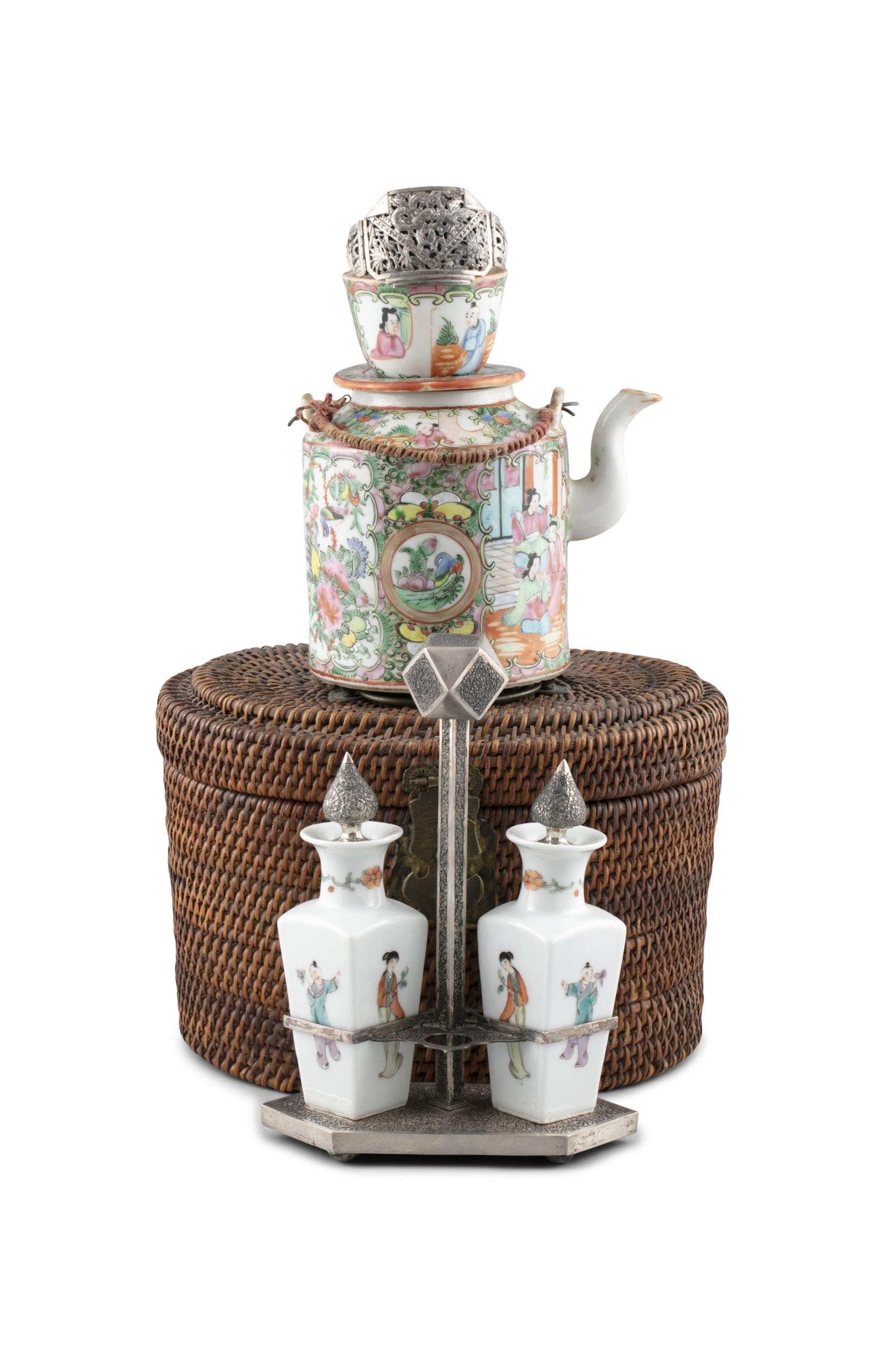 A GROUP OF THREE PORCELAINS, CONSISTING OF A TEAPOT AND CUP IN A WOVEN BOX; A SILVER MOUNTED OIL AND VINEGAR; A SILVER BRACELET China and Vietnam, early 20th century H (the biggest, oil vinegar): 23 cm Gross weight (the silver bracelet together with the oil vinegar mount which is set with a wooden piece): 221 grams (3)