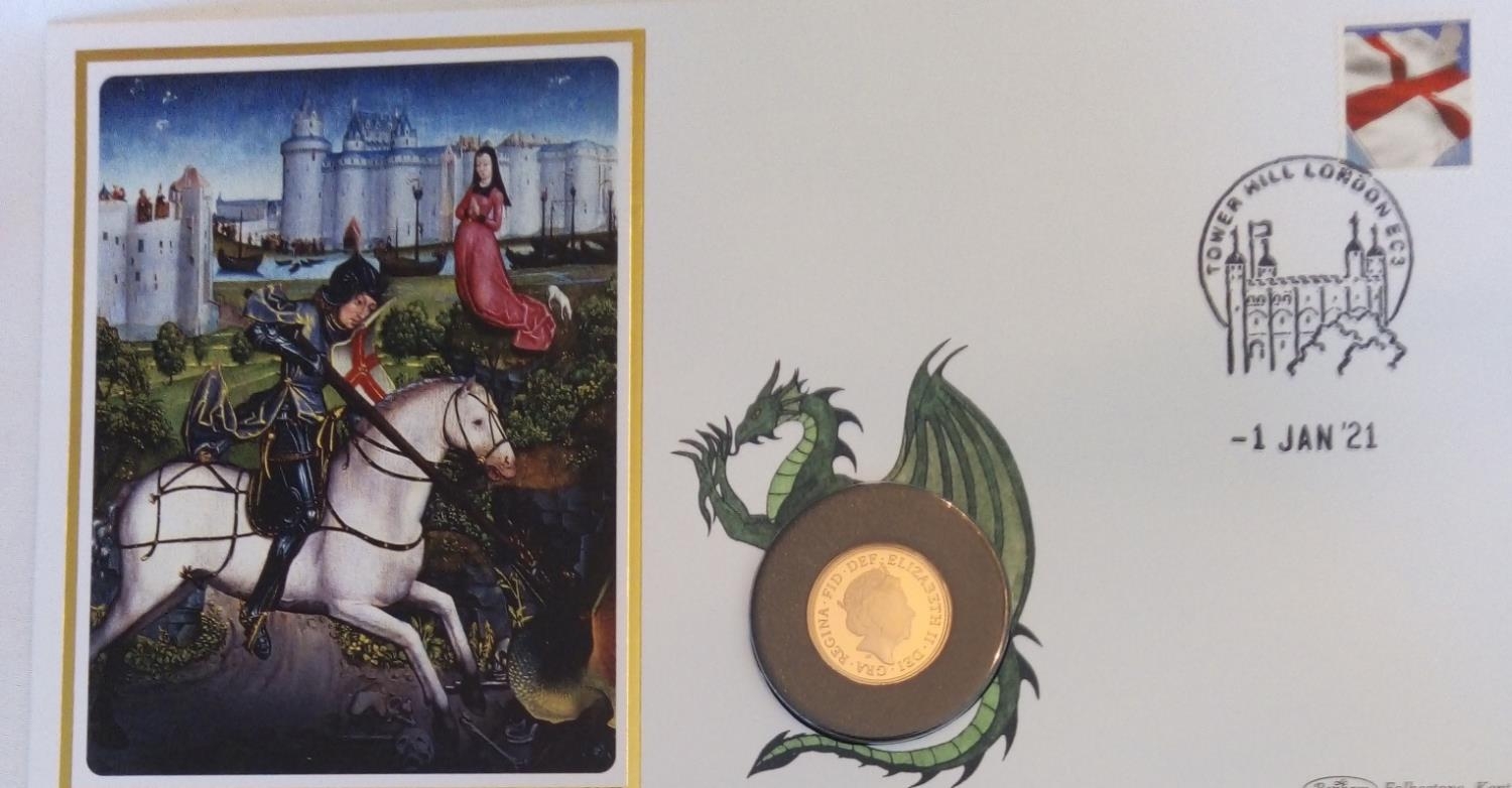 A 22CT GOLD FULL SOVEREIGN PROOF COIN COVER, DATED 2021