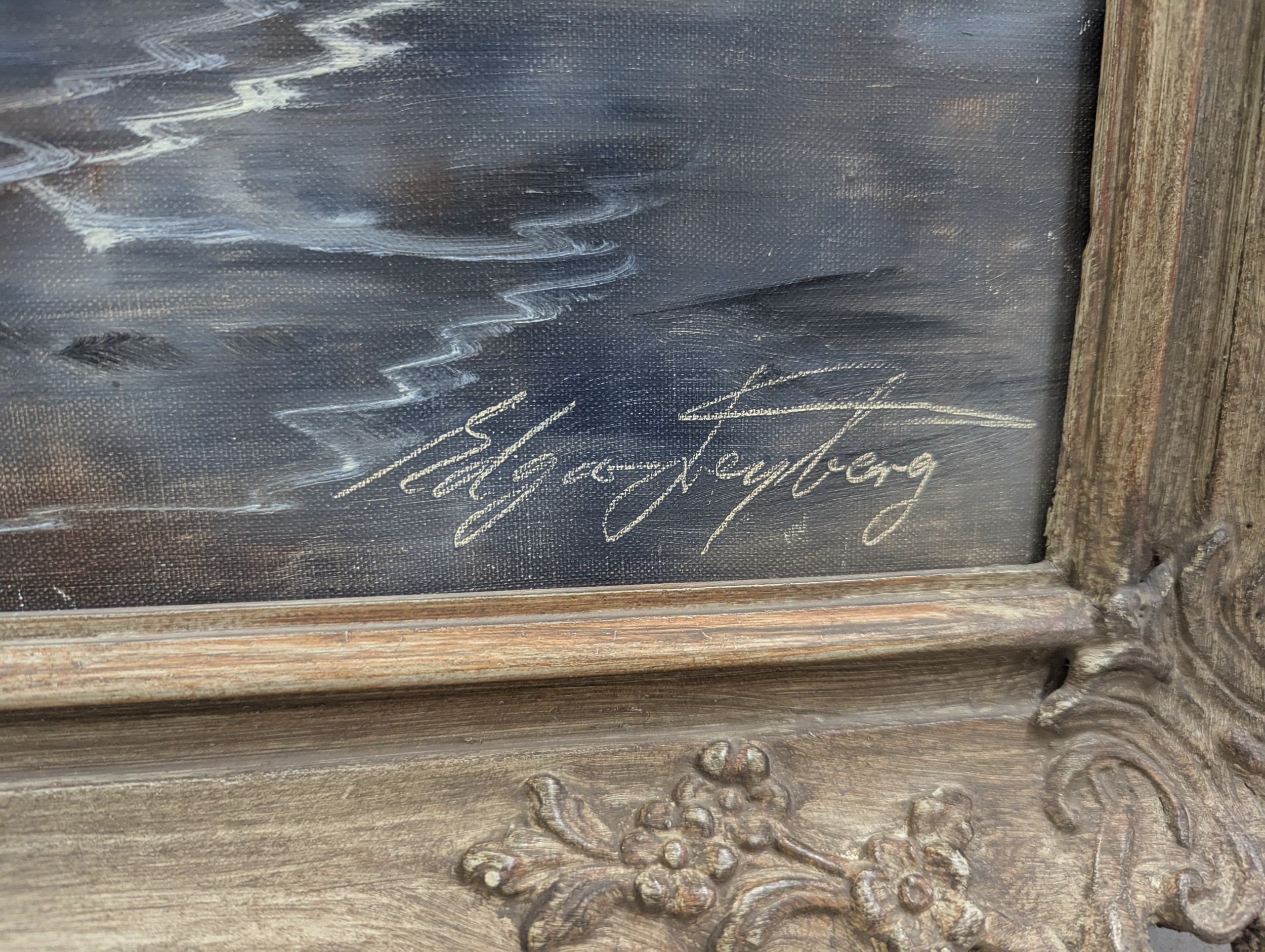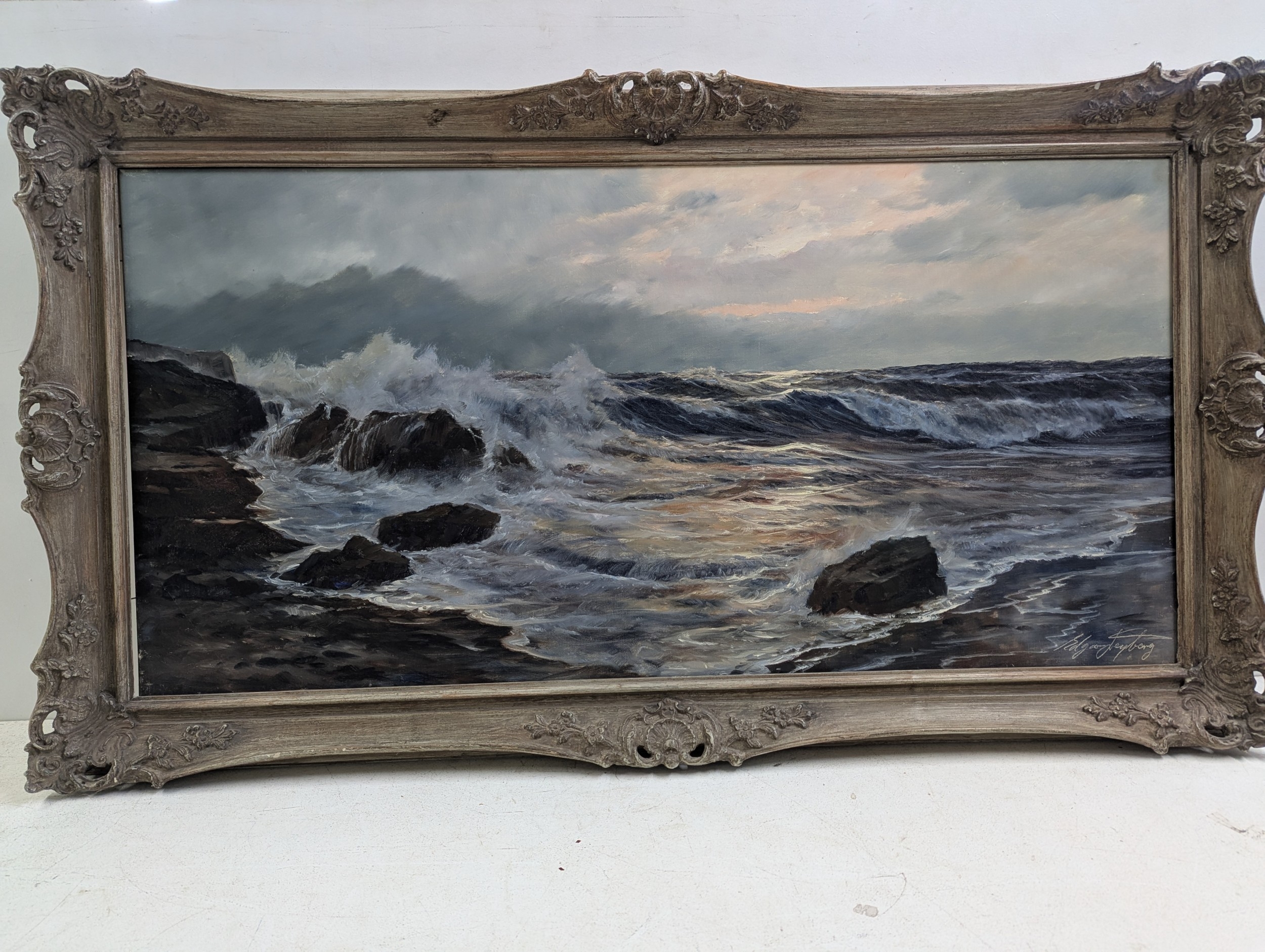 THIS LOT HAS BEEN WITHDRAWN Edgar Freyberg oil on canvas depicting a stormy wild coastline with crashing waves on a rocky shore and a dark sky, canvas size 101 x 50.5, signed to the lower corner